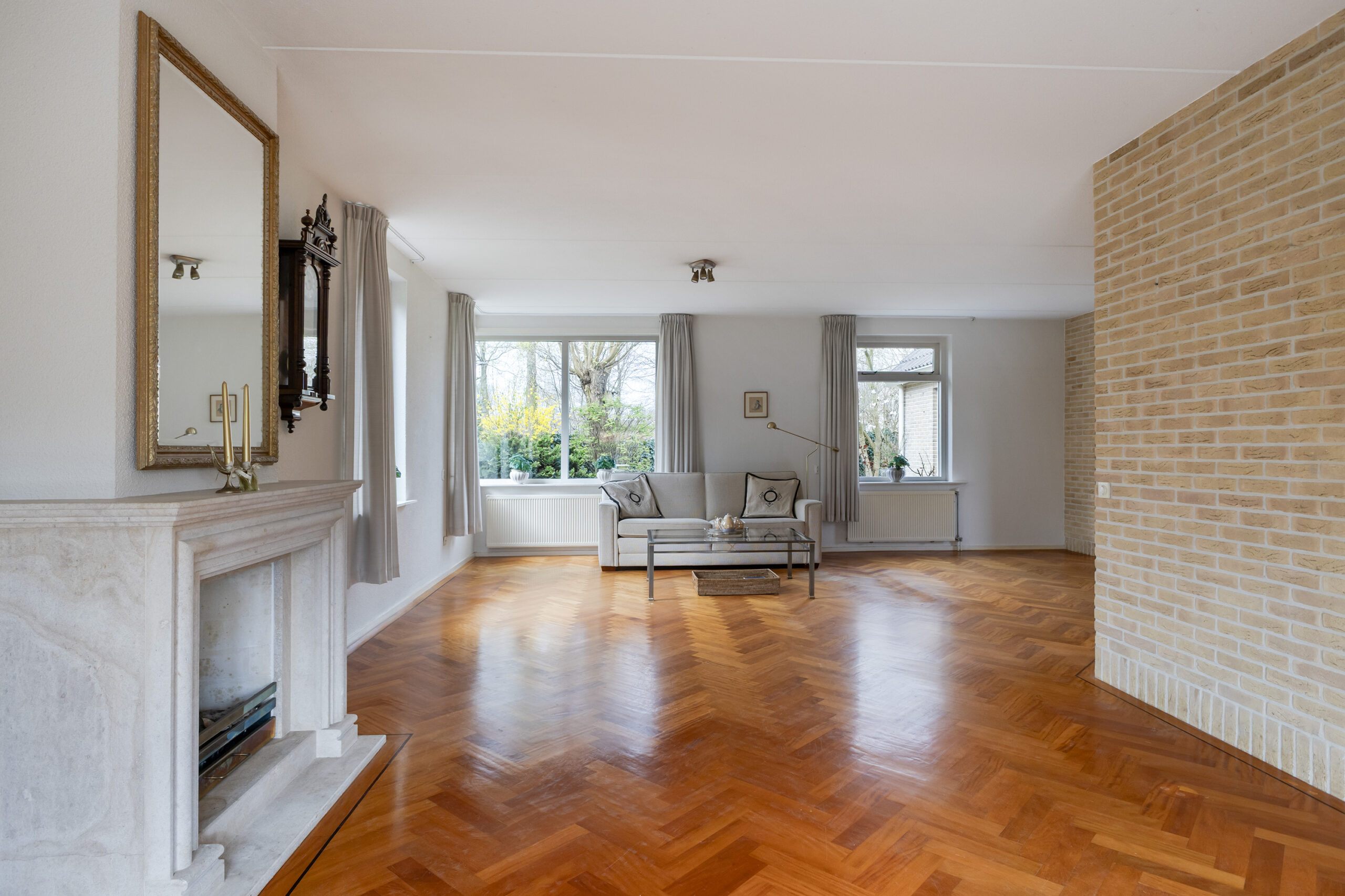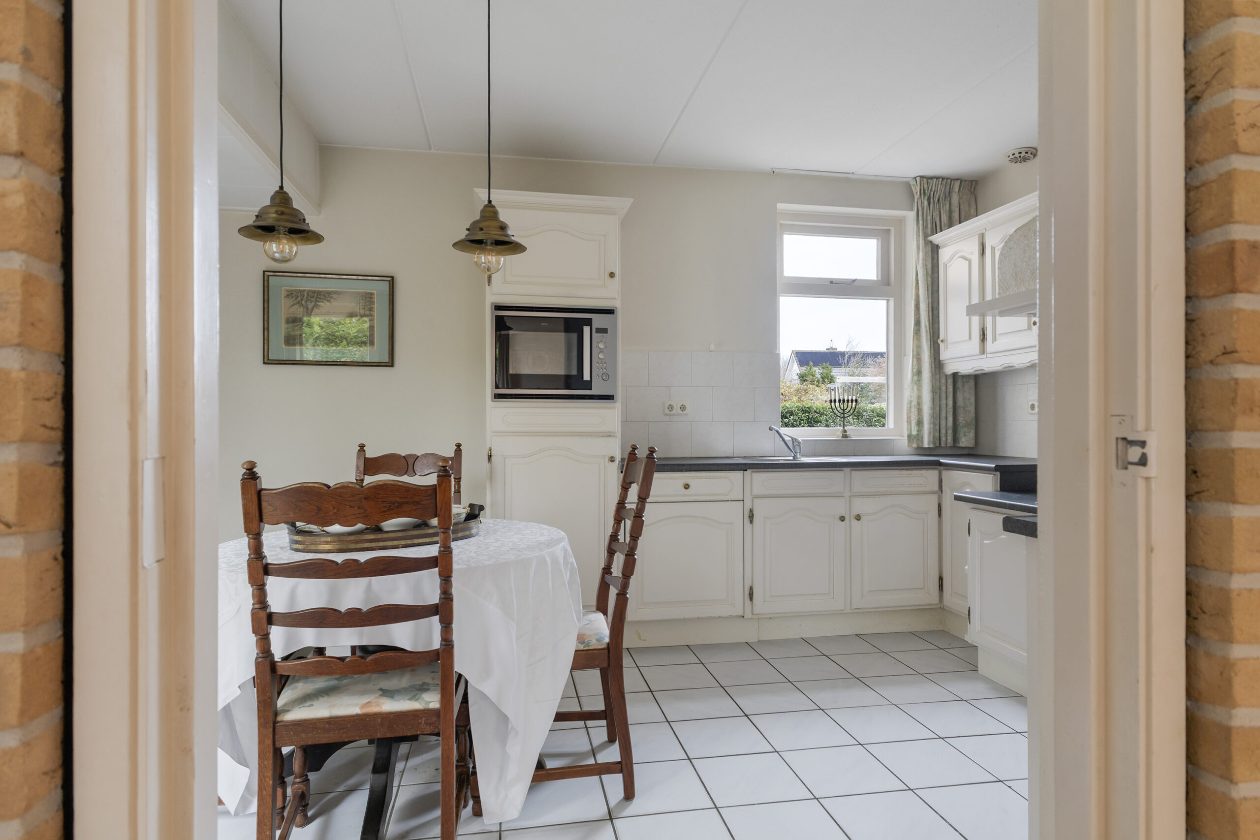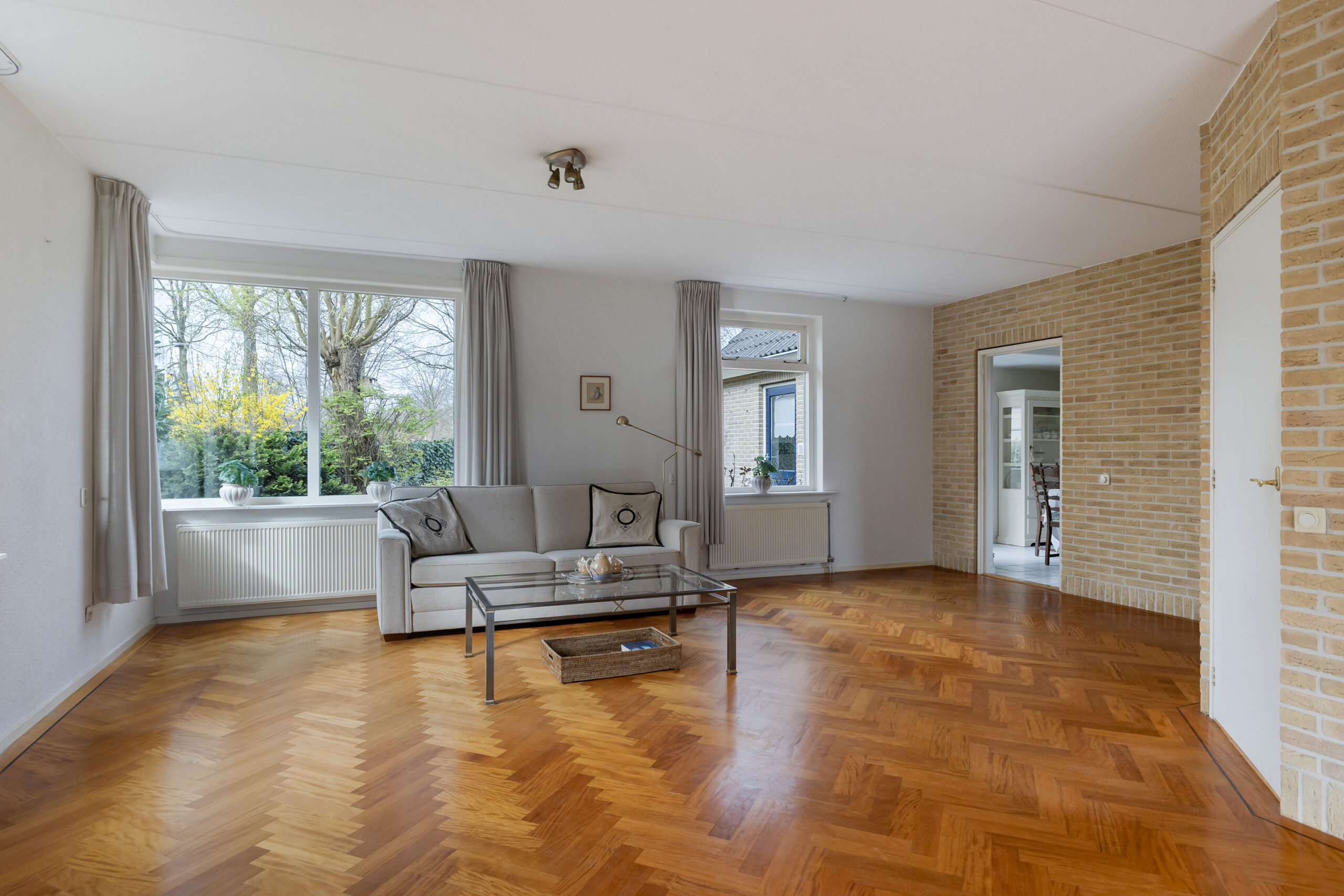 De lichte woonkamer is afgewerkt met een mooie parketvloer en beschikt over een gezellige haard. Aansluitend bevindt zich de hoekkeuken in landelijke stijl, voorzien van diverse inbouwapparatuur.
