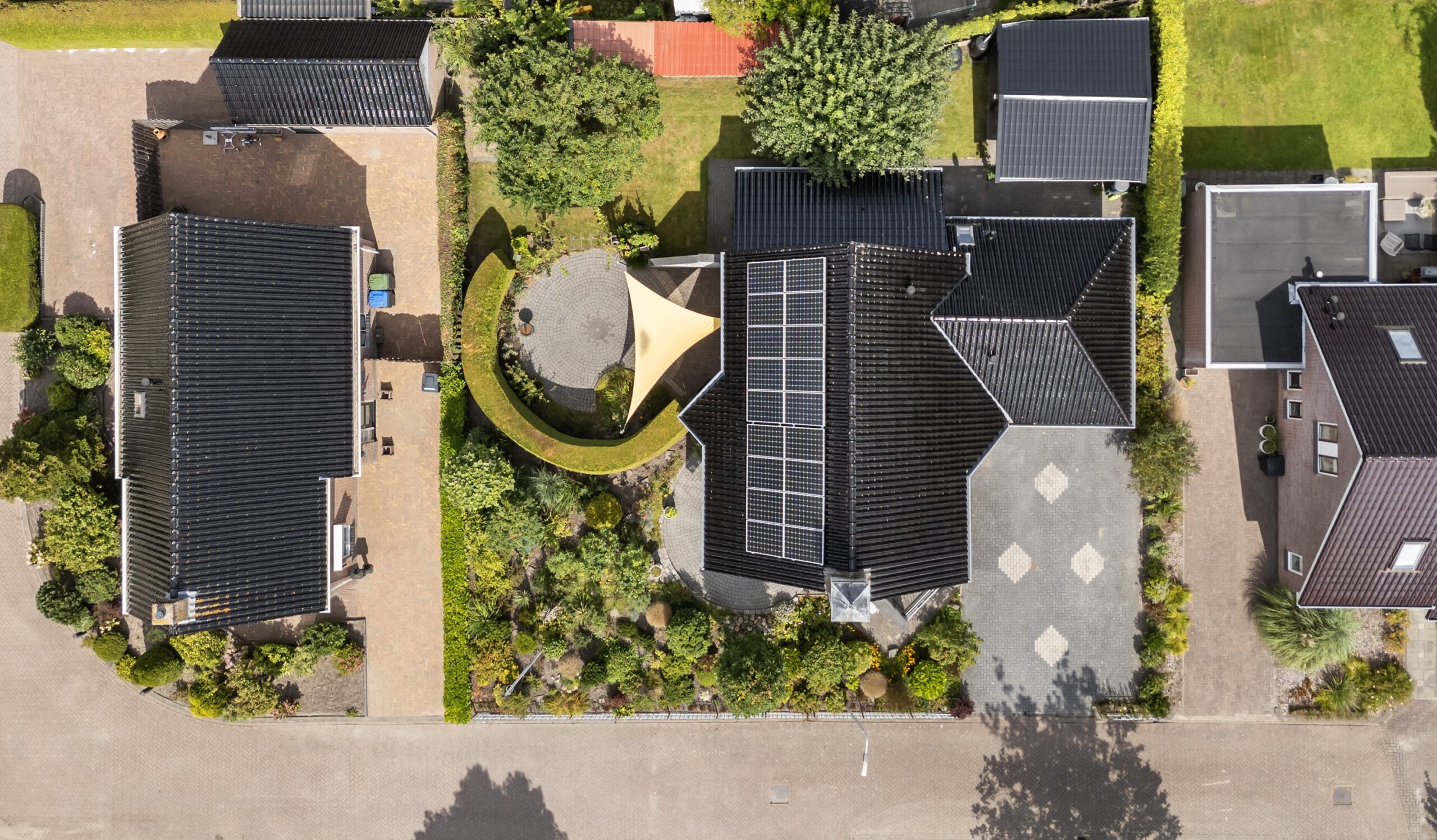 De tuin rondom is fraai aangelegd en biedt altijd wel een plekje in de zon of schaduw. Er zijn meerdere terrassen, een groot grasveld en volop groen, waardoor je hier veel privacy en rust ervaart. Een extra pluspunt is het houten bijgebouw met overkapping, ideaal als berging, hobbyruimte of een gezellige veranda. Op de oprit is voldoende ruimte om meerdere auto’s te parkeren.