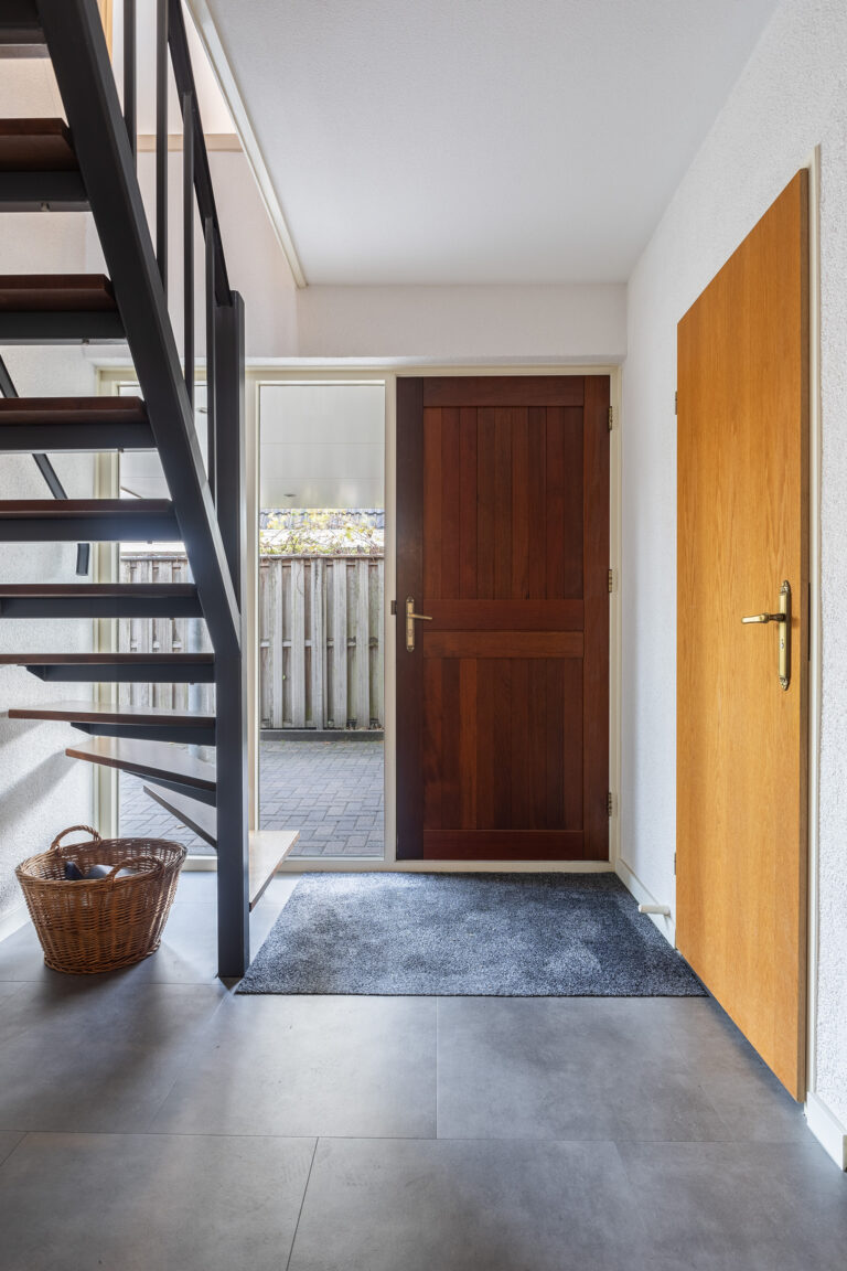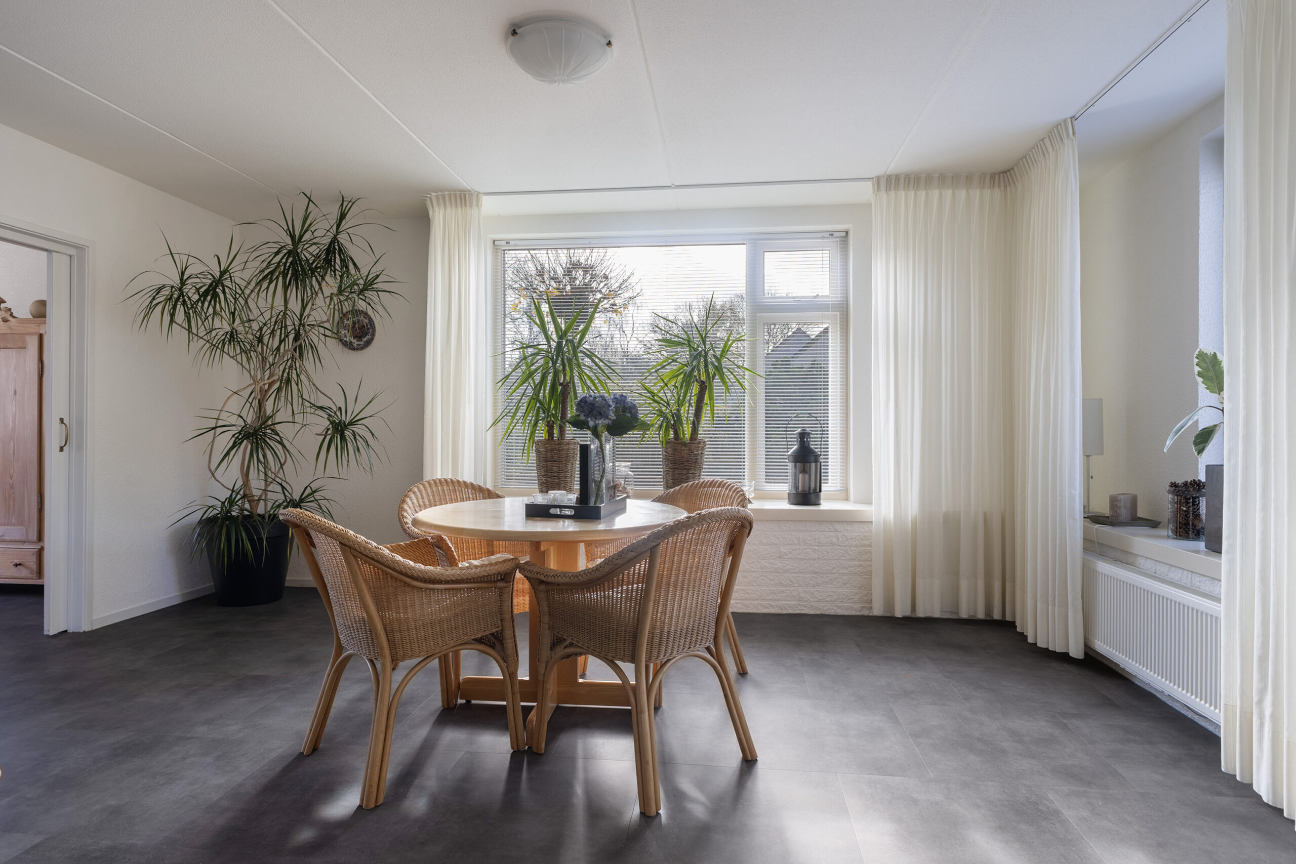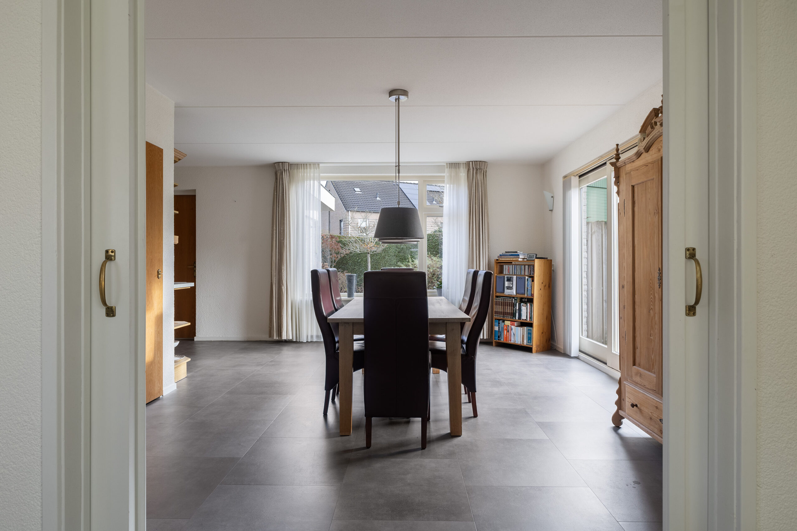 Via de zij-entree met overkapping kom je binnen in de hal met trapopgang, toilet met fonteintje en praktische kastruimte. De lichte woonkamer en eetkamer, van elkaar af te sluiten middels een schuifdeur,, vormen samen een aangename leefruimte met zicht op de tuin.