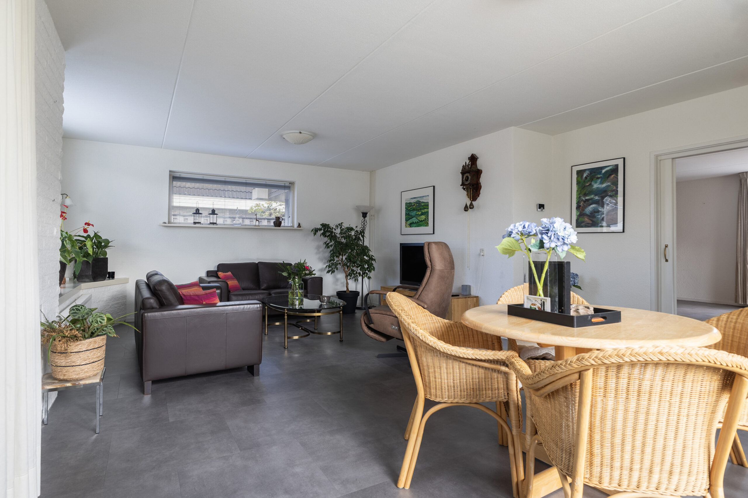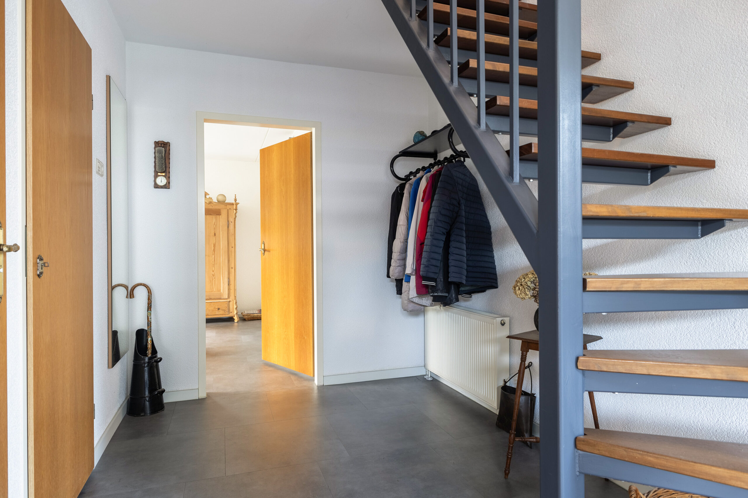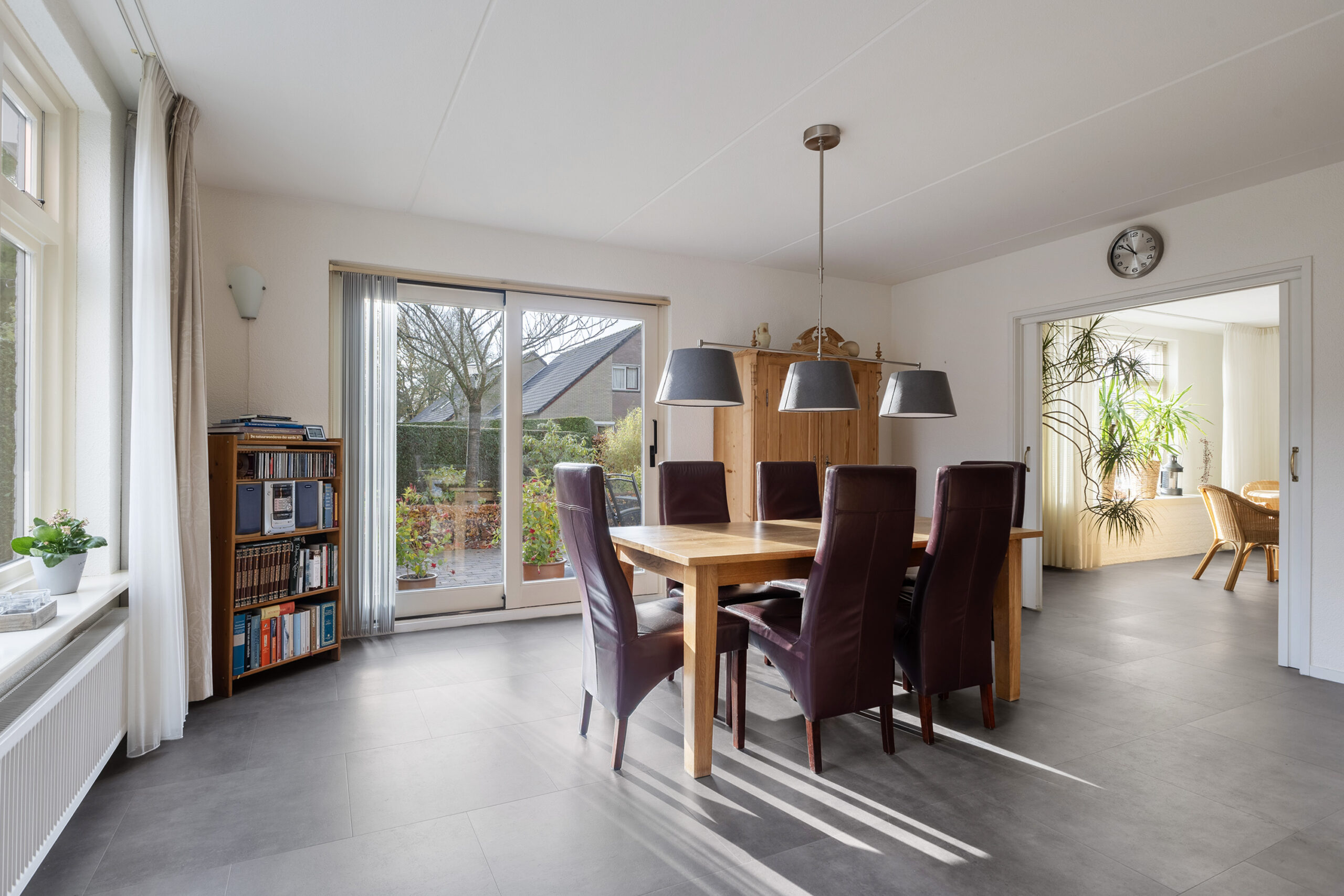 Via de zij-entree met overkapping kom je binnen in de hal met trapopgang, toilet met fonteintje en praktische kastruimte. De lichte woonkamer en eetkamer, van elkaar af te sluiten middels een schuifdeur,, vormen samen een aangename leefruimte met zicht op de tuin.