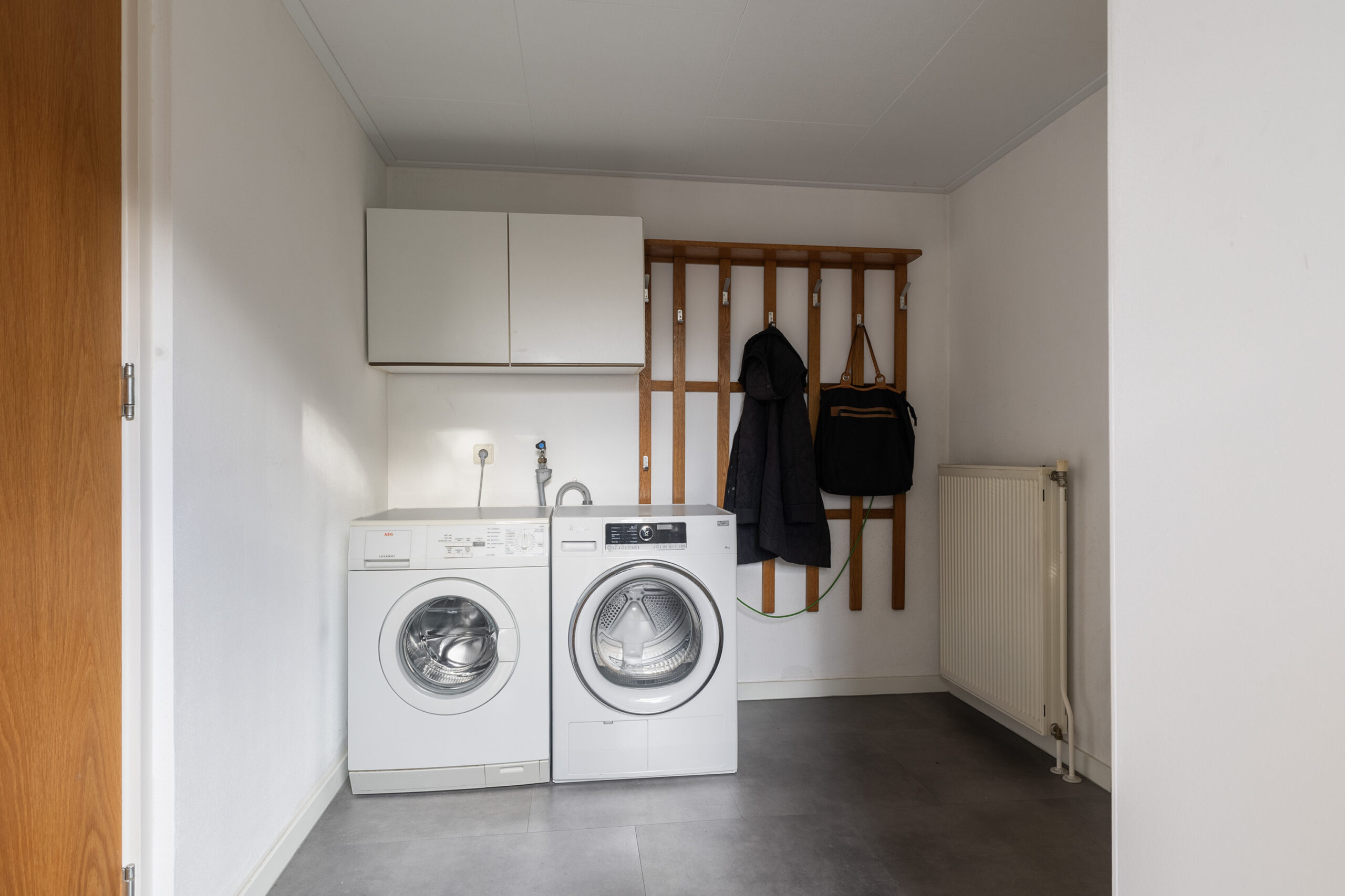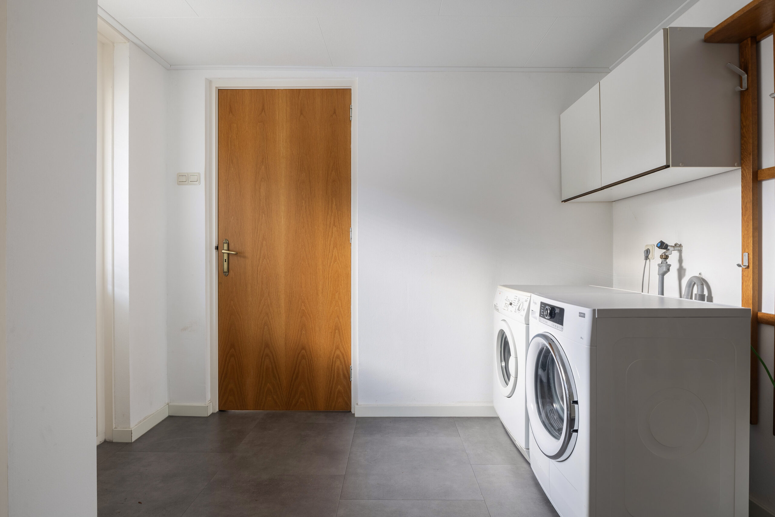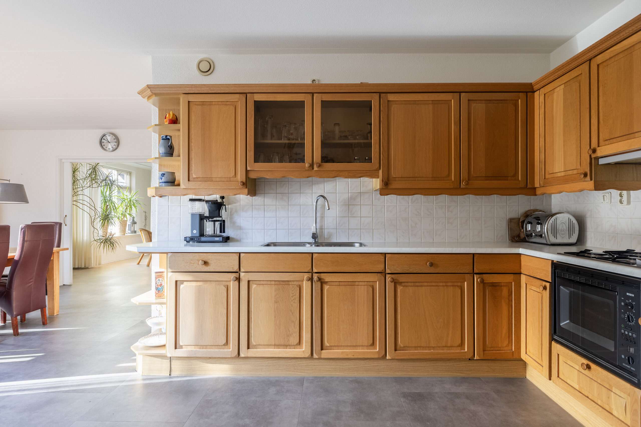 De open keuken in hoekopstelling staat in verbinding tussen eetkamer en de bijkeuken. Vanuit de bijkeuken bereik je zowel de achtertuin als de ruime garage (ca. 30 m²).