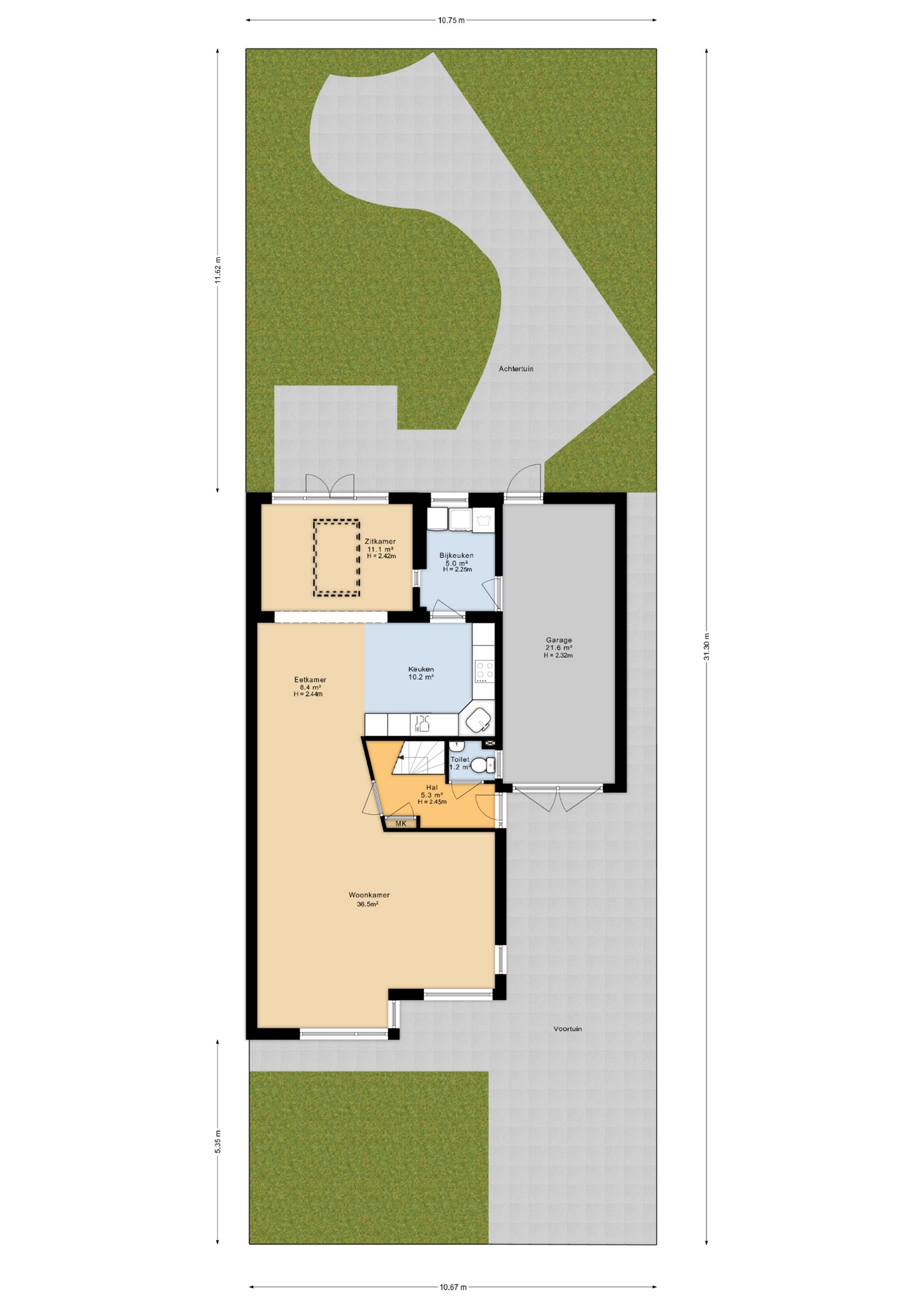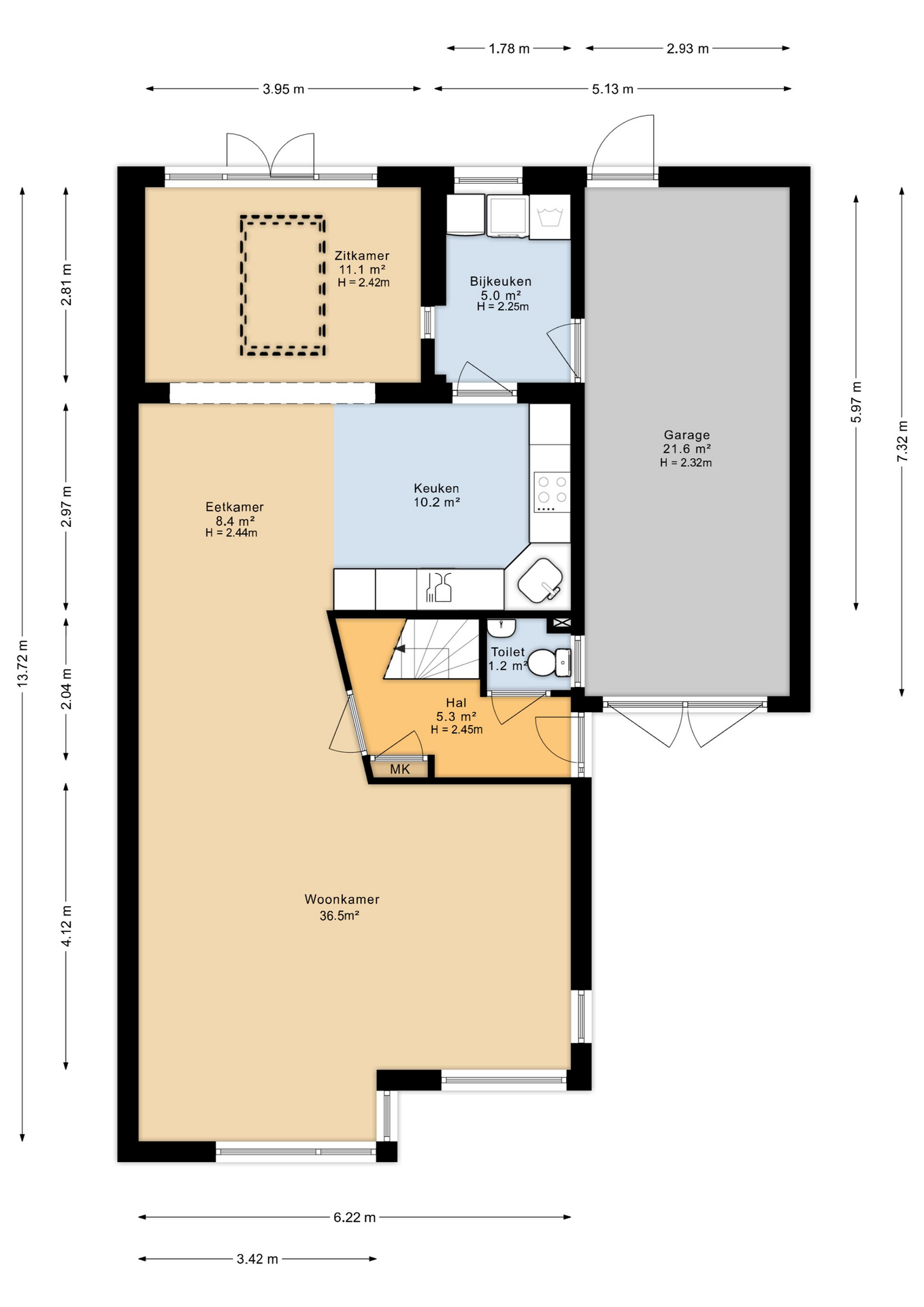 Begane grond: Via de zijentree kom je in de hal met meterkast, toilet met fonteintje en de trap naar de verdieping. De royale woonkamer met eetkamer biedt voldoende leefruimte. Daarnaast is er een aparte zitkamer met openslaande deuren naar de tuin – ideaal voor een rustige leeshoek of speelkamer. De keuken in hoekopstelling is voorzien van diverse inbouwapparatuur waaronder een kookplaat, oven, koel-vriescombinatie en vaatwasser. Aansluitend vind je de bijkeuken met witgoed aansluitingen en toegang tot de garage.