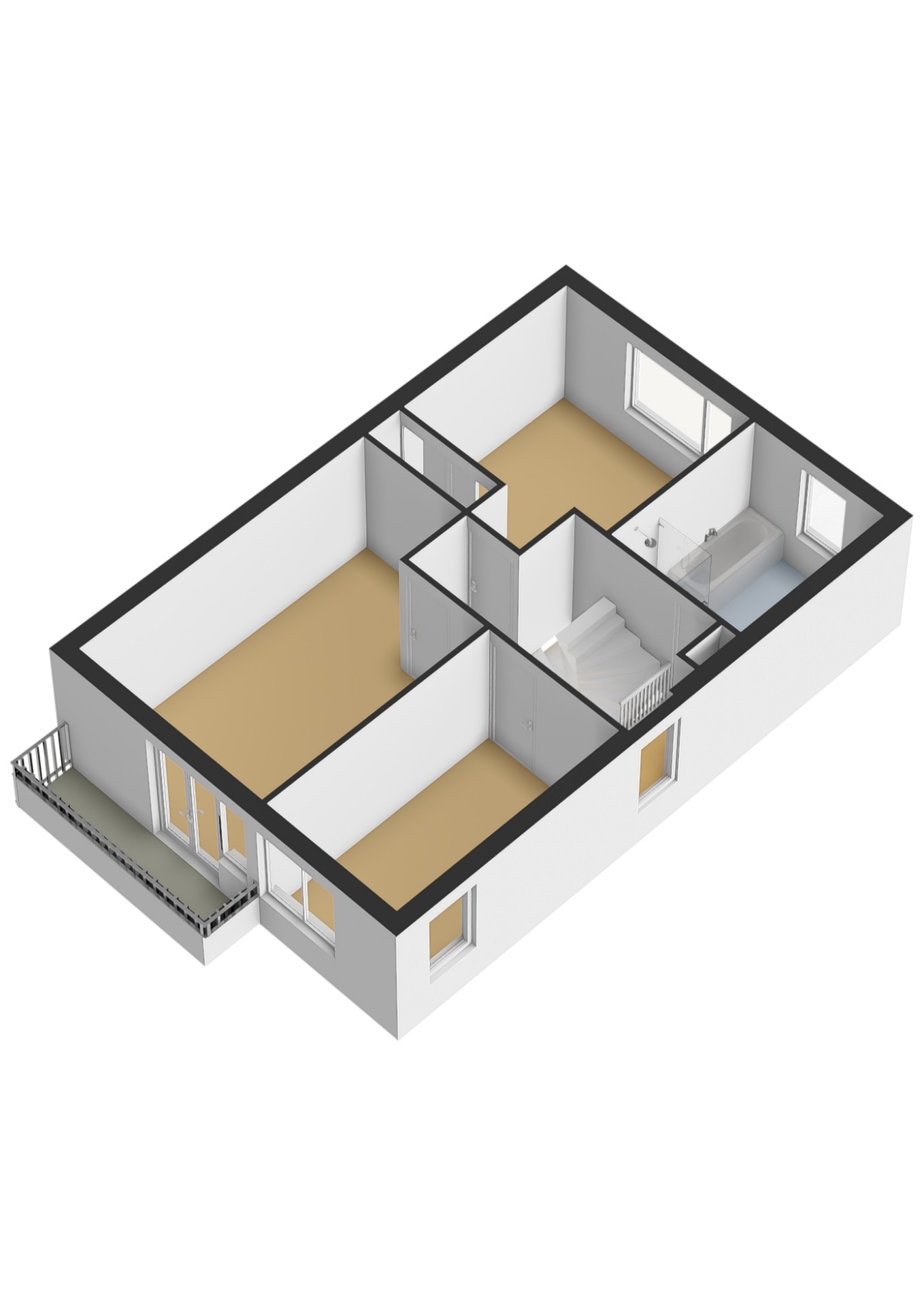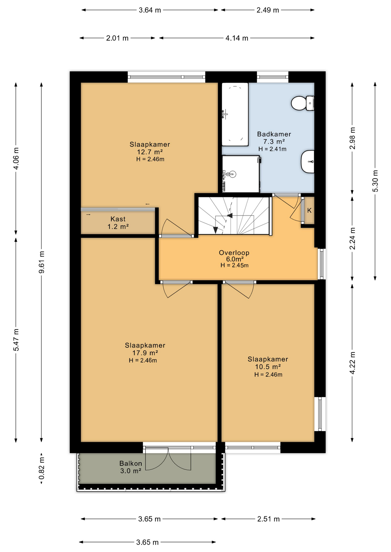 Eerste verdieping: Op de overloop bevindt zich een bergkast. Er zijn drie slaapkamers waarvan de grootste beschikt over een balkon. De badkamer is uitgerust met een ligbad, douche, wastafelmeubel en toilet.