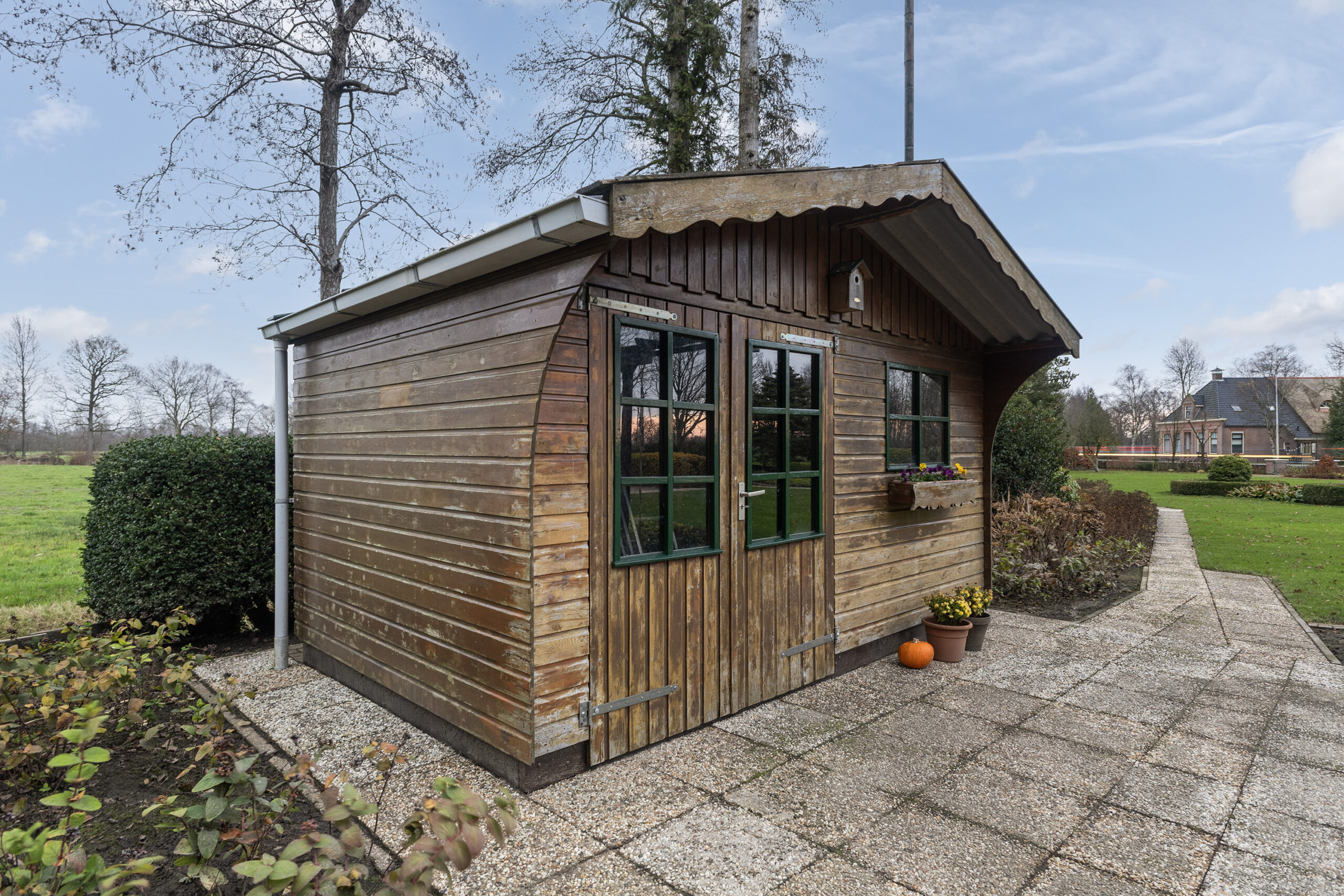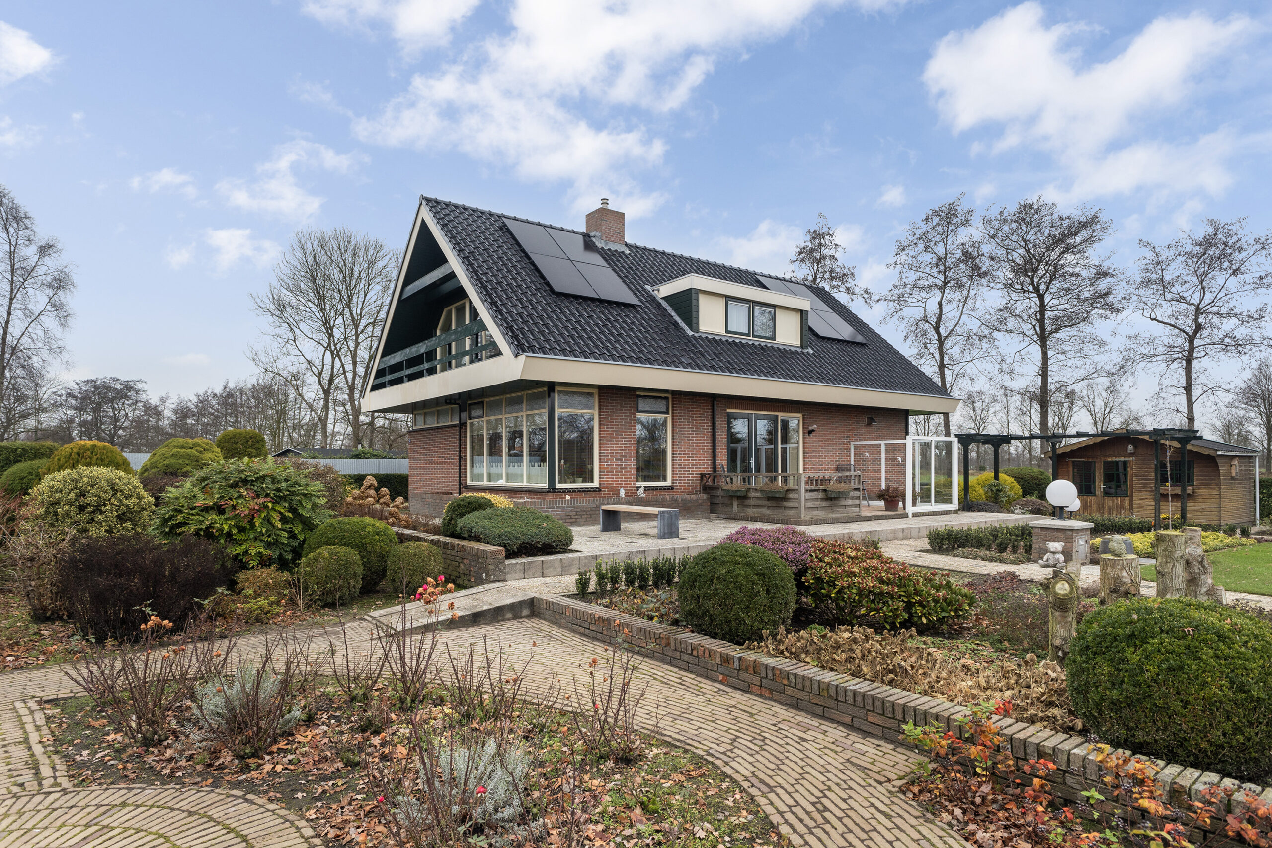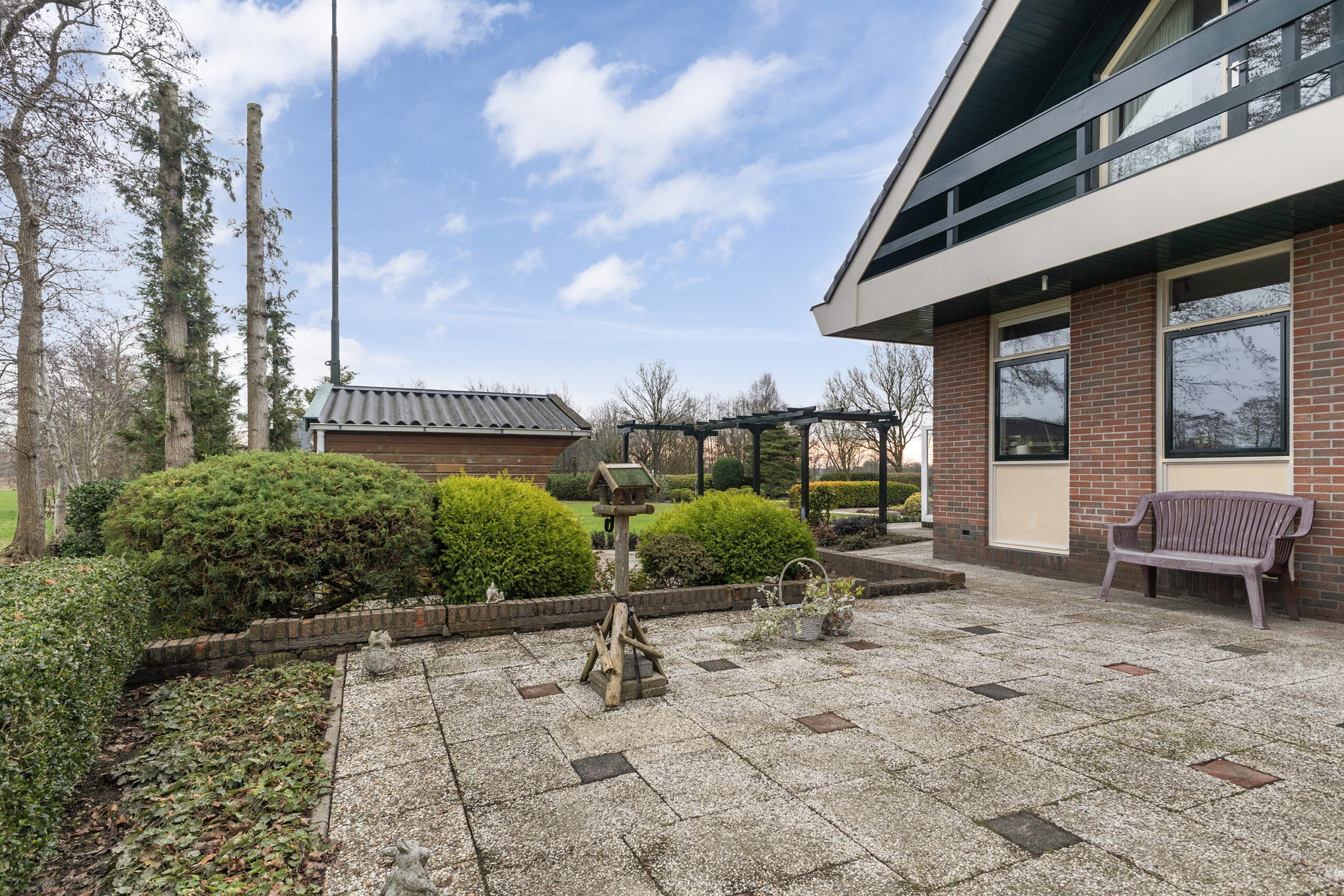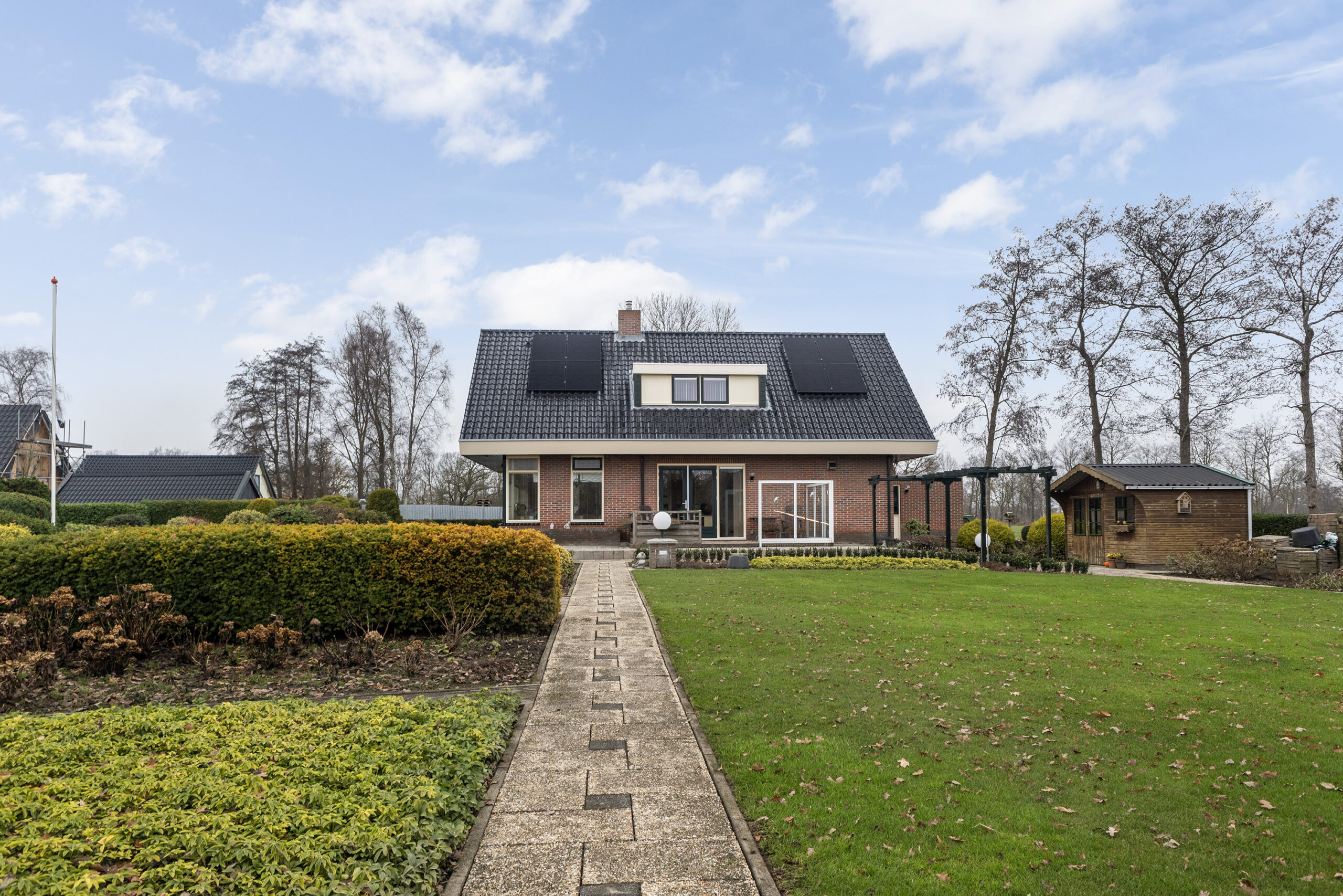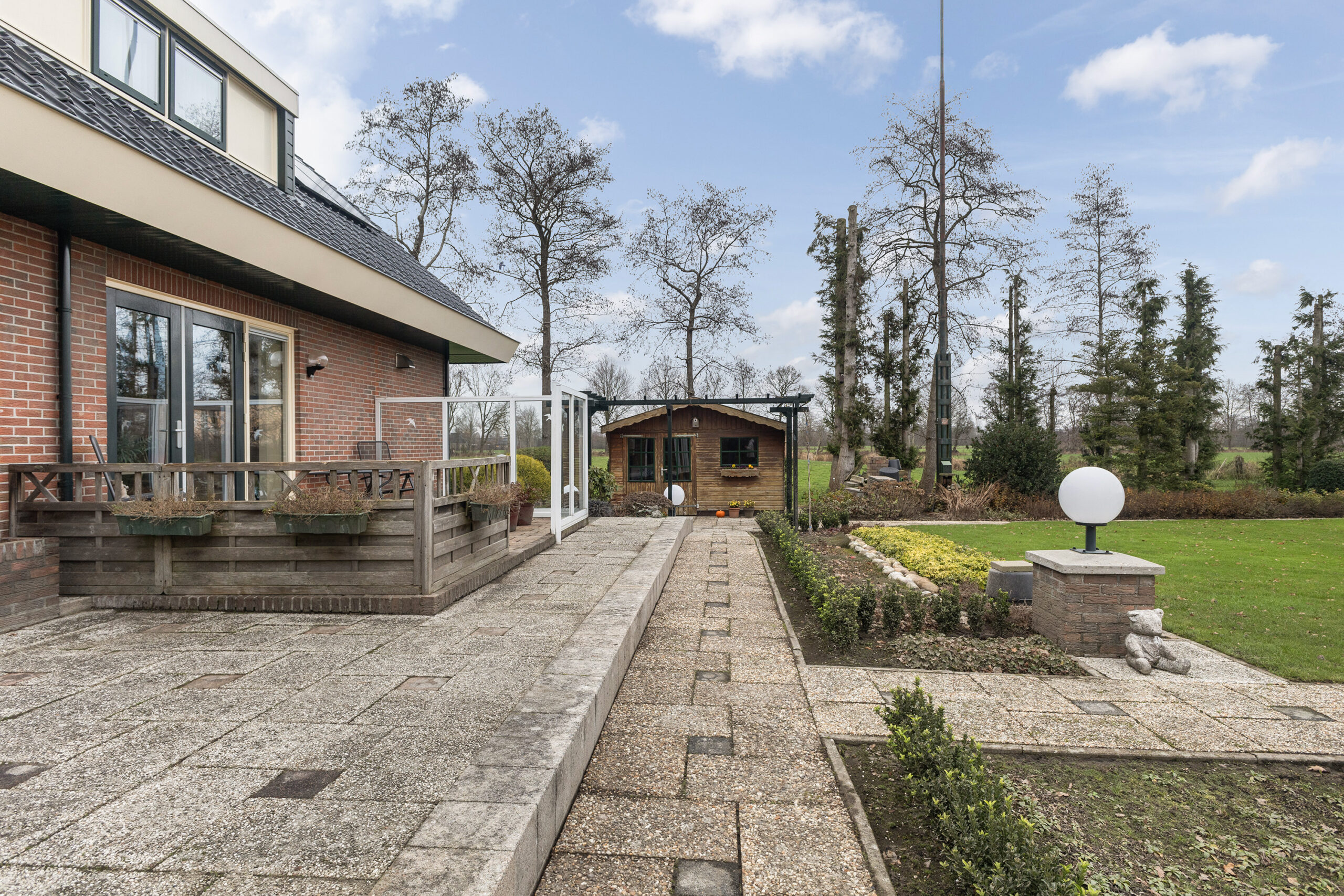De fraai aangelegde tuin rondom de woning is voorzien van een houten tuinhuisje en meerdere terrassen. Hier geniet je elke dag van rust, ruimte en het vrije uitzicht.