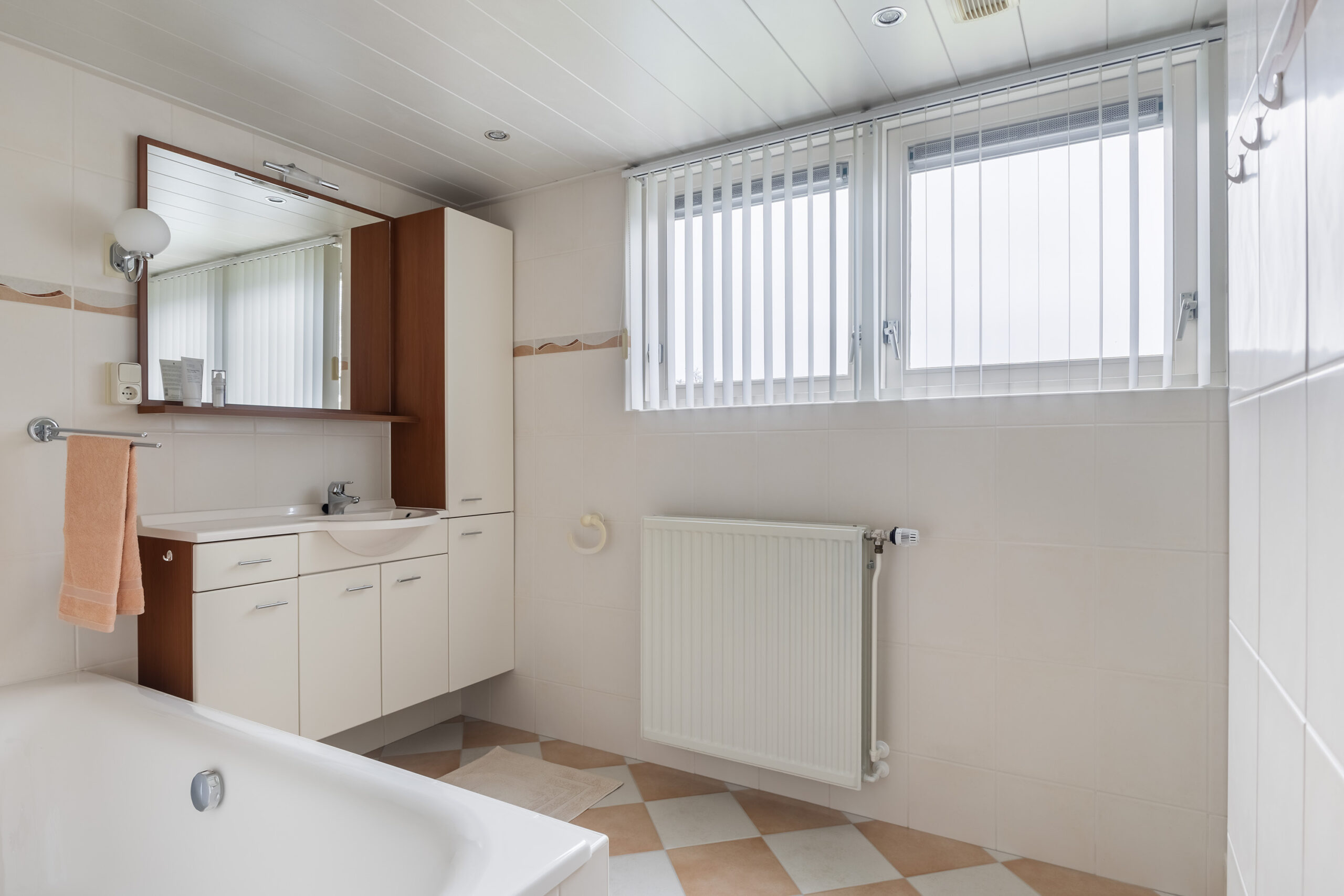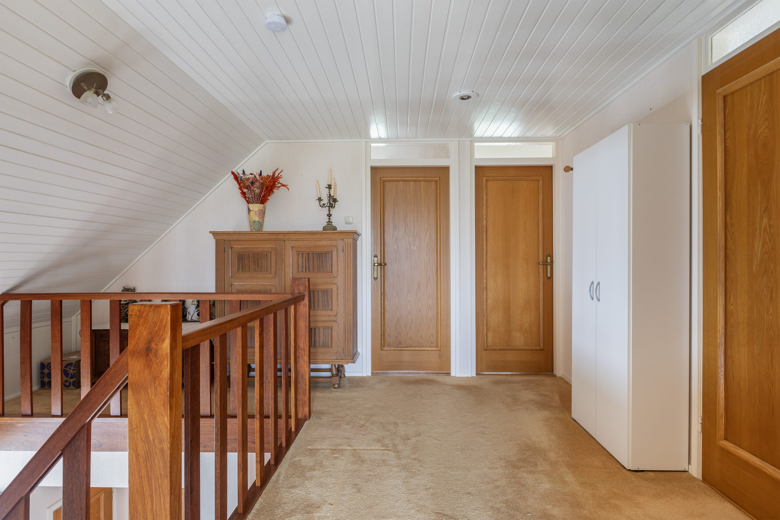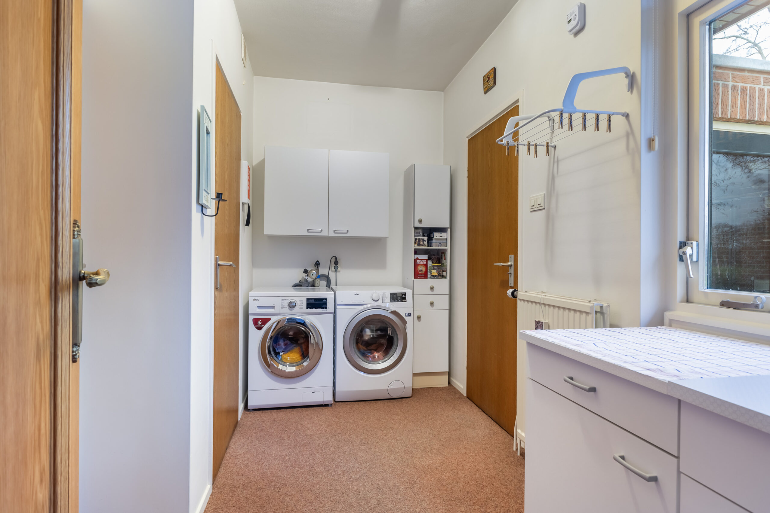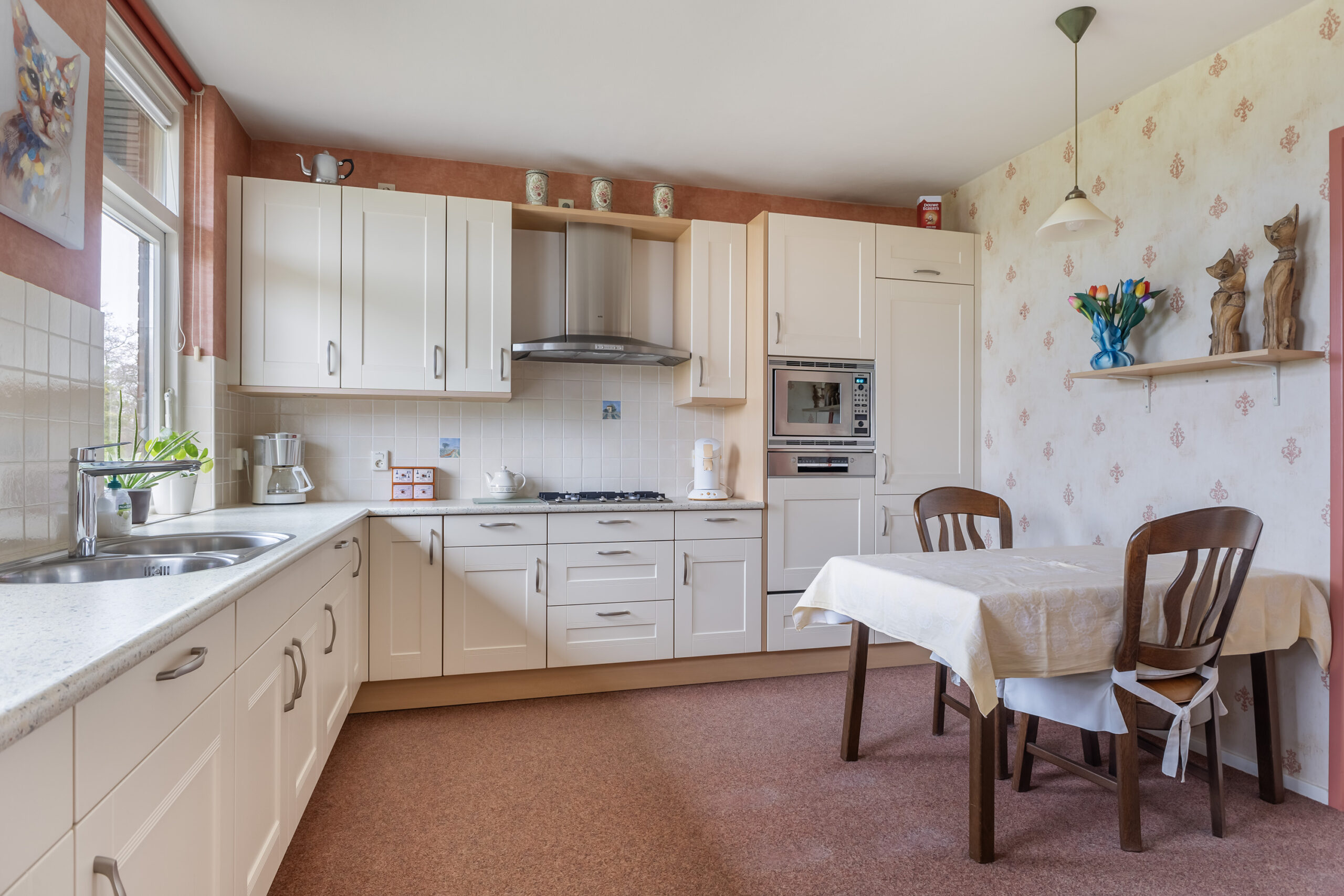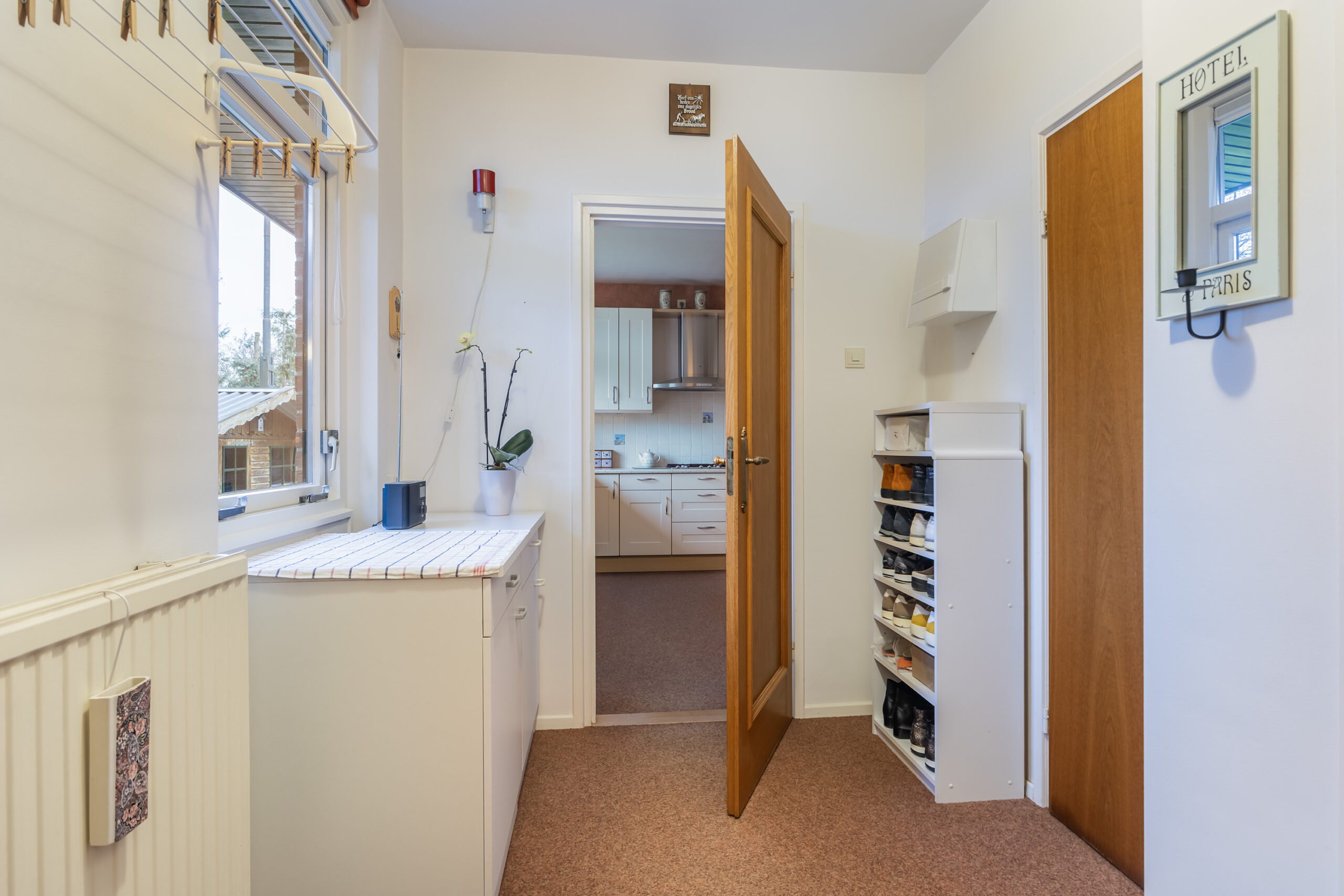 Begane grond: royale entree/hal met vide, meterkast, toilet, bergkast en trap naar boven. Gezellige woonkamer met gashaard en openslaande deuren naar de tuin. De hoekkeuken is voorzien van diverse inbouwapparatuur en grenst aan een praktische bijkeuken met witgoedaansluitingen, bergruimte en toegang tot de kelder. Vanuit de bijkeuken bereik je de garage.