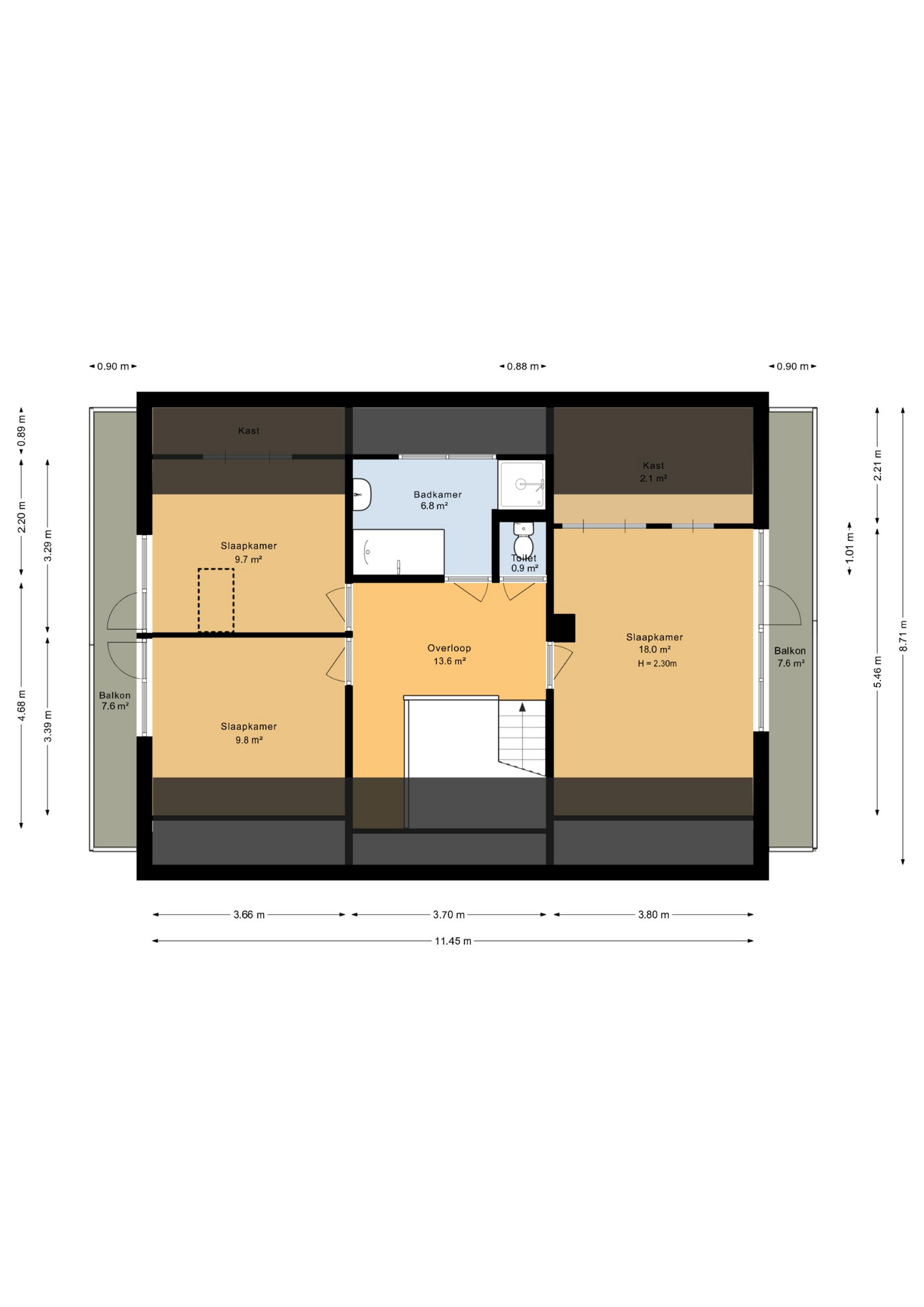 Eerste verdieping: ruime overloop, drie slaapkamers (allemaal met toegang tot een balkon), bergruimte, nette badkamer met ligbad, douche en wastafelmeubel, plus een separaat toilet.