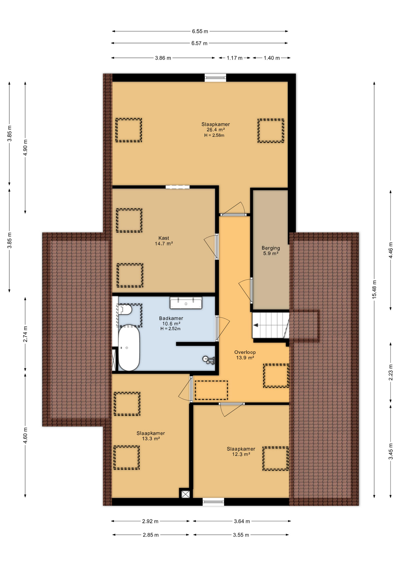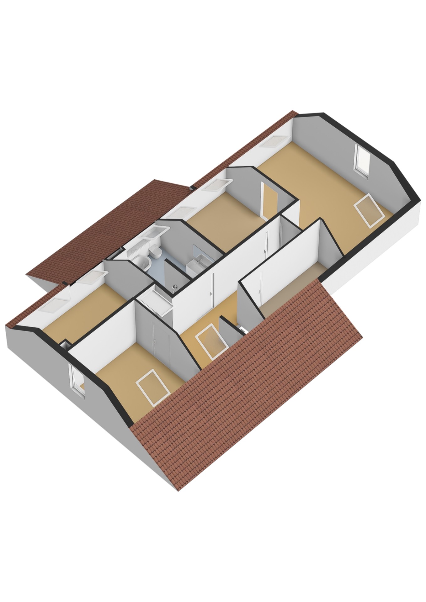 Op de verdieping zijn drie slaapkamers aanwezig, waaronder een ruime master bedroom met een grote inloopkast. De badkamer is hier gesitueerd en sluit naadloos aan op het hoge afwerkingsniveau van de rest van de woning.