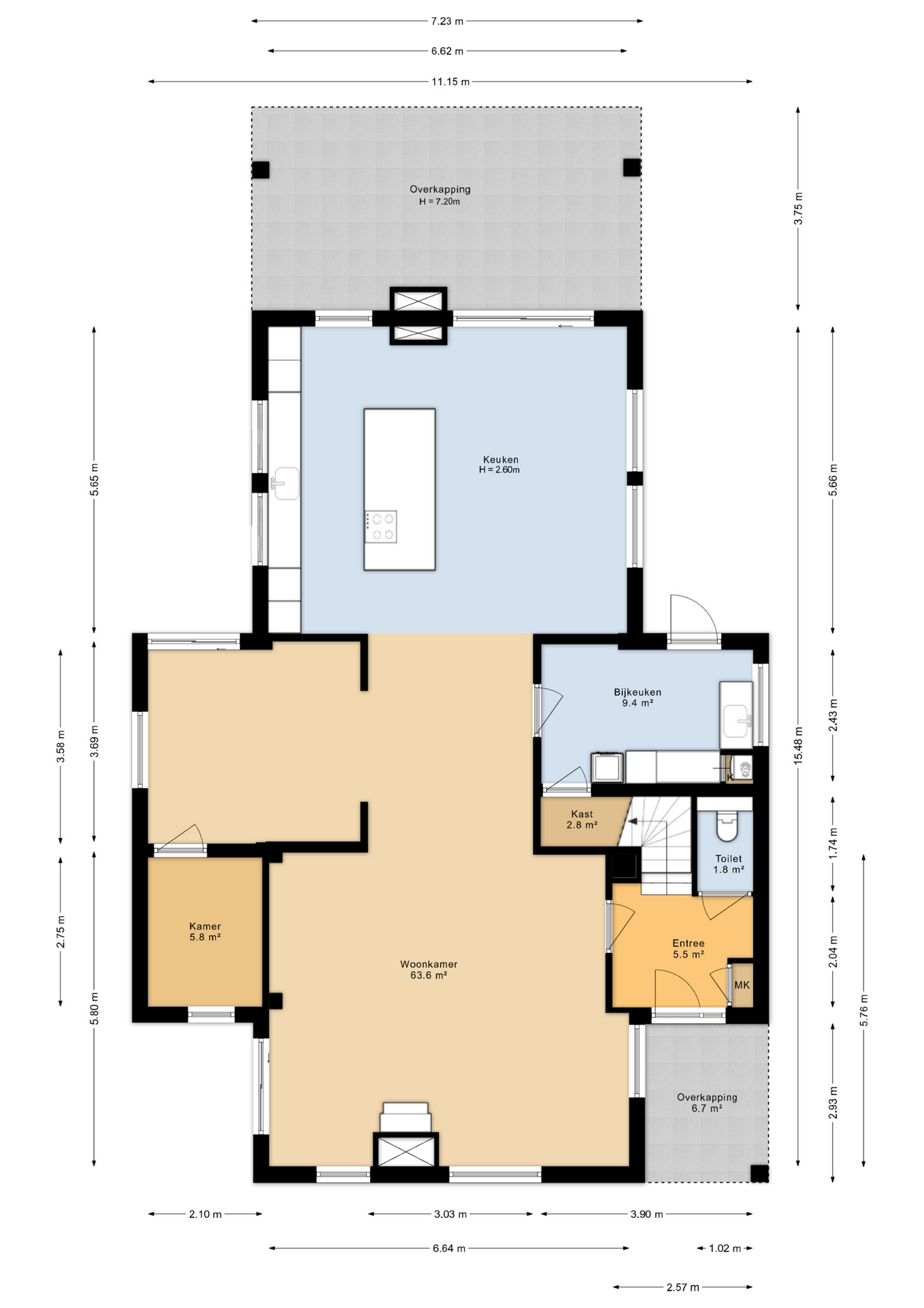 De begane grond biedt een royale leefomgeving met een woonkamer van circa 64 m² en een woonkeuken van circa 40 m², voorzien van een centraal kookeiland. Vanuit de keuken is er middels een schuifpui directe toegang tot het terras. Daarnaast is er een separate kamer aanwezig die uitstekend dienst kan doen als kantoor of werkruimte. Verder bevinden zich hier een volledig vernieuwde bijkeuken en een modern afgewerkte toiletruimte.