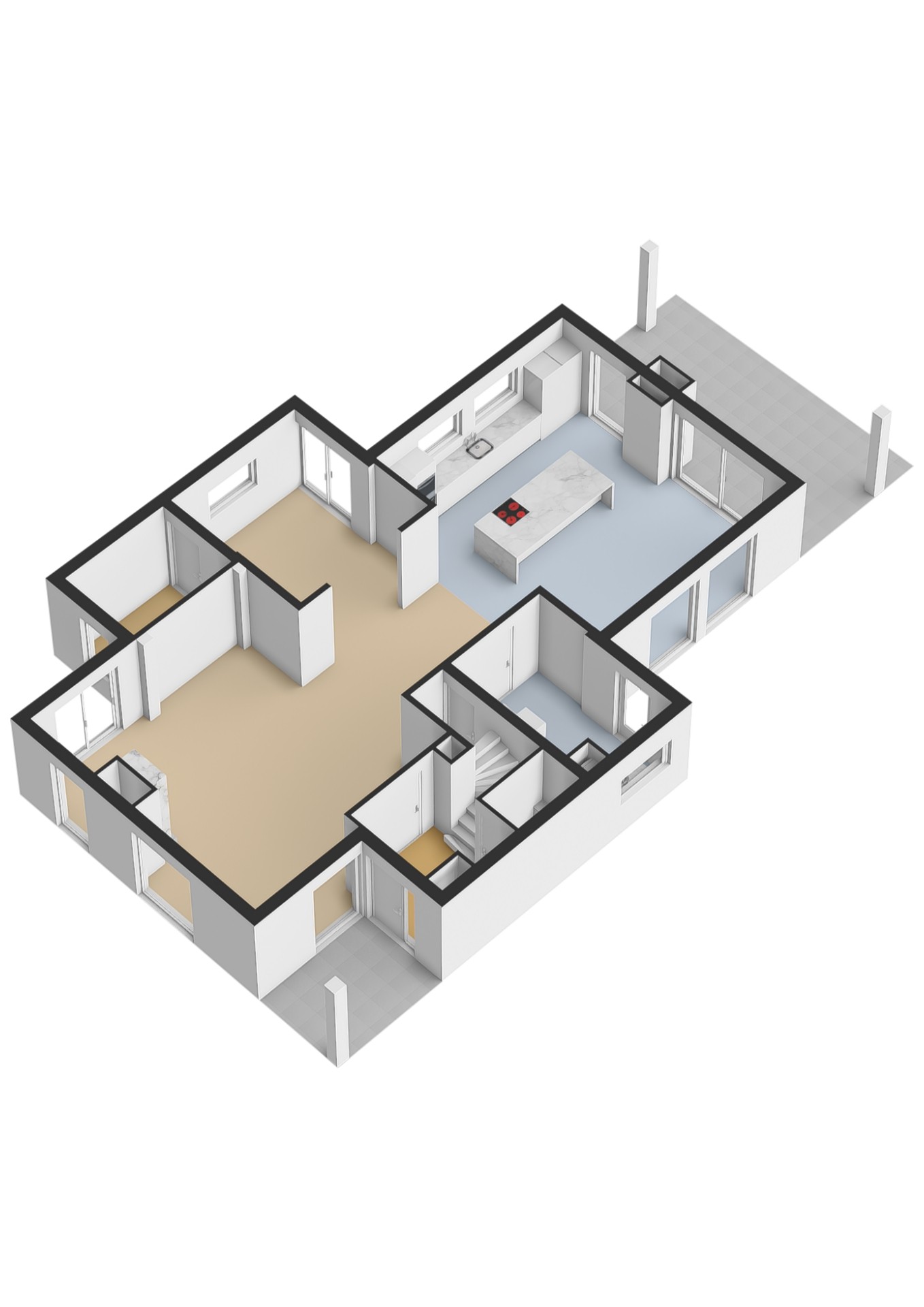 De leefruimtes zijn ruim opgezet en profiteren van veel lichtinval. Grote raampartijen en de schuifpui vanuit de keuken naar het terras zorgen voor een mooie verbinding met buiten en een vrij uitzicht over het perceel.