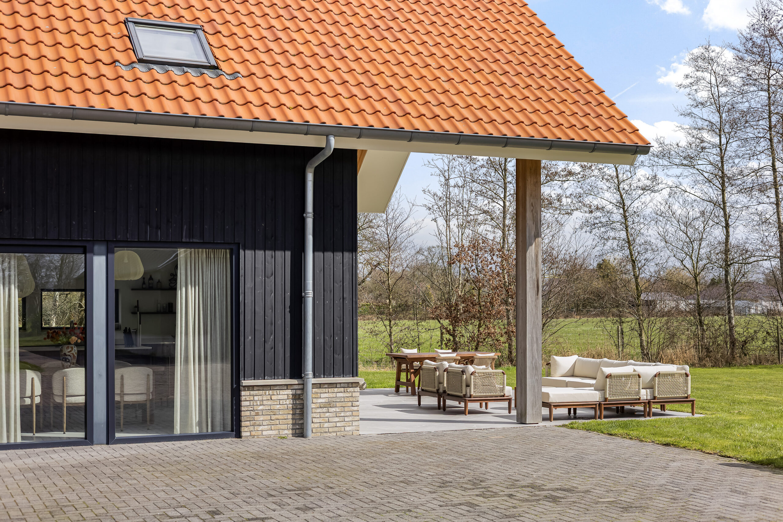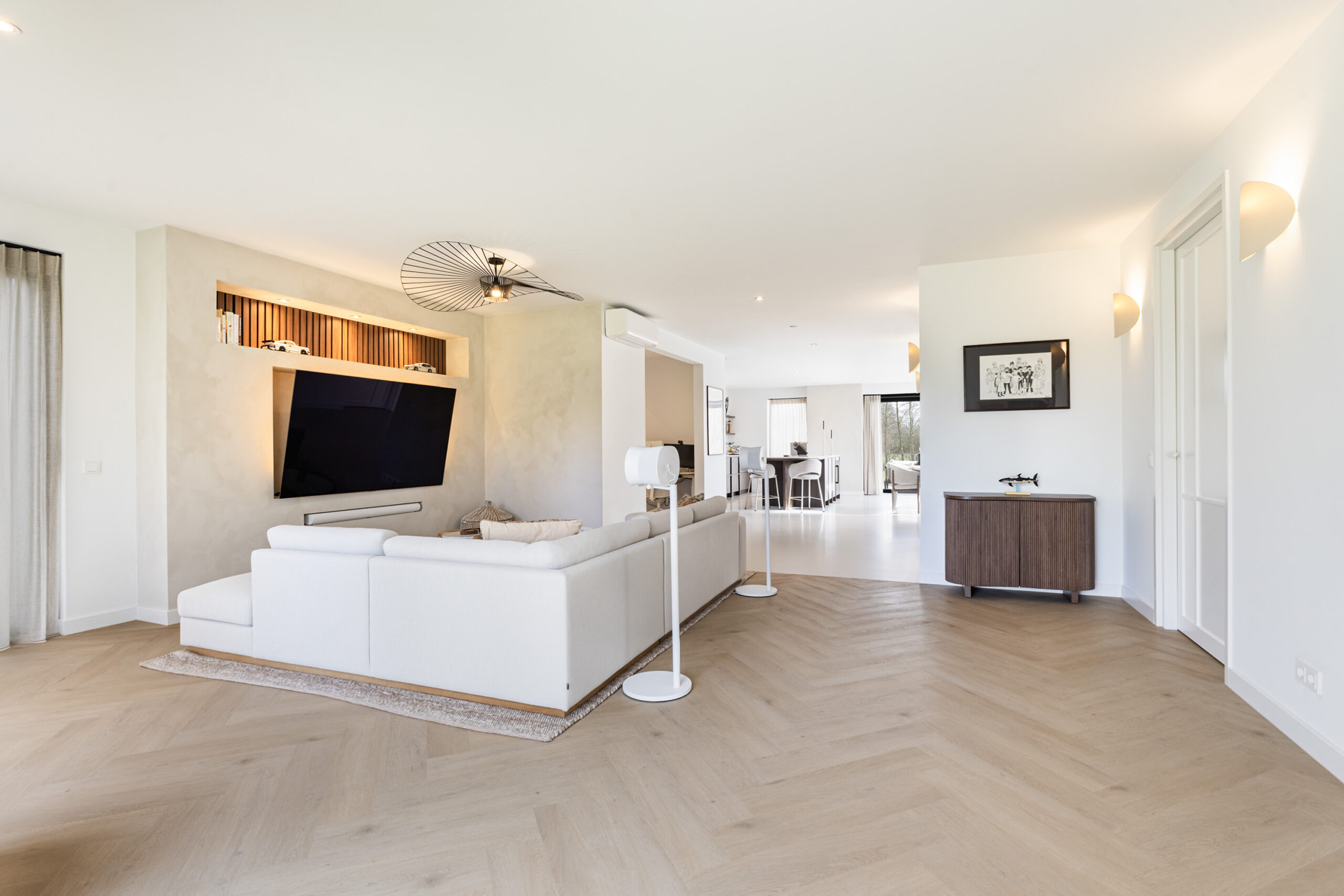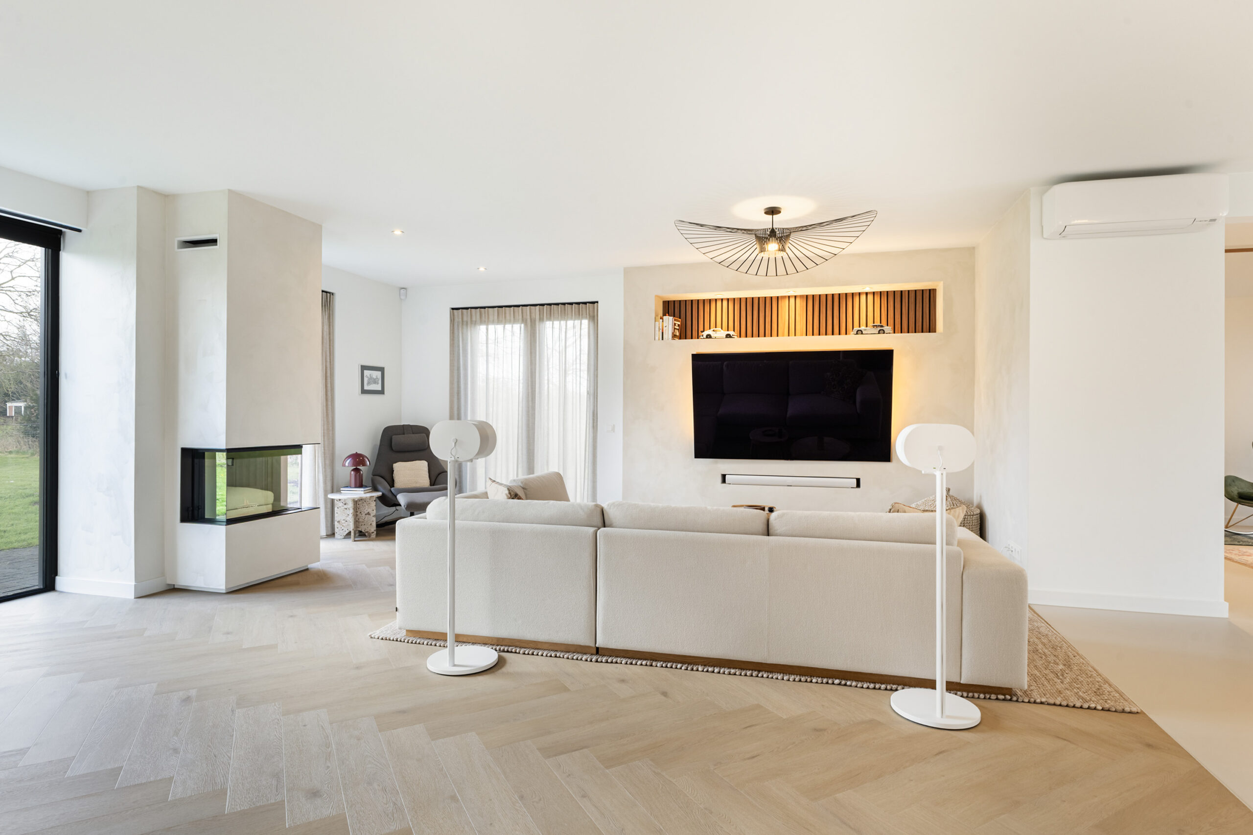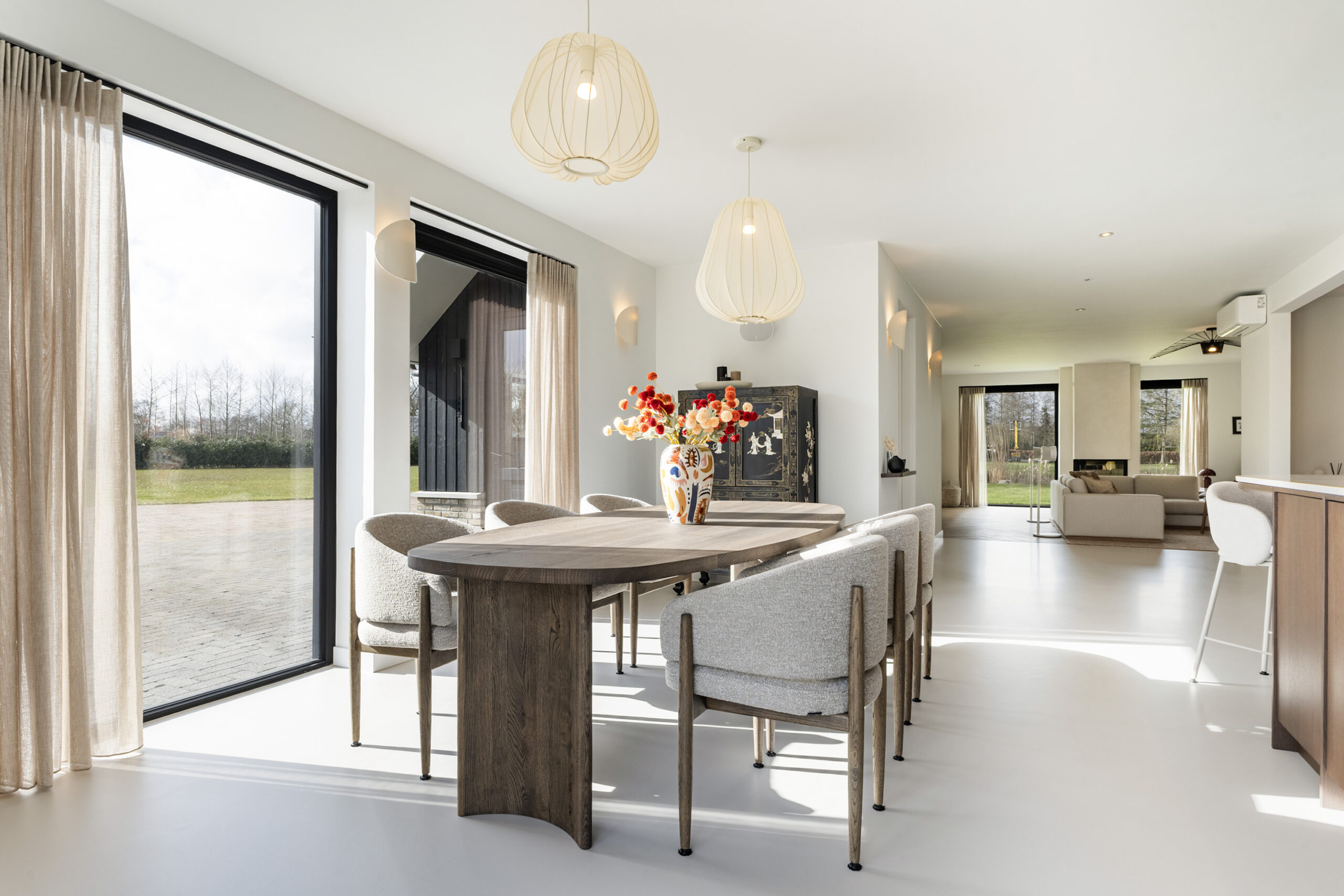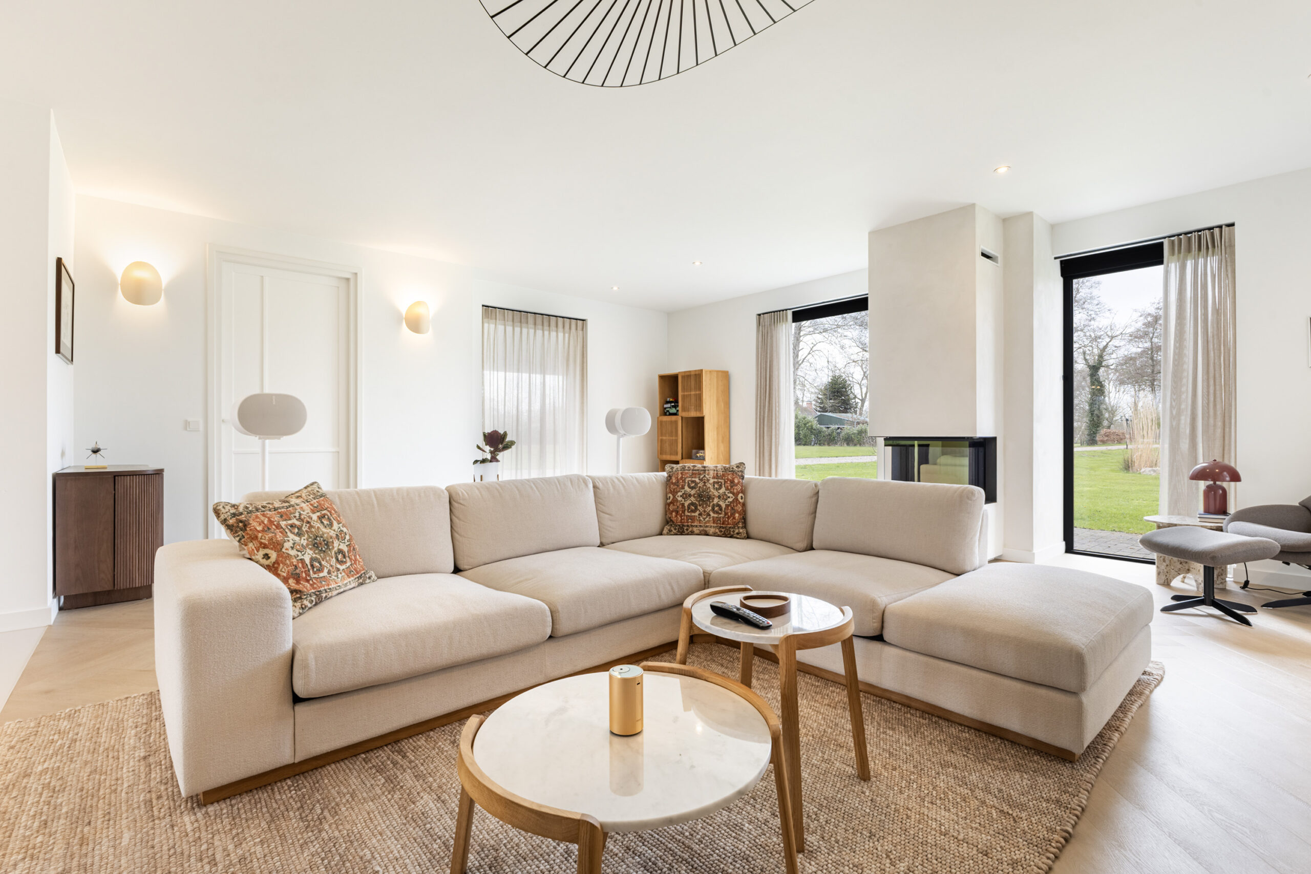 De leefruimtes zijn ruim opgezet en profiteren van veel lichtinval. Grote raampartijen en de schuifpui vanuit de keuken naar het terras zorgen voor een mooie verbinding met buiten en een vrij uitzicht over het perceel.