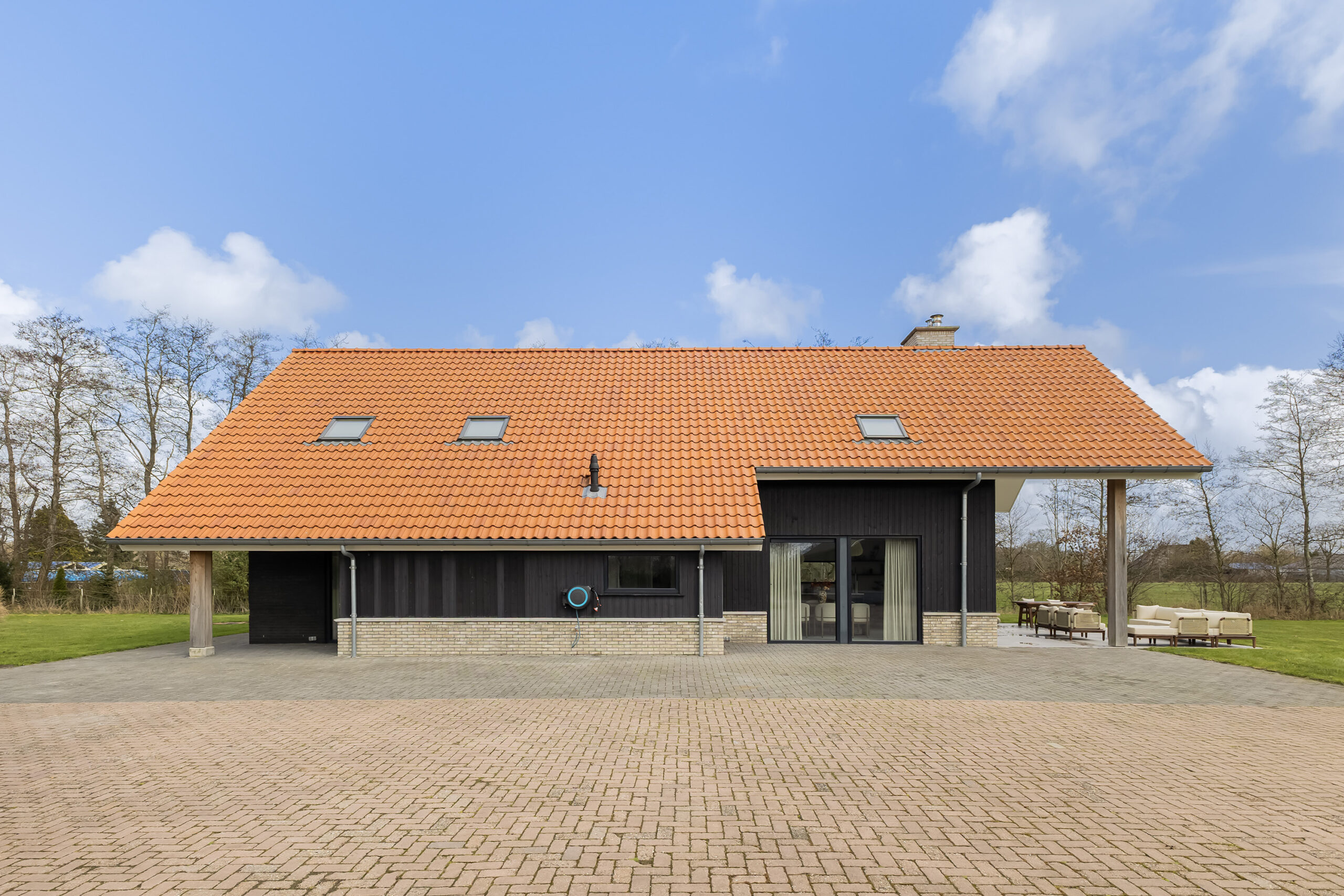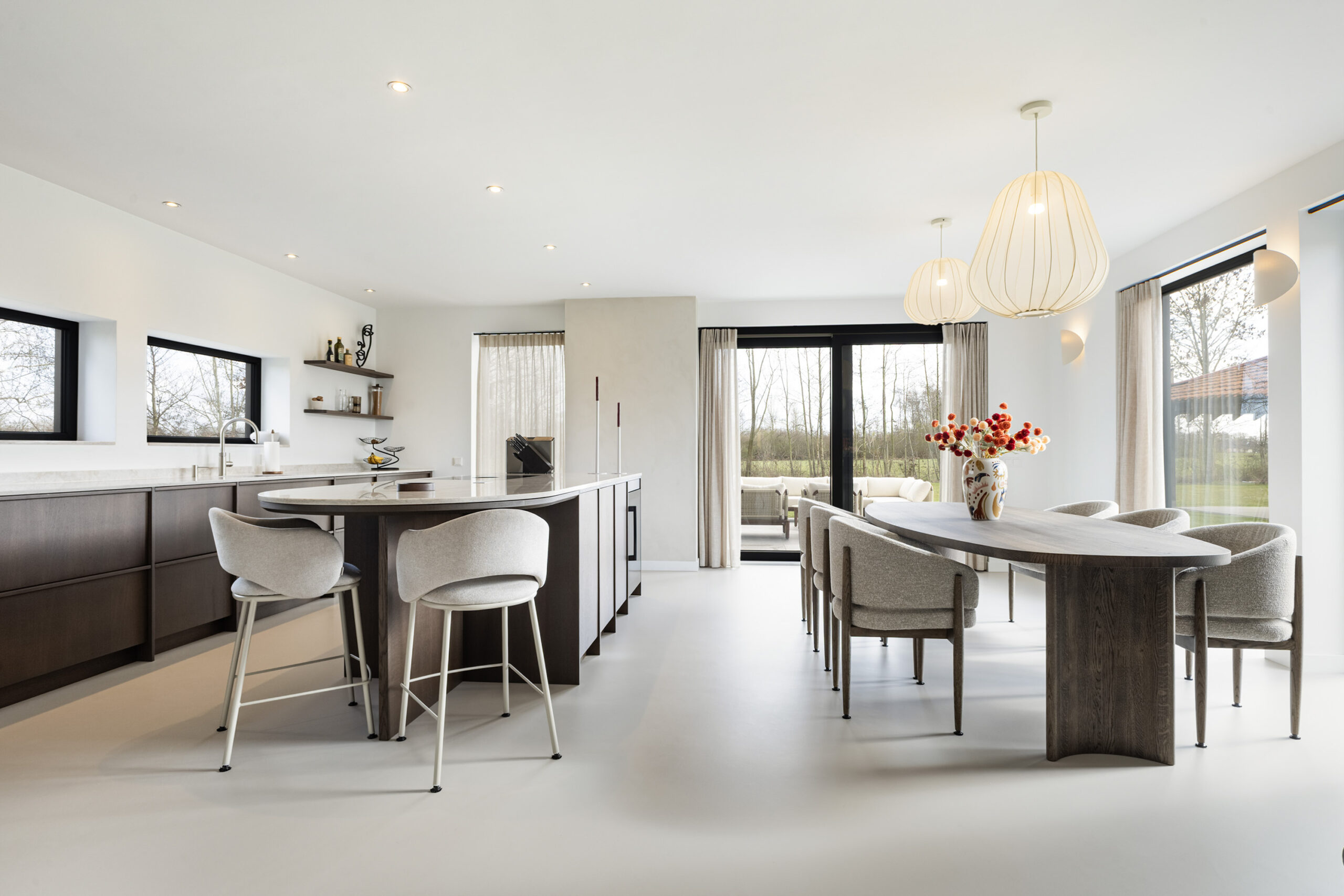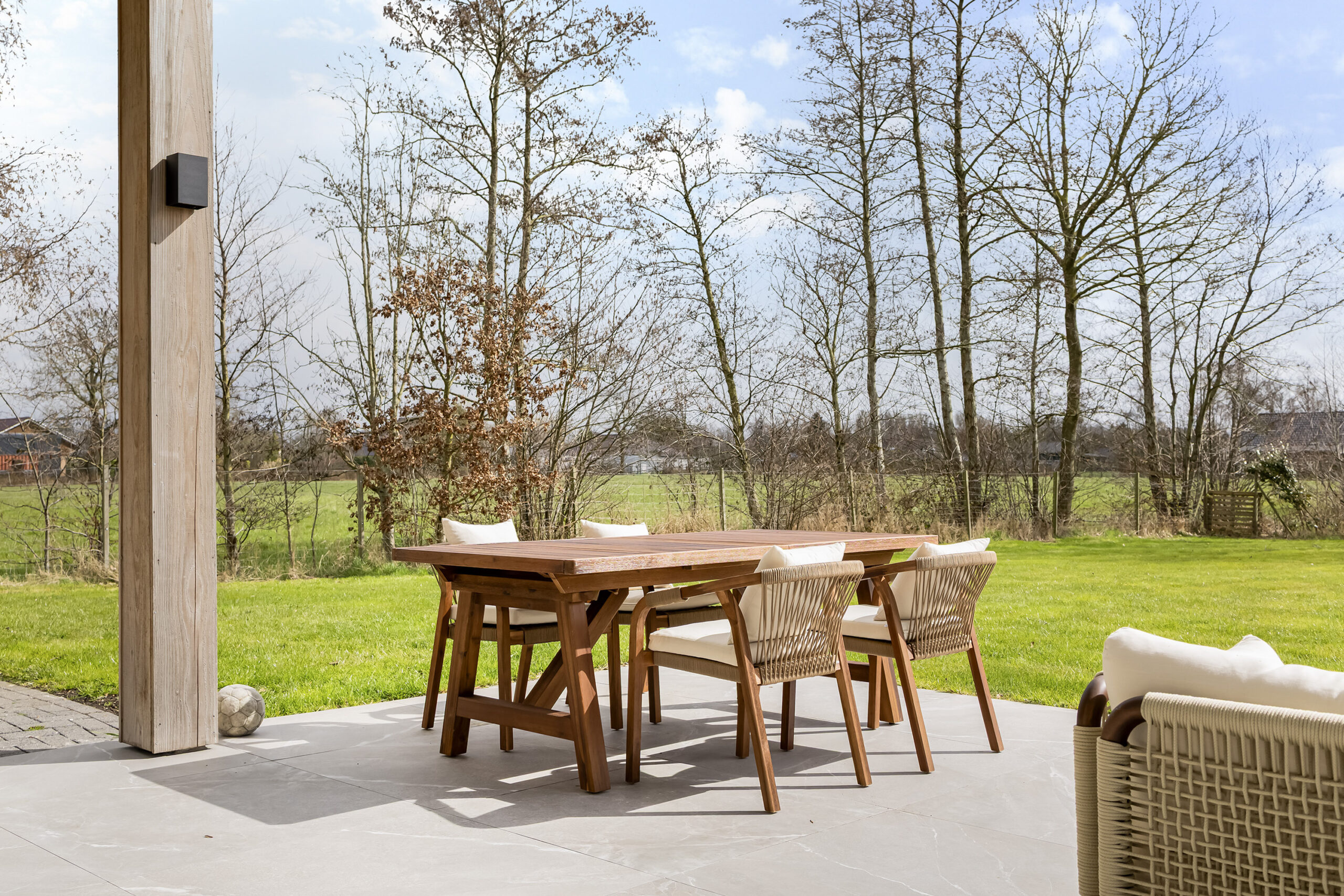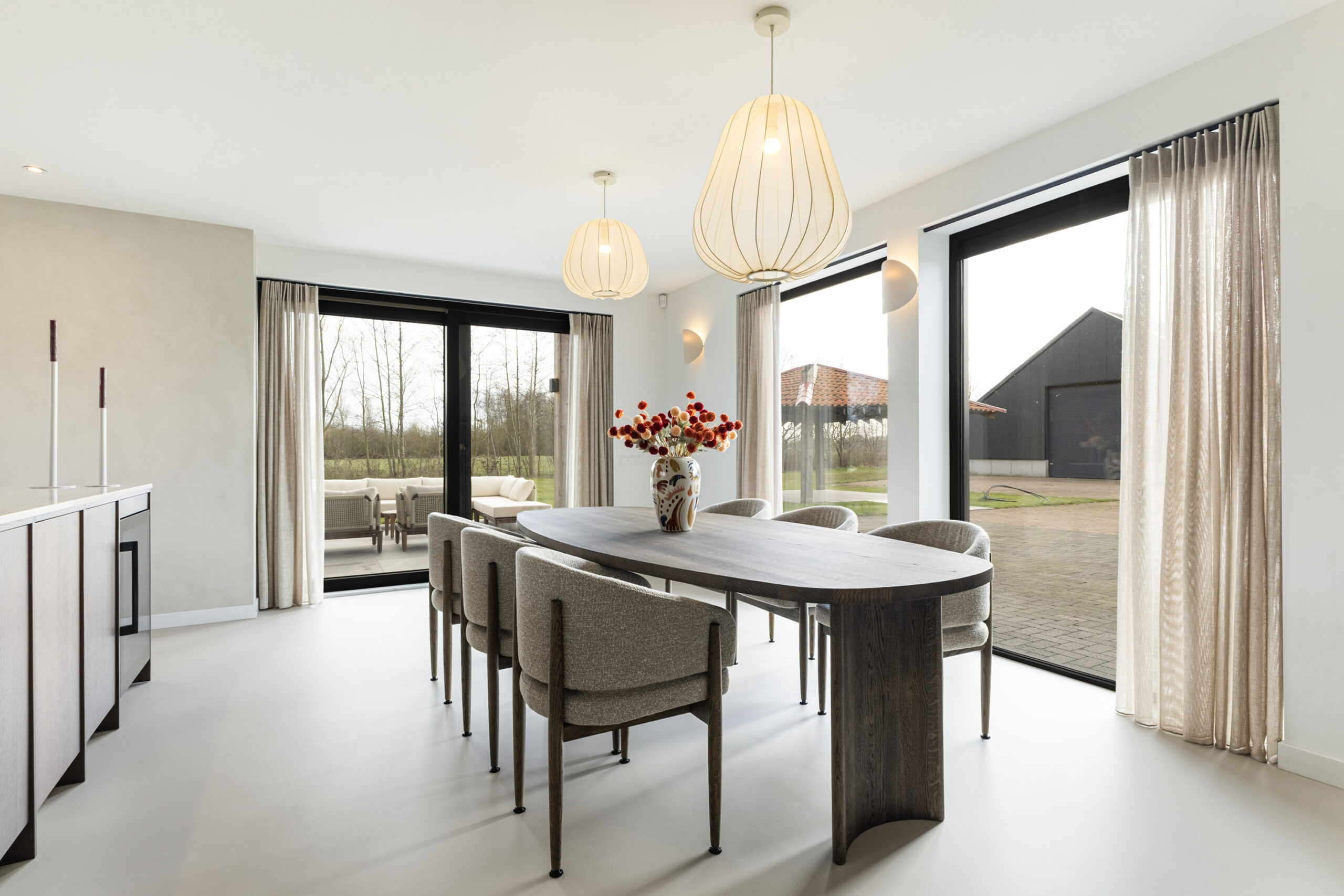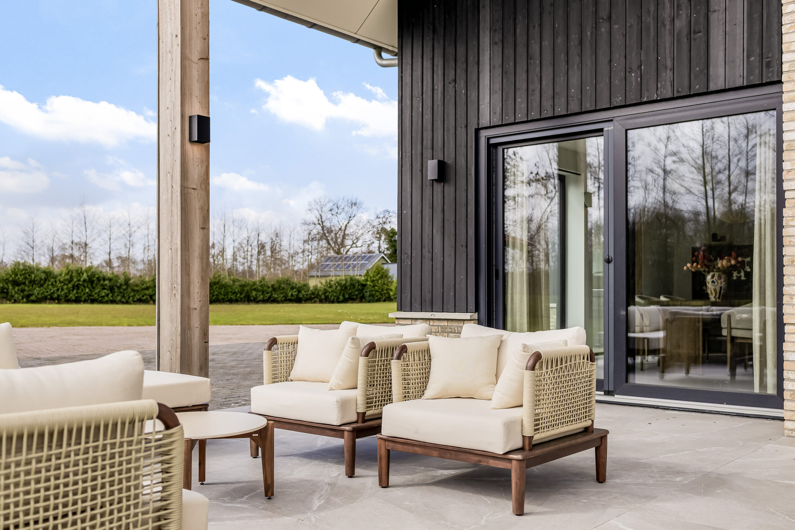 De leefruimtes zijn ruim opgezet en profiteren van veel lichtinval. Grote raampartijen en de schuifpui vanuit de keuken naar het terras zorgen voor een mooie verbinding met buiten en een vrij uitzicht over het perceel.