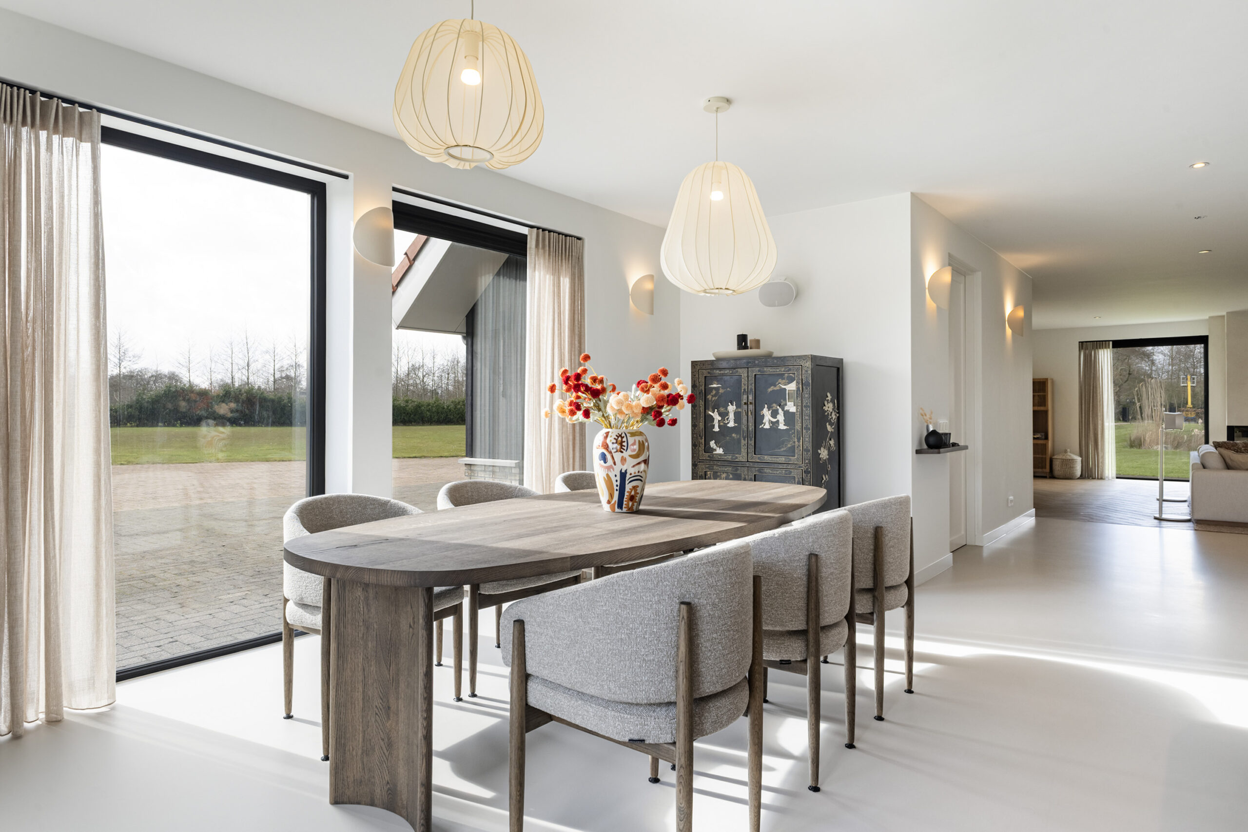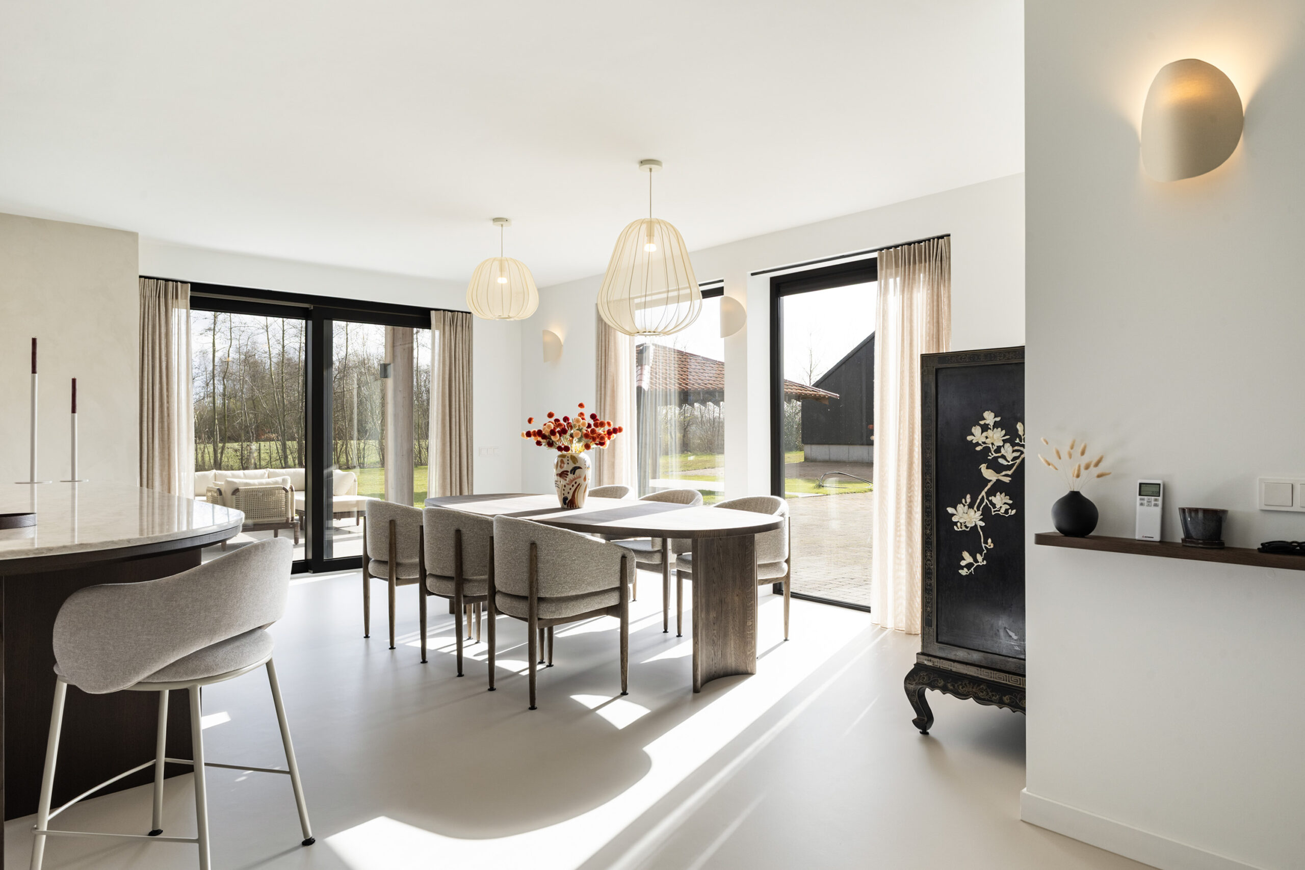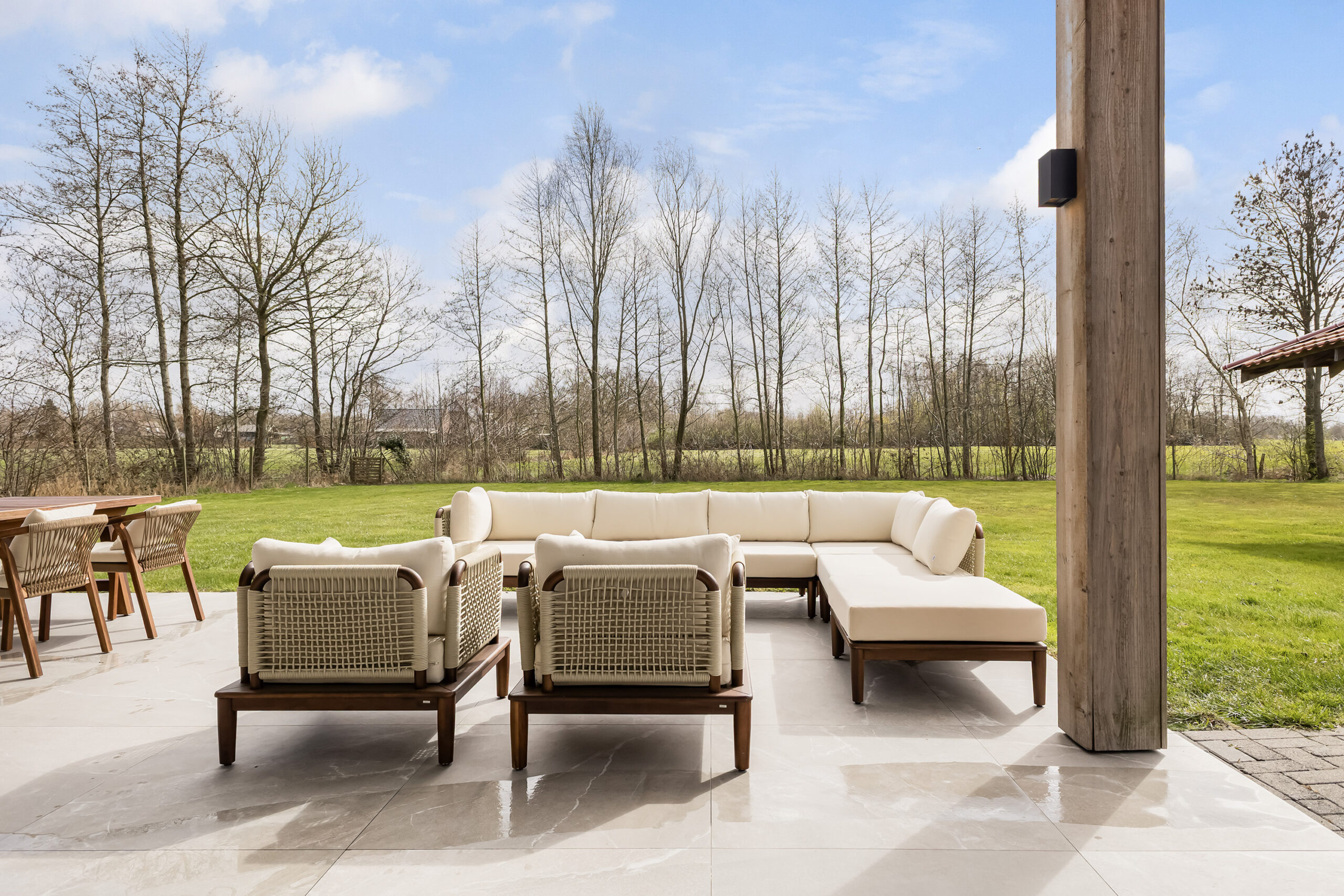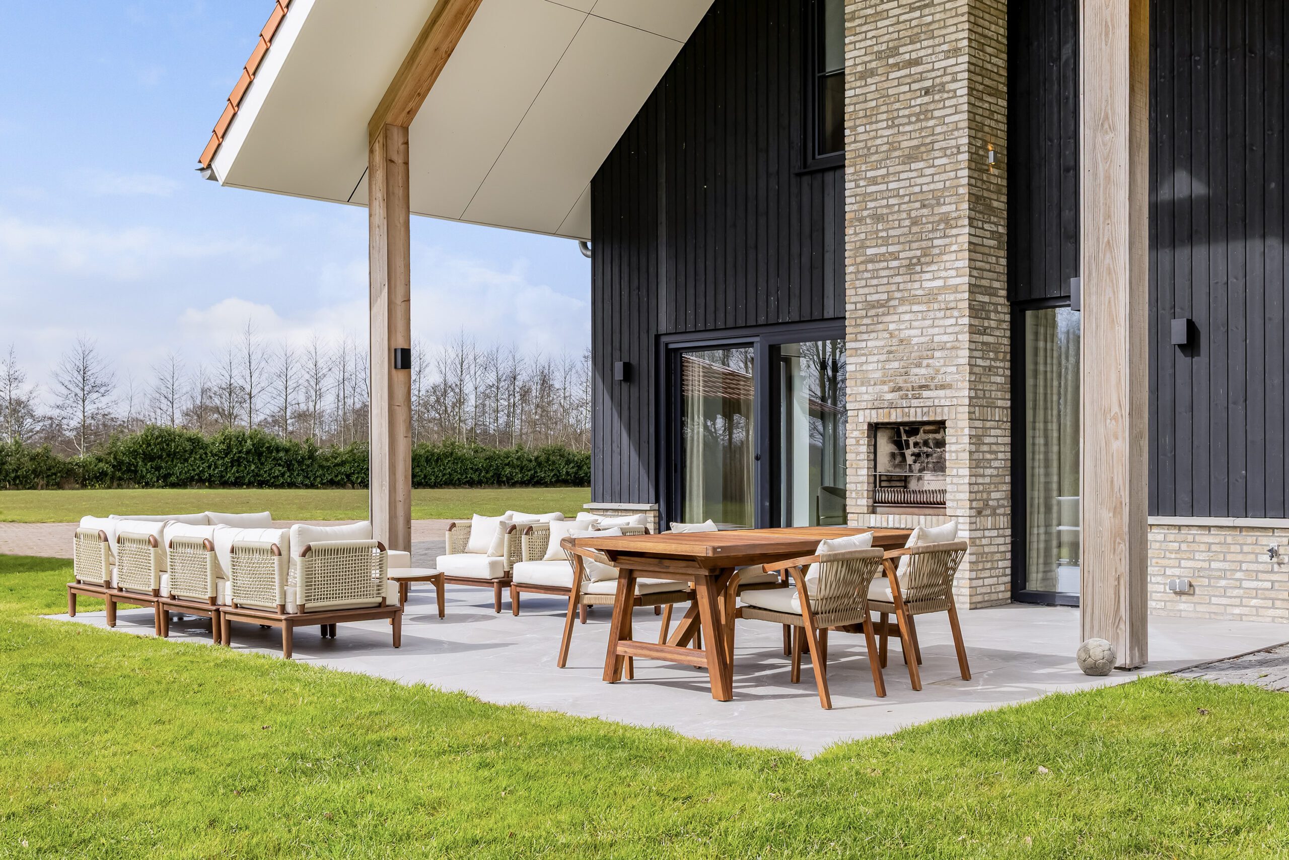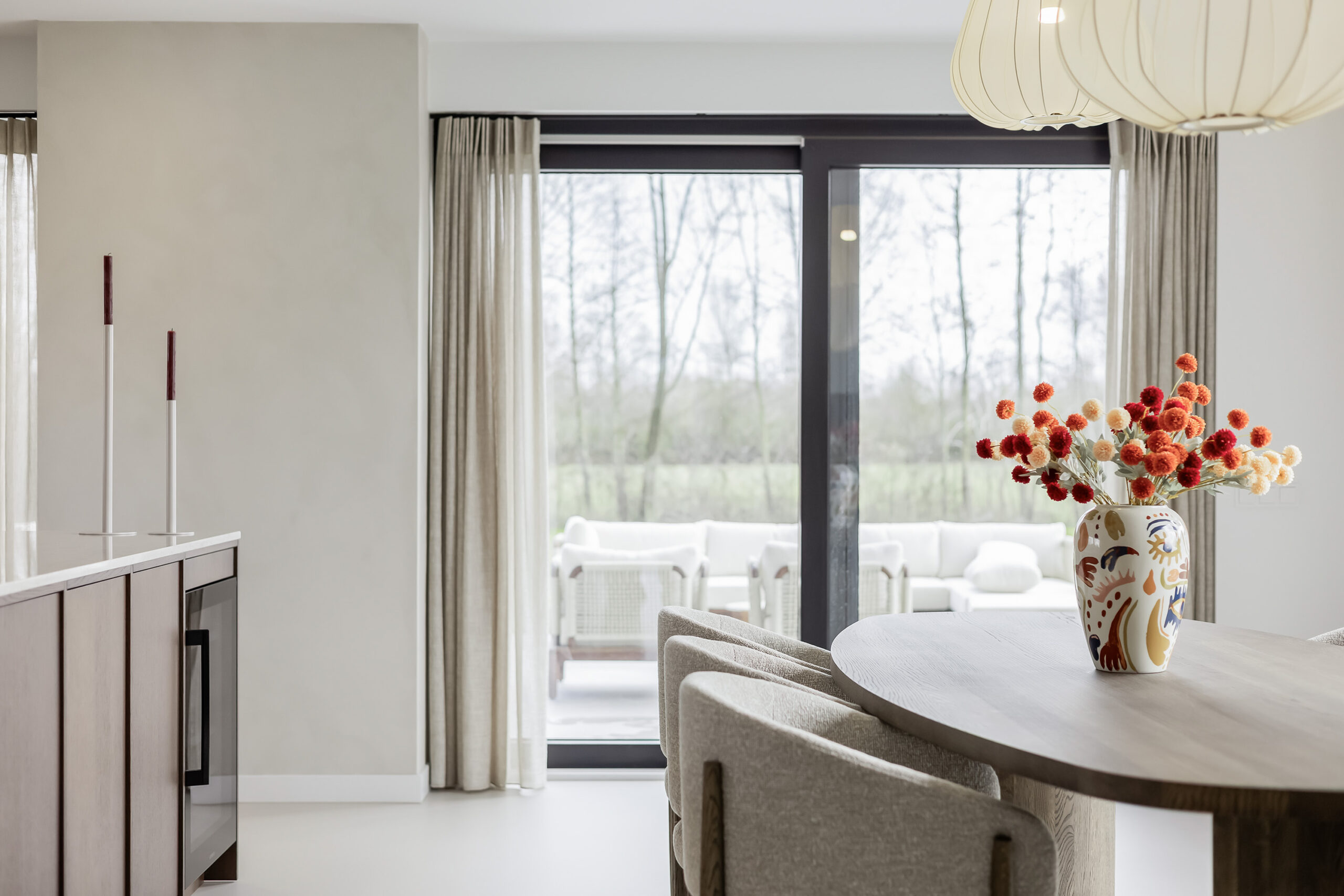 De leefruimtes zijn ruim opgezet en profiteren van veel lichtinval. Grote raampartijen en de schuifpui vanuit de keuken naar het terras zorgen voor een mooie verbinding met buiten en een vrij uitzicht over het perceel.