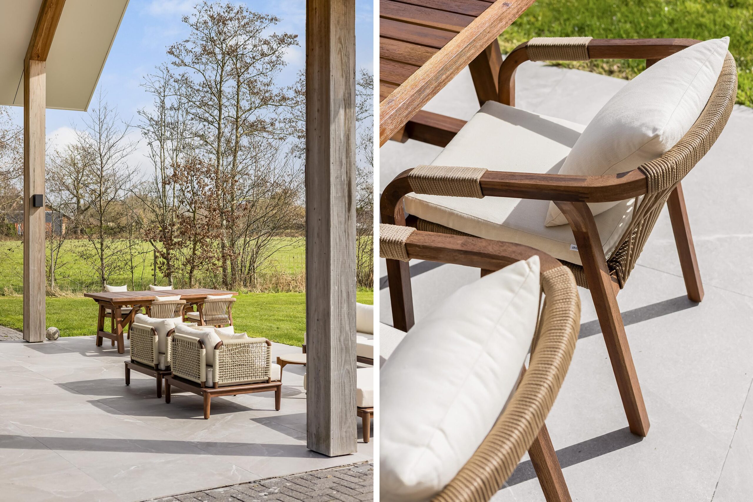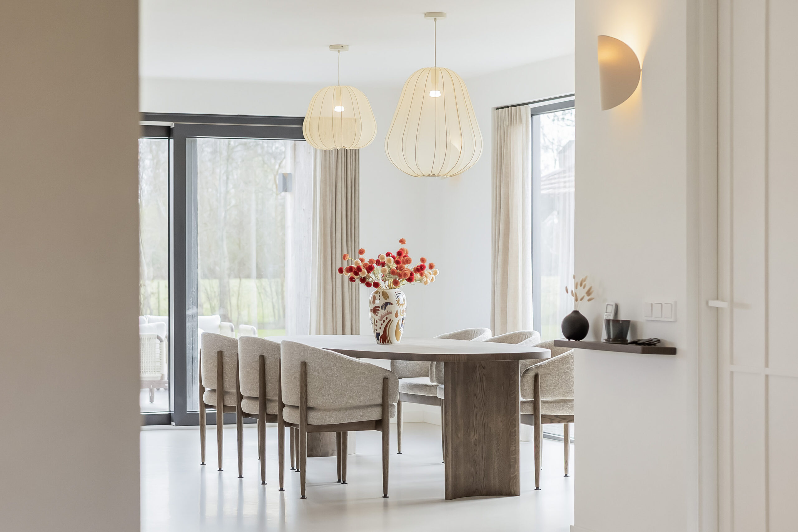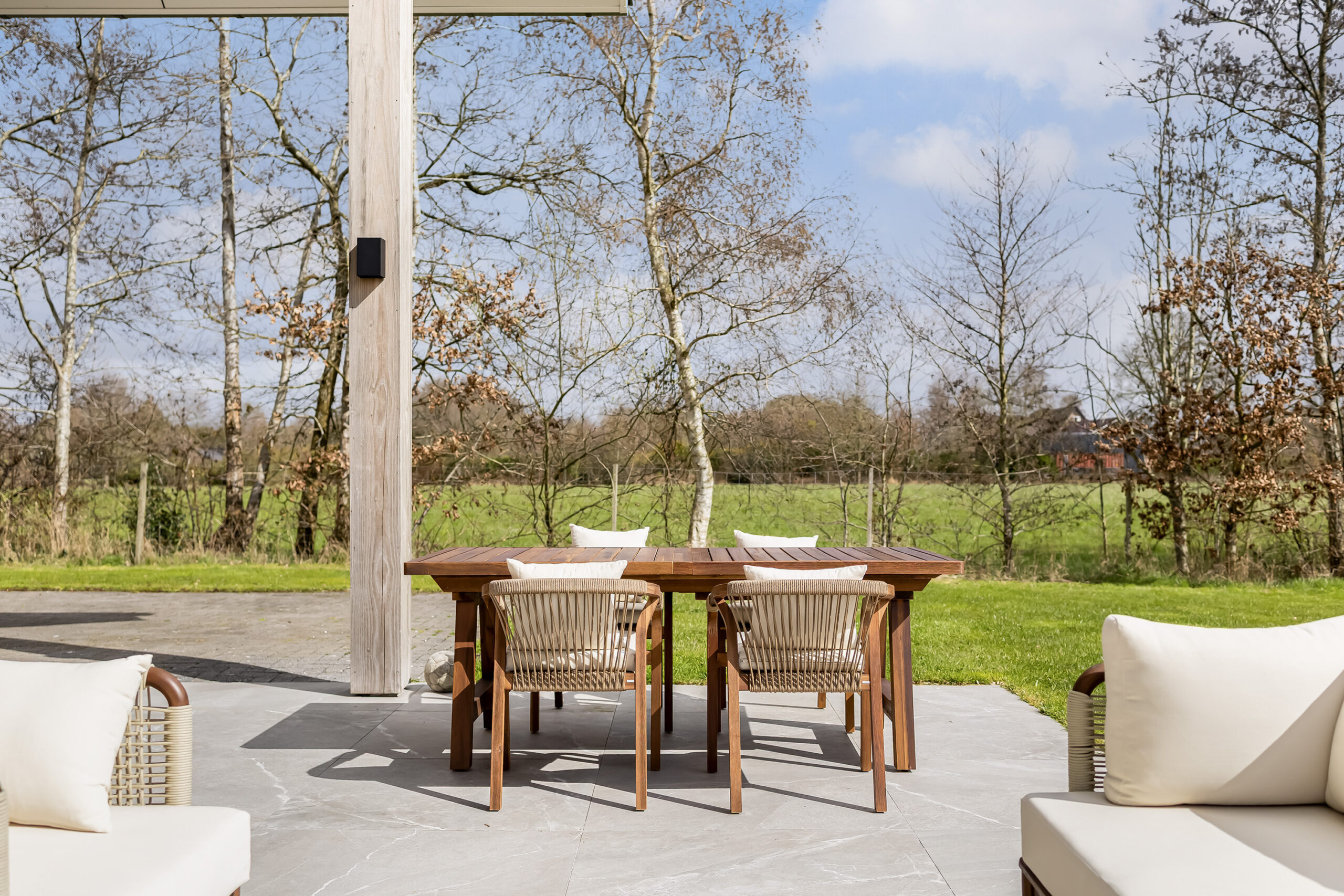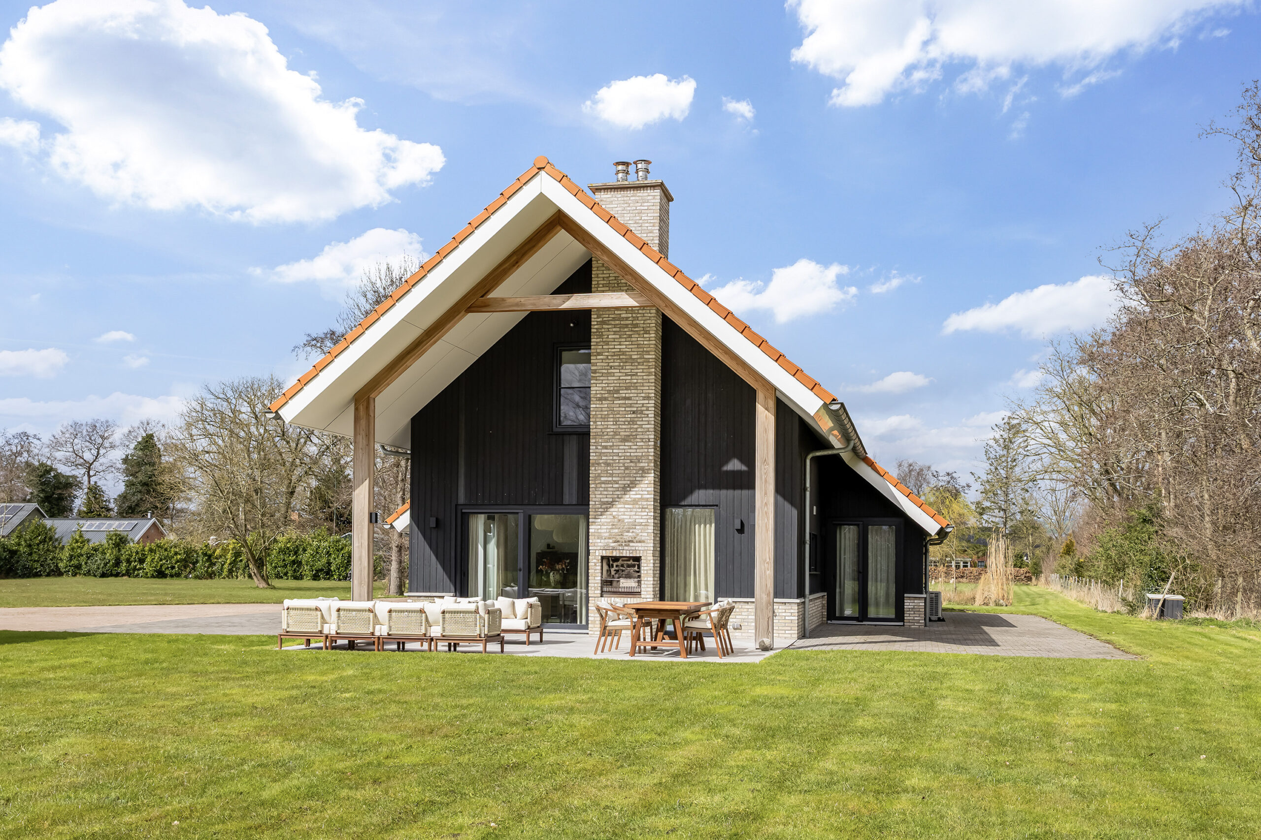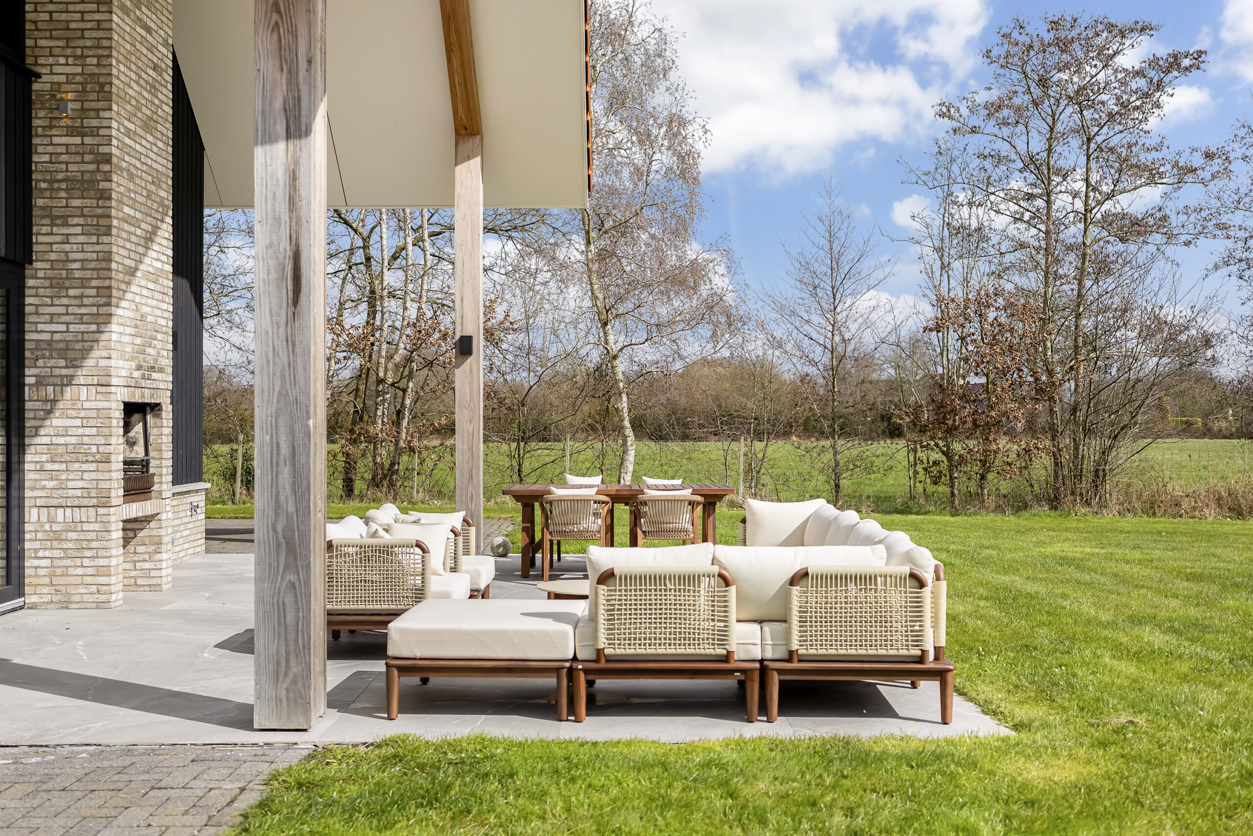 De leefruimtes zijn ruim opgezet en profiteren van veel lichtinval. Grote raampartijen en de schuifpui vanuit de keuken naar het terras zorgen voor een mooie verbinding met buiten en een vrij uitzicht over het perceel.