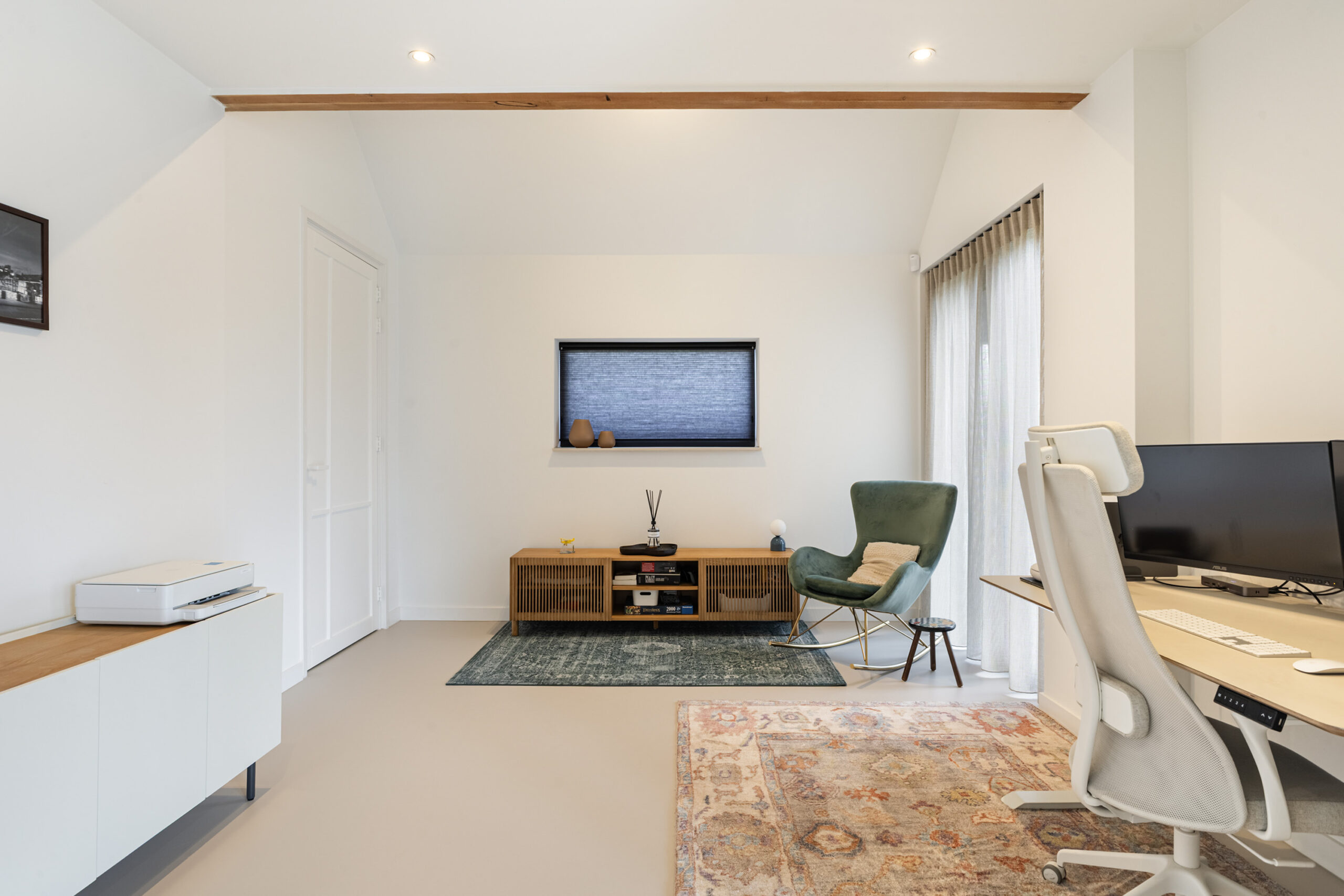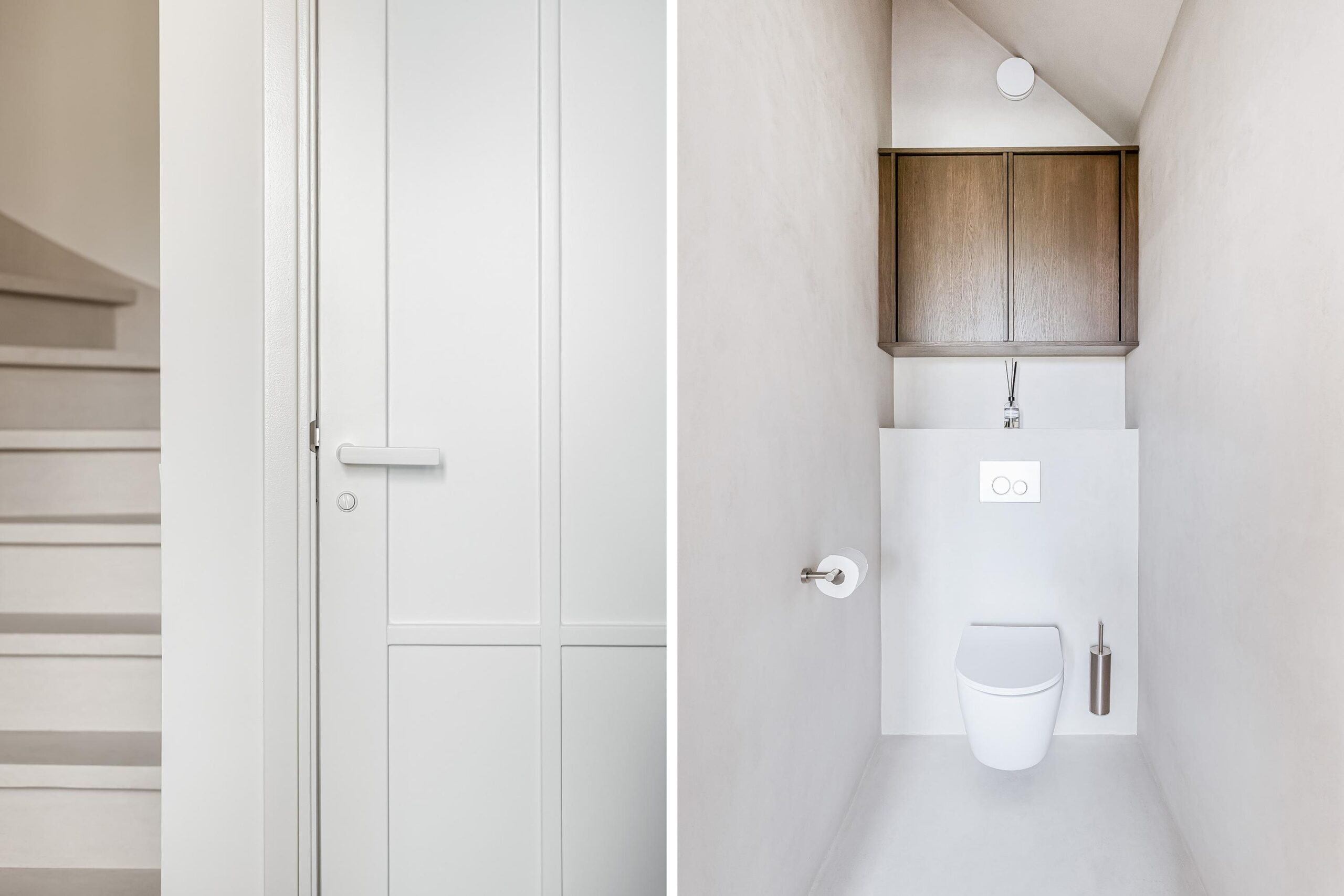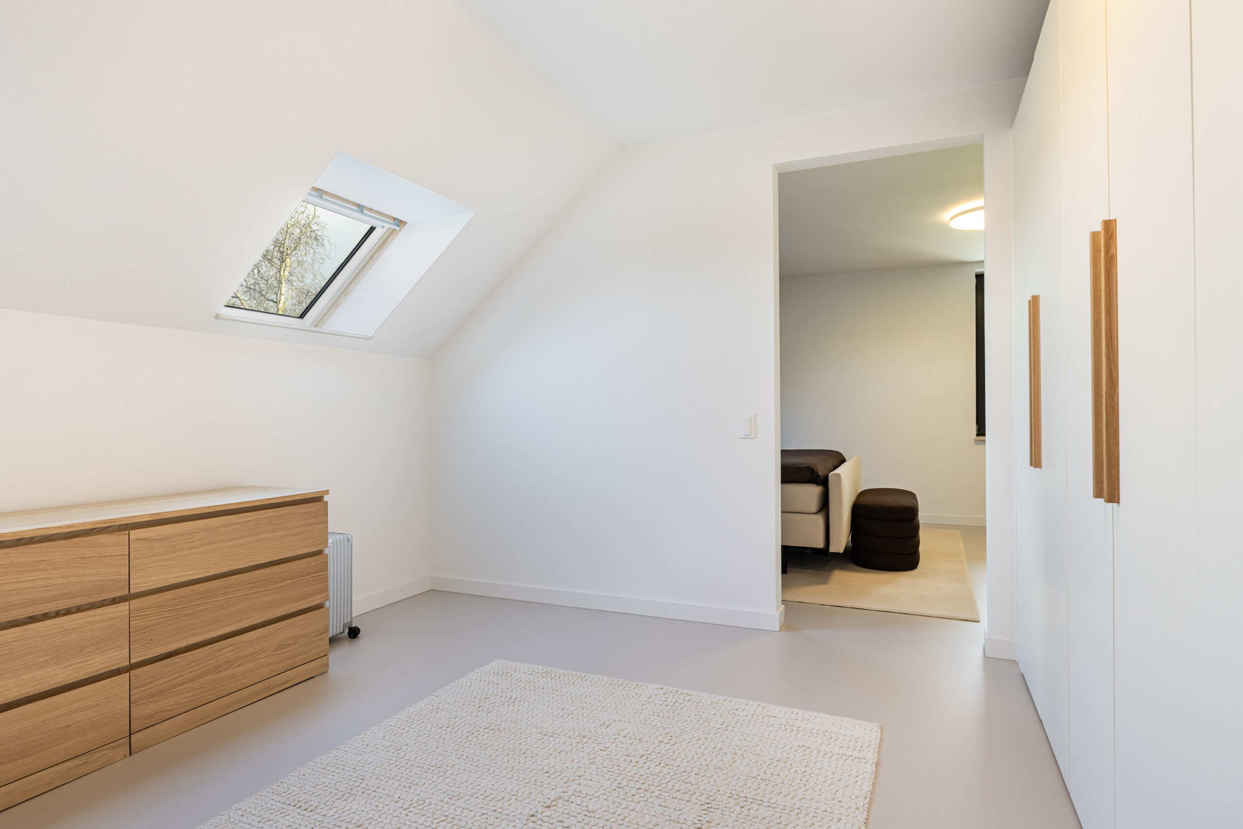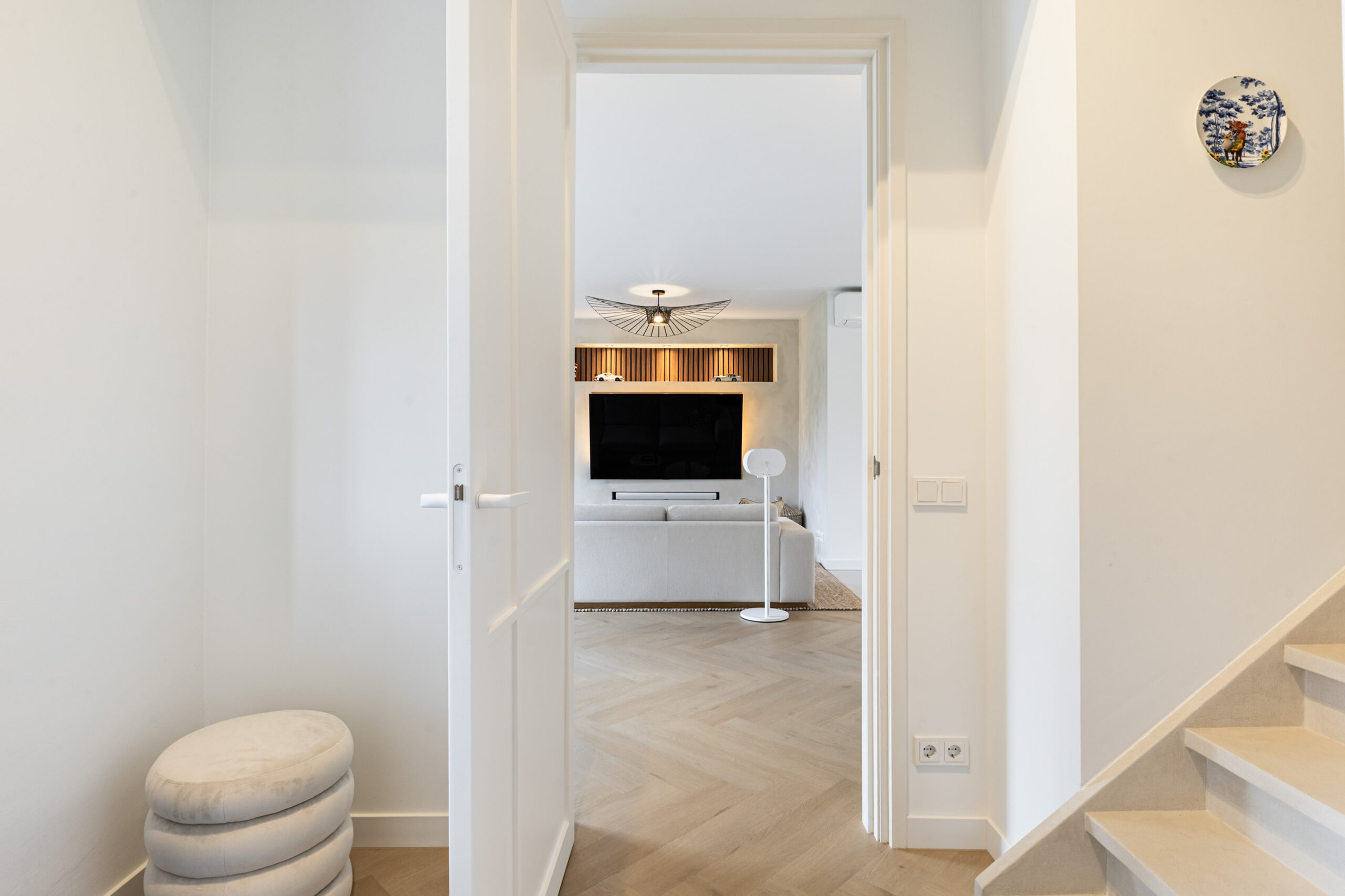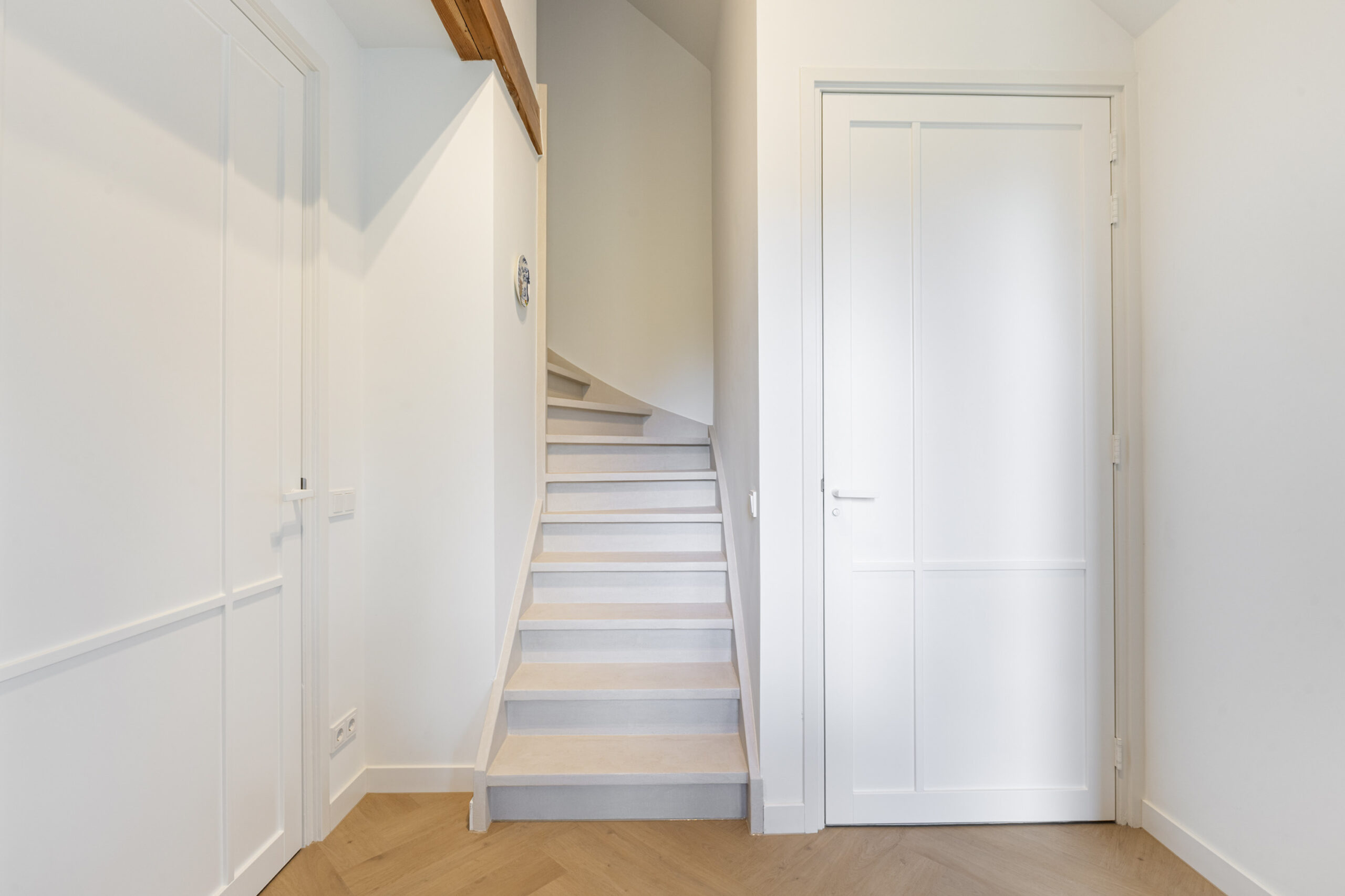 Binnen valt direct de rust en kwaliteit op. De afwerking is strak, modern en tot in detail verzorgd. De vloeren zijn vernieuwd met een combinatie van Belakos PVC en een PU gietvloer op de begane grond en PVC op de verdieping. Alle binnendeuren zijn vervangen door massieve deuren en diverse elementen, waaronder de trap en vensterbanken, zijn afgewerkt met Forcrete microcement.