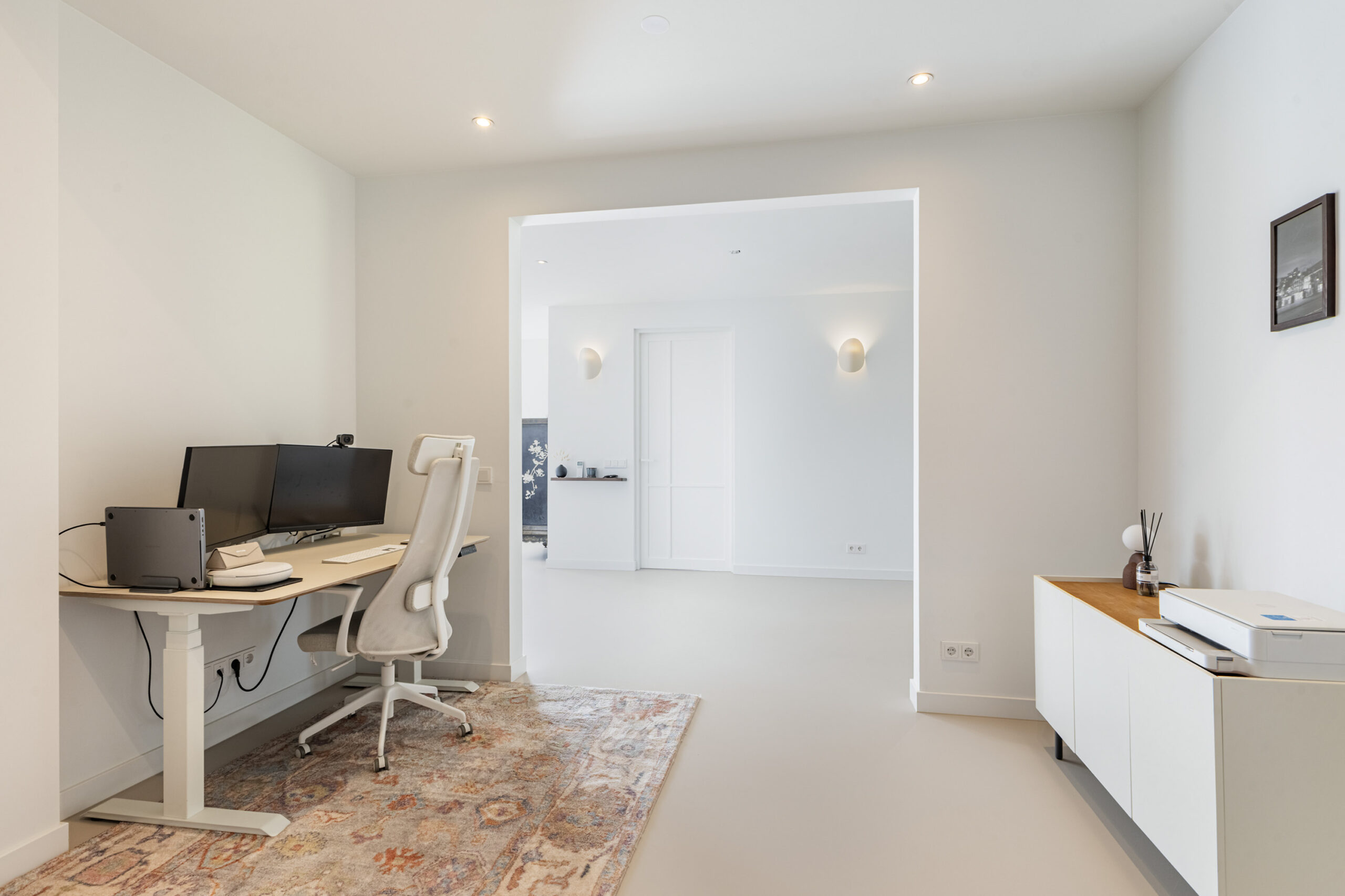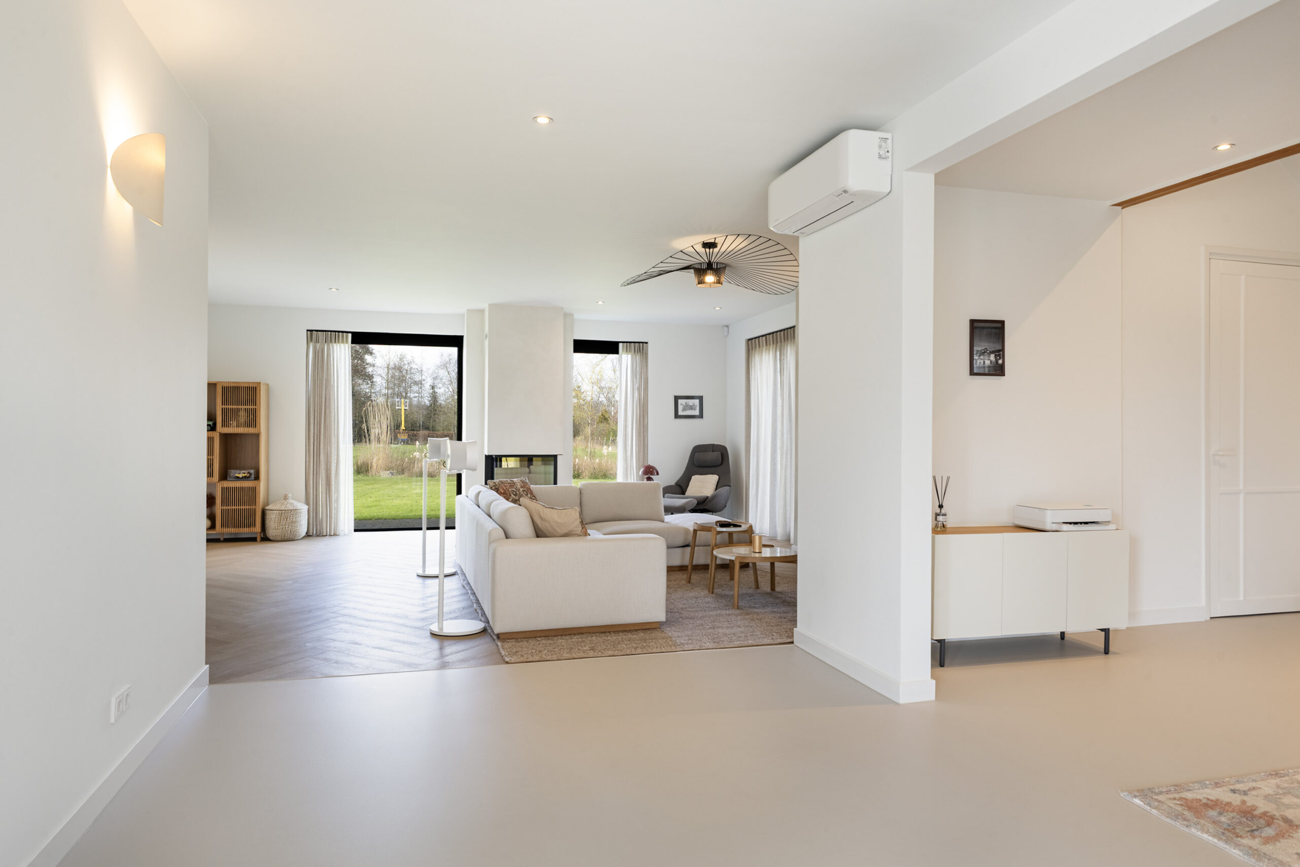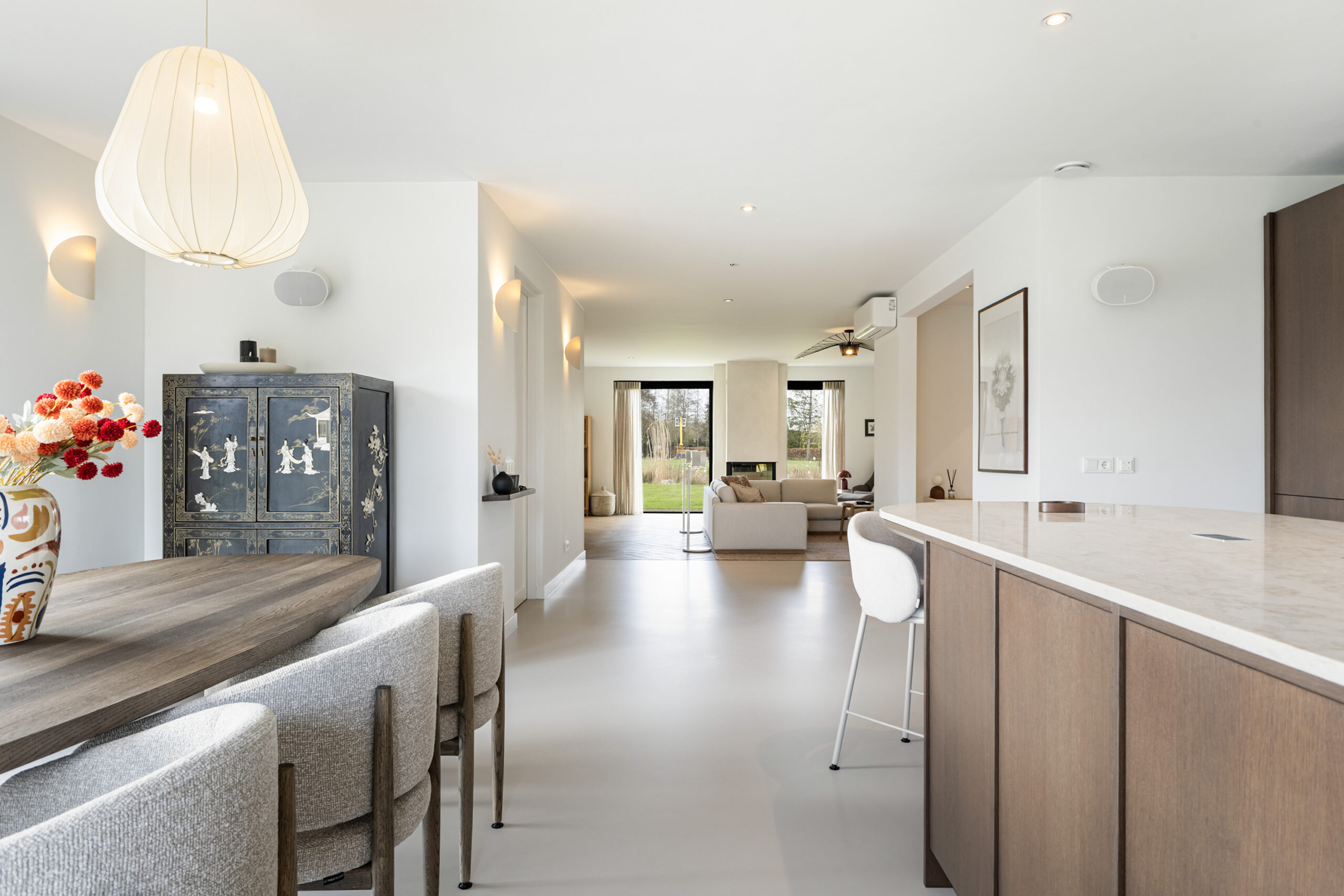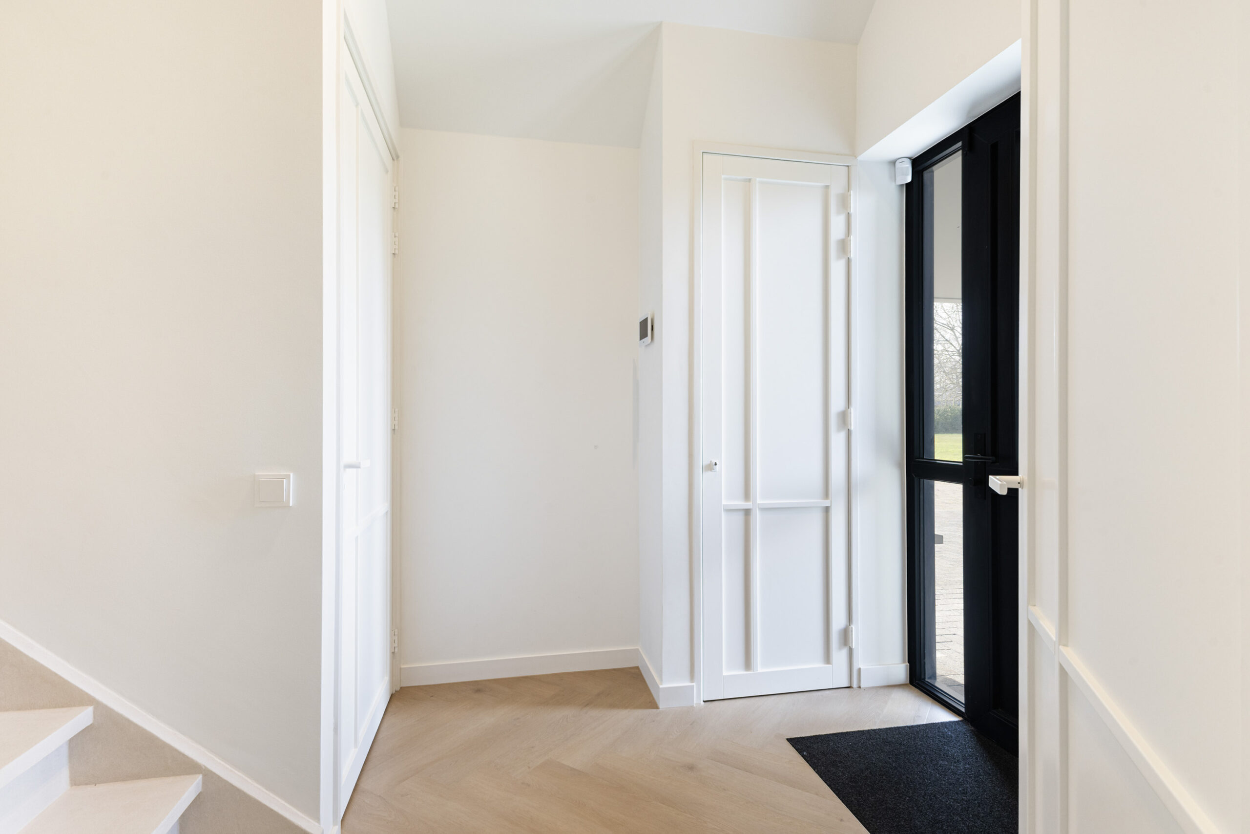 Binnen valt direct de rust en kwaliteit op. De afwerking is strak, modern en tot in detail verzorgd. De vloeren zijn vernieuwd met een combinatie van Belakos PVC en een PU gietvloer op de begane grond en PVC op de verdieping. Alle binnendeuren zijn vervangen door massieve deuren en diverse elementen, waaronder de trap en vensterbanken, zijn afgewerkt met Forcrete microcement.