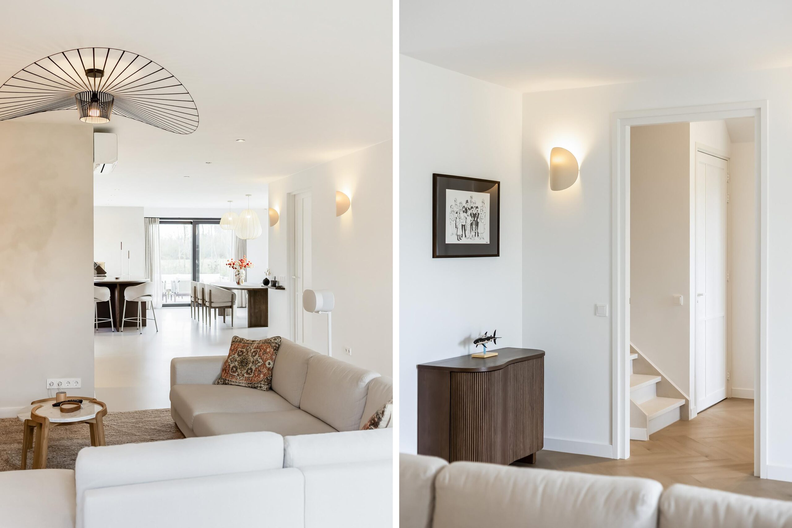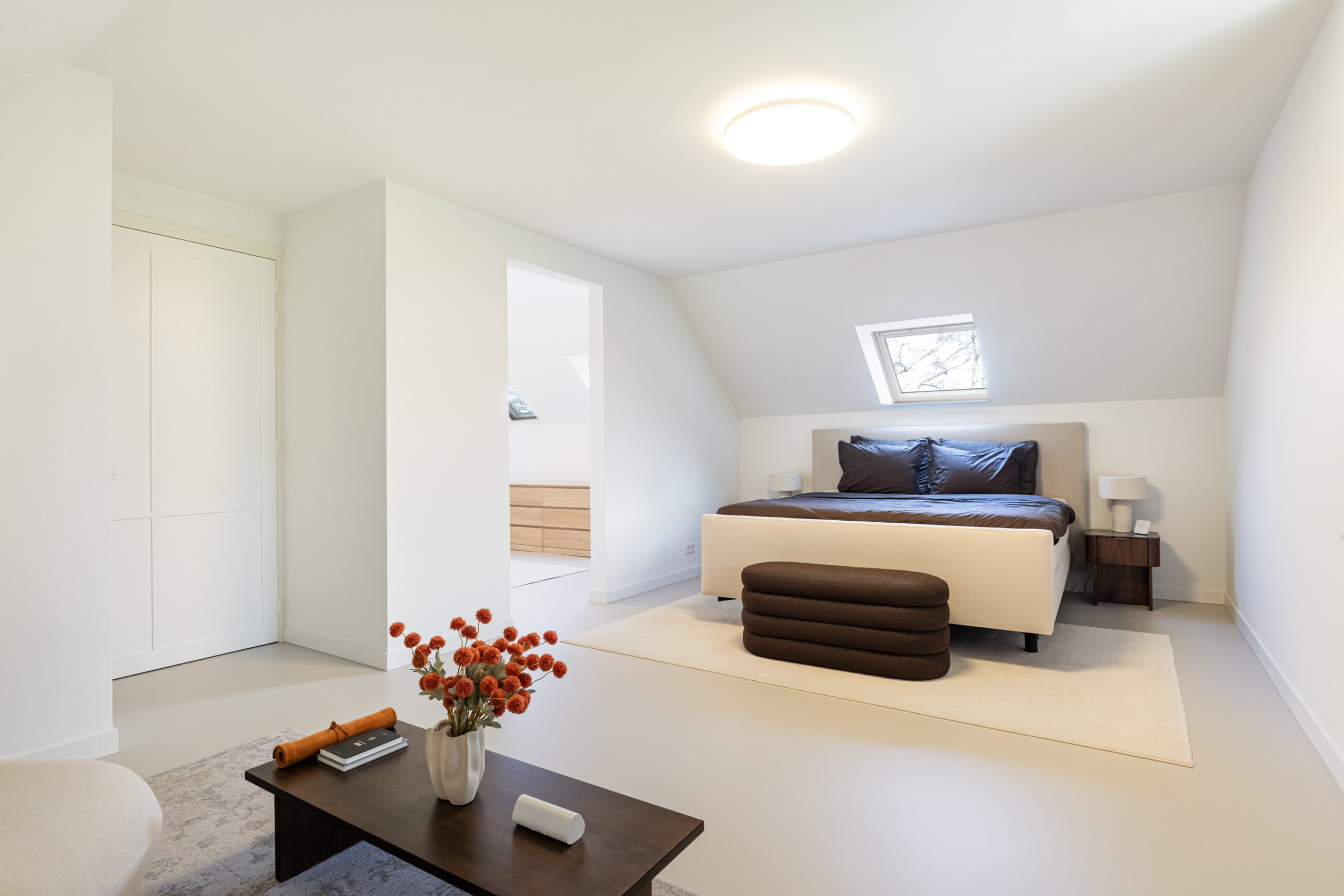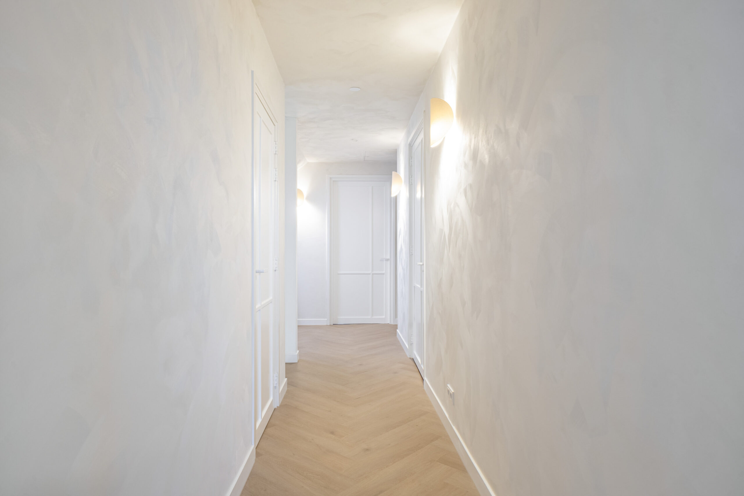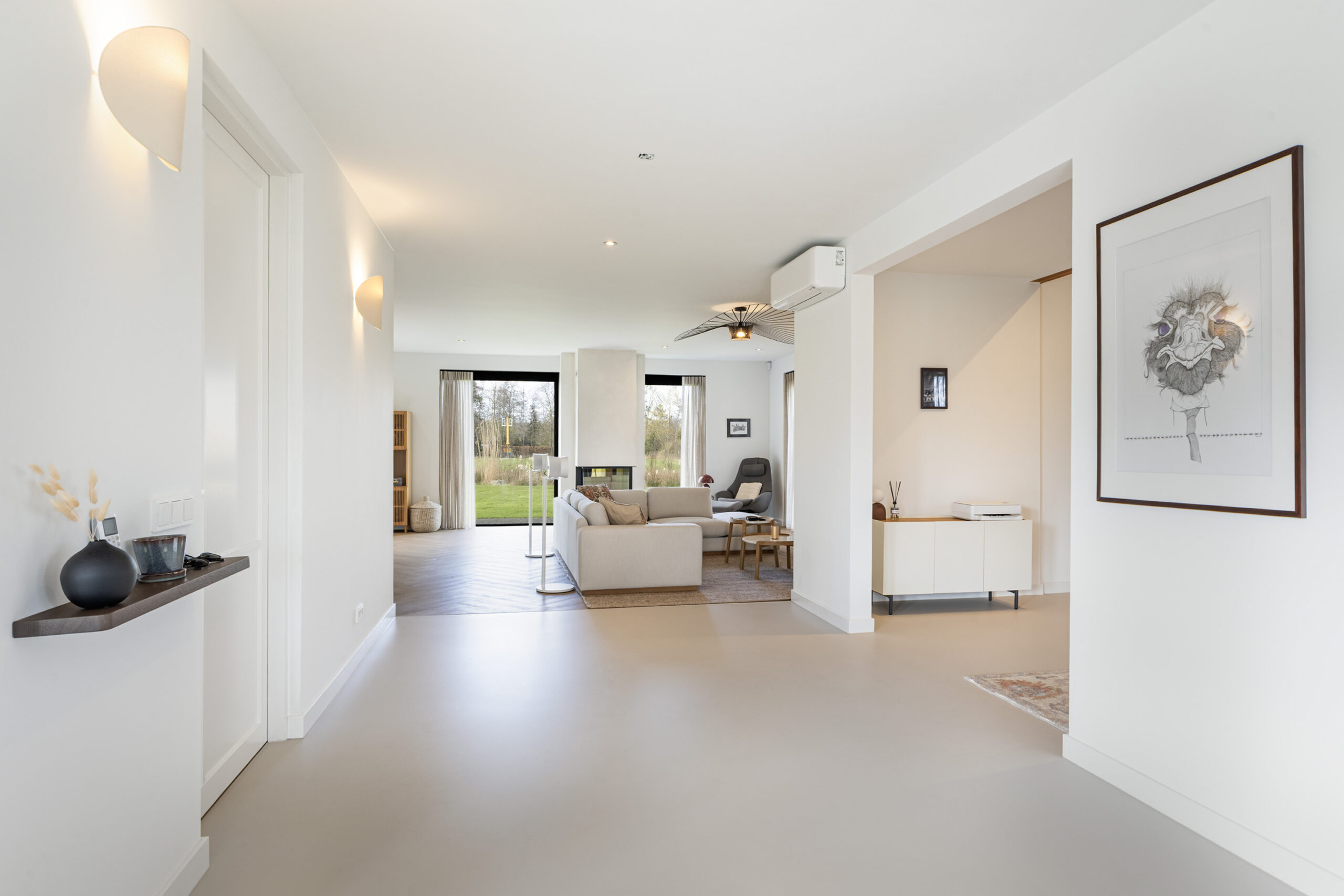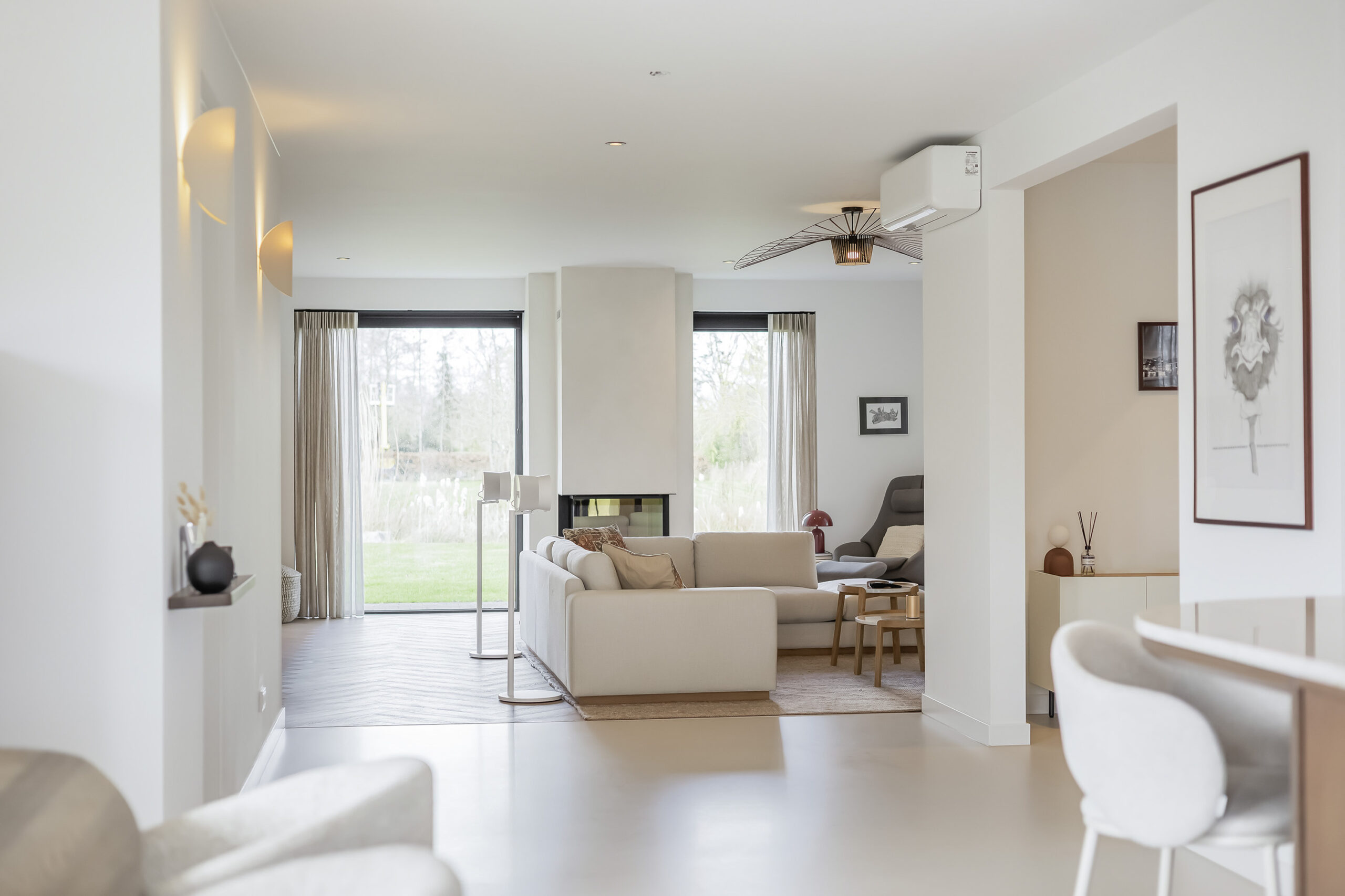 Binnen valt direct de rust en kwaliteit op. De afwerking is strak, modern en tot in detail verzorgd. De vloeren zijn vernieuwd met een combinatie van Belakos PVC en een PU gietvloer op de begane grond en PVC op de verdieping. Alle binnendeuren zijn vervangen door massieve deuren en diverse elementen, waaronder de trap en vensterbanken, zijn afgewerkt met Forcrete microcement.