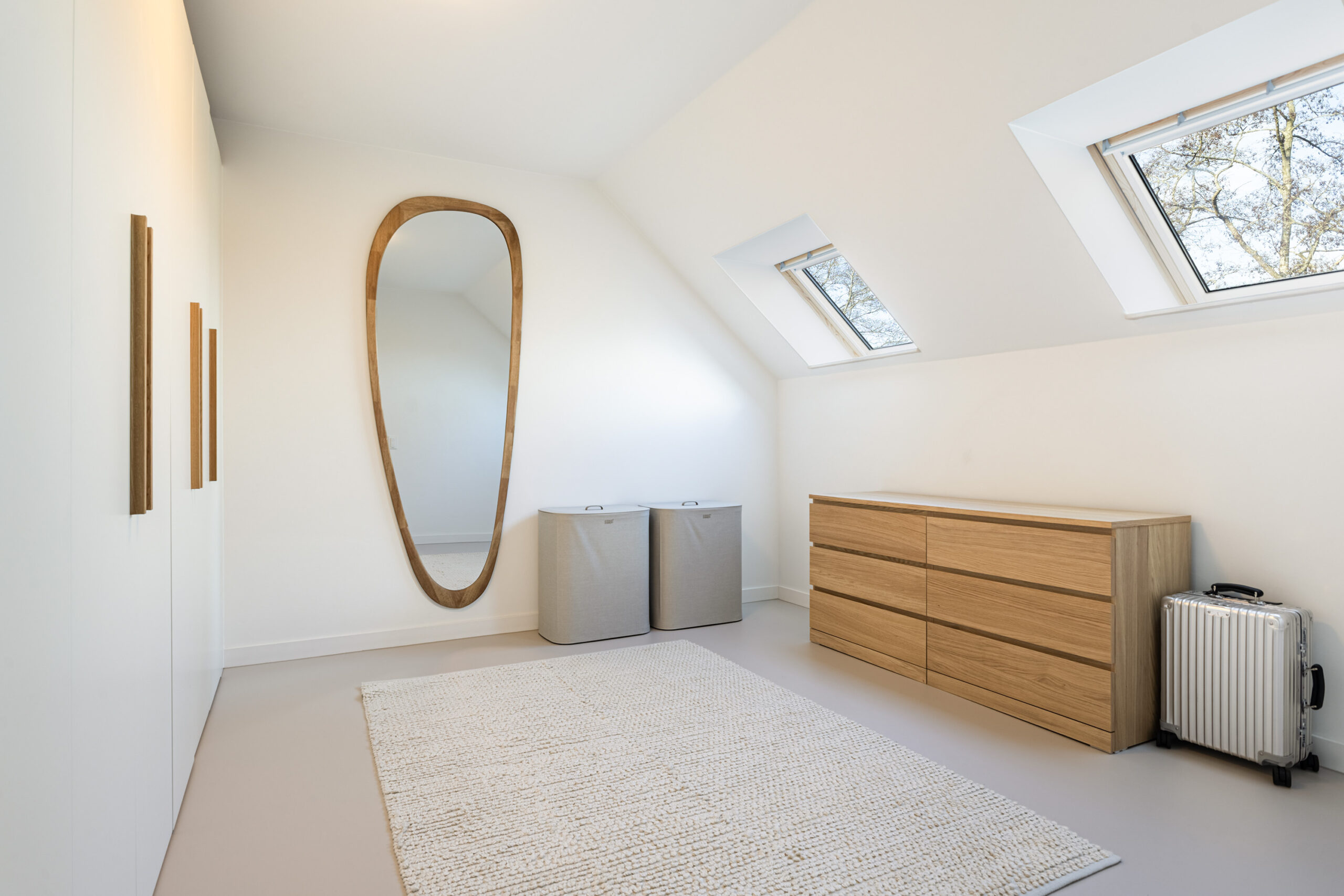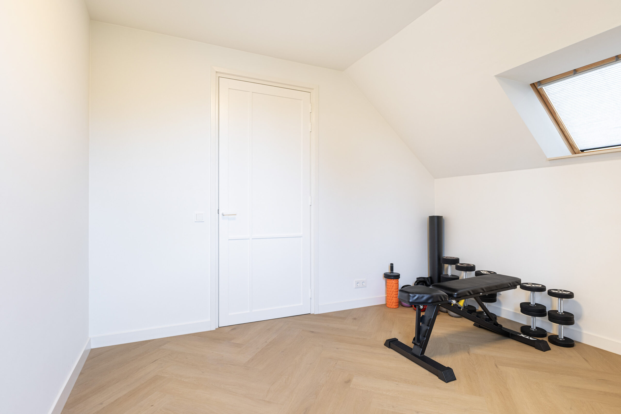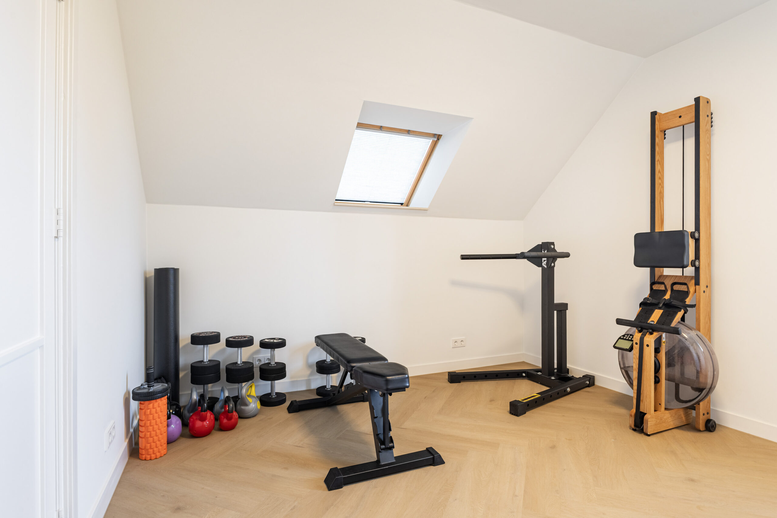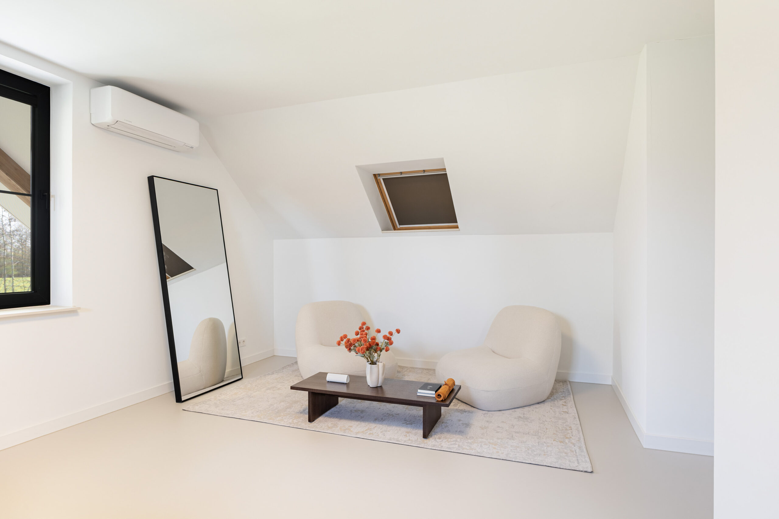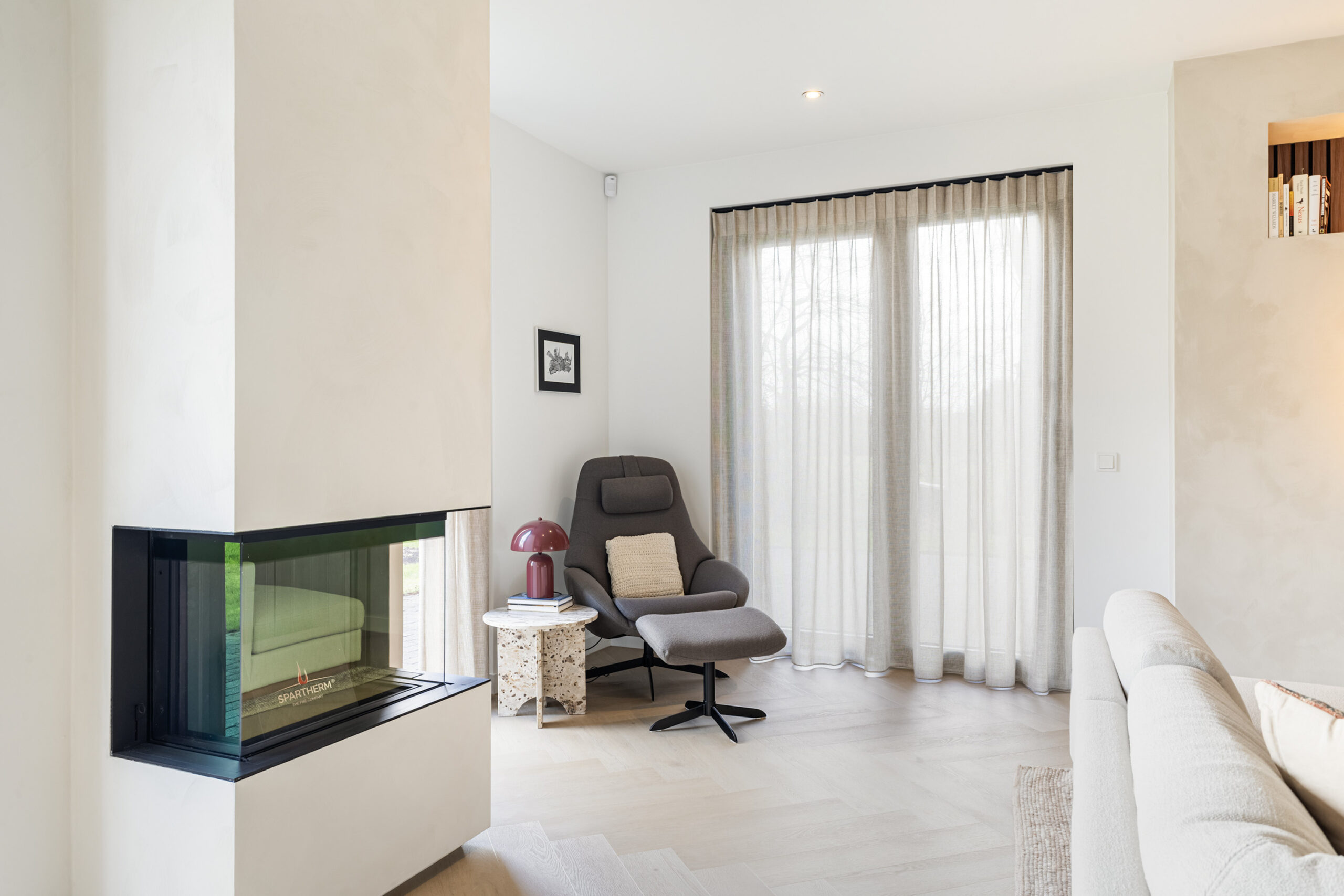 Binnen valt direct de rust en kwaliteit op. De afwerking is strak, modern en tot in detail verzorgd. De vloeren zijn vernieuwd met een combinatie van Belakos PVC en een PU gietvloer op de begane grond en PVC op de verdieping. Alle binnendeuren zijn vervangen door massieve deuren en diverse elementen, waaronder de trap en vensterbanken, zijn afgewerkt met Forcrete microcement.