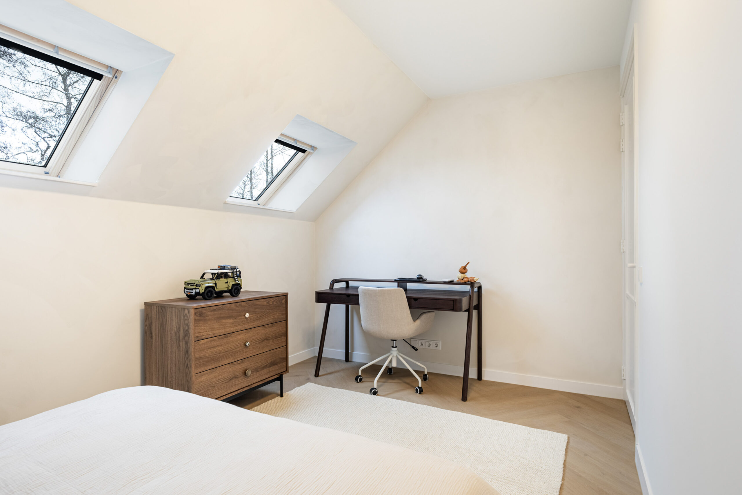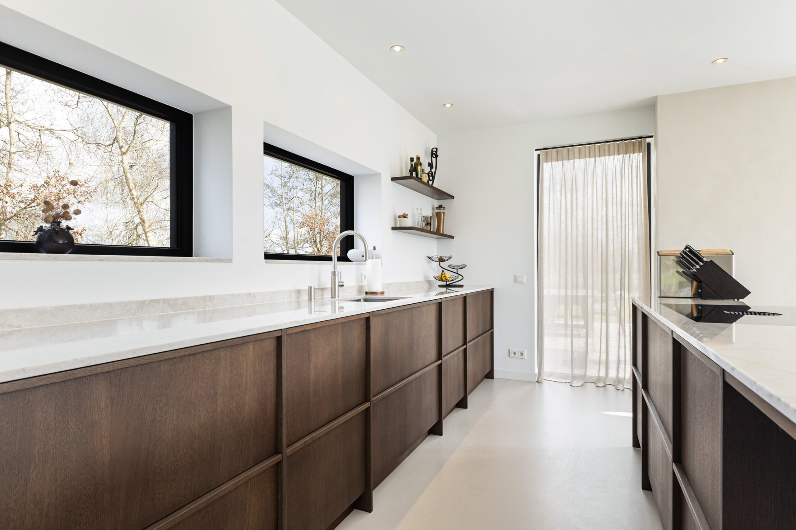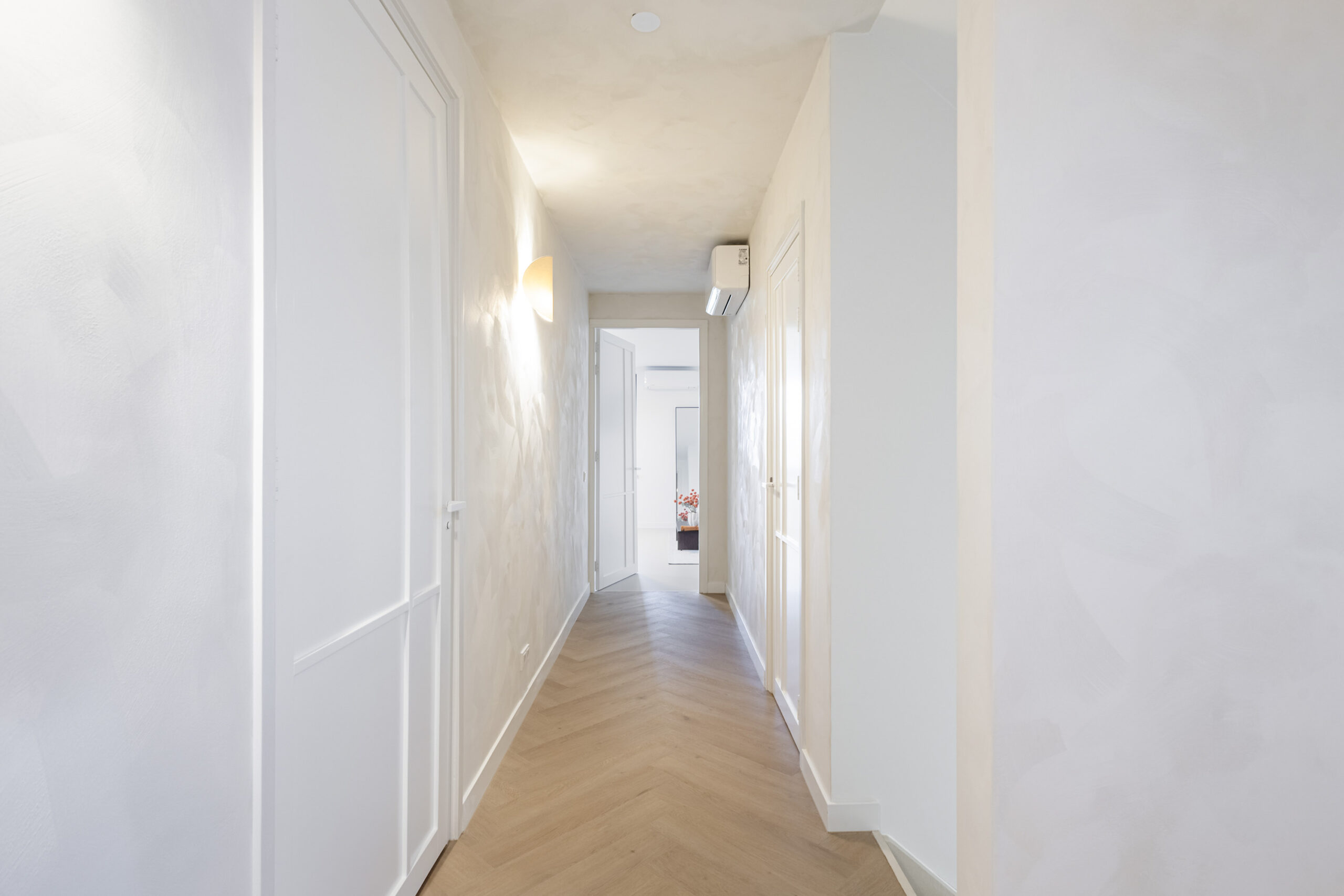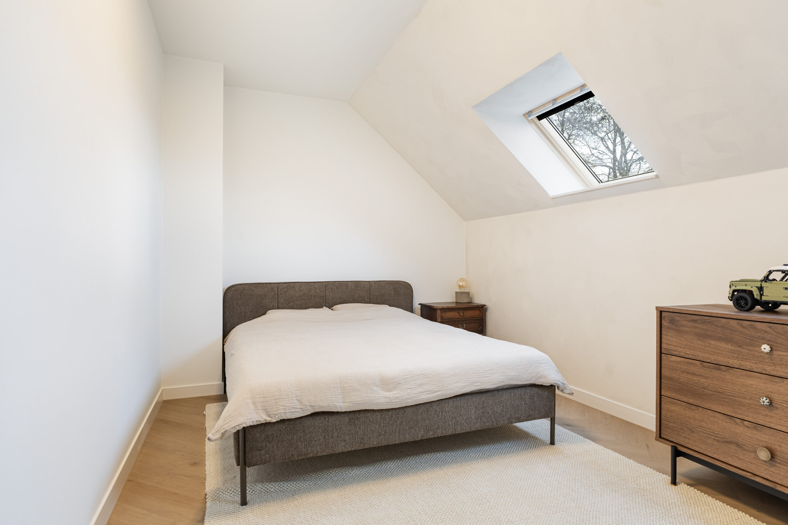 Binnen valt direct de rust en kwaliteit op. De afwerking is strak, modern en tot in detail verzorgd. De vloeren zijn vernieuwd met een combinatie van Belakos PVC en een PU gietvloer op de begane grond en PVC op de verdieping. Alle binnendeuren zijn vervangen door massieve deuren en diverse elementen, waaronder de trap en vensterbanken, zijn afgewerkt met Forcrete microcement.