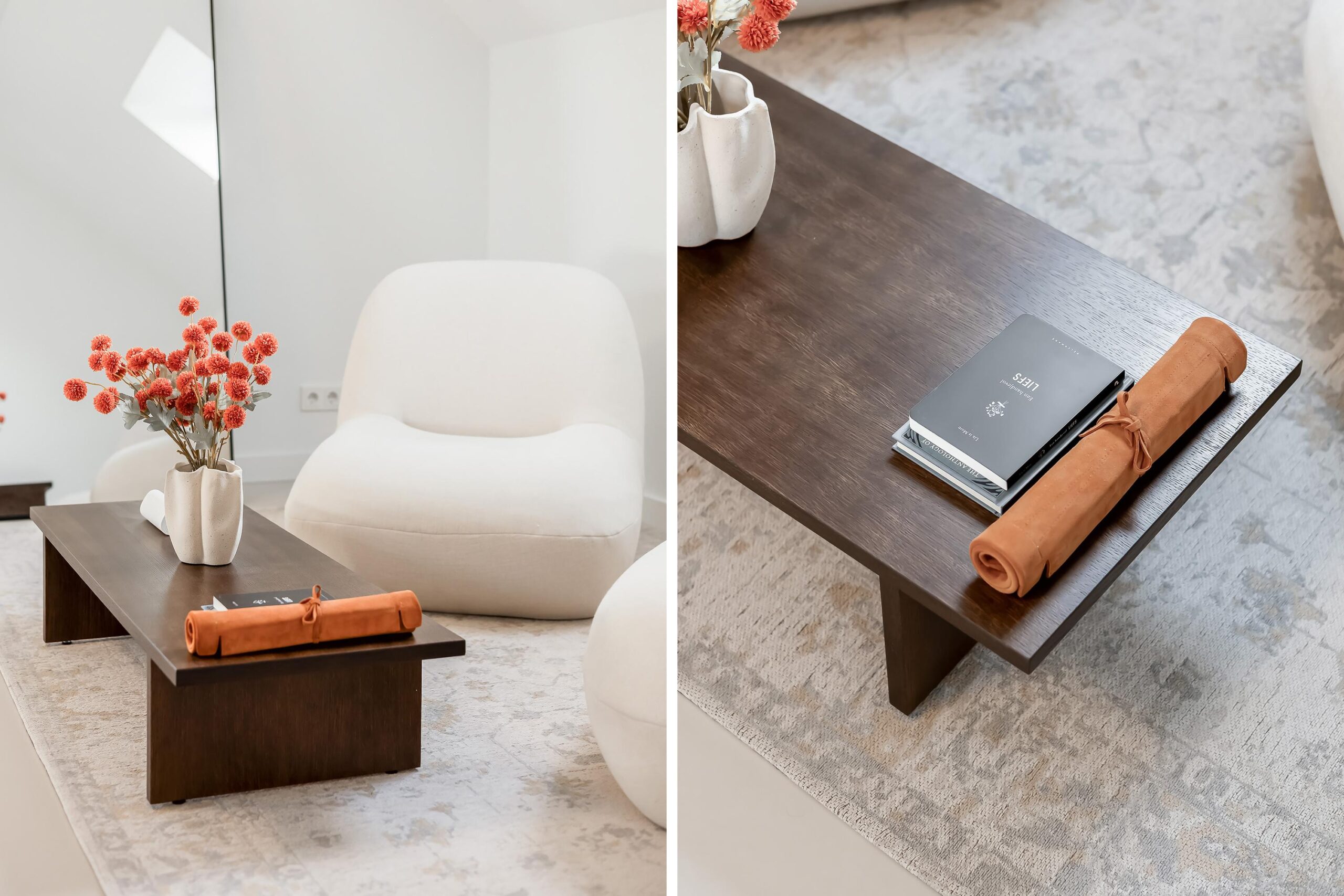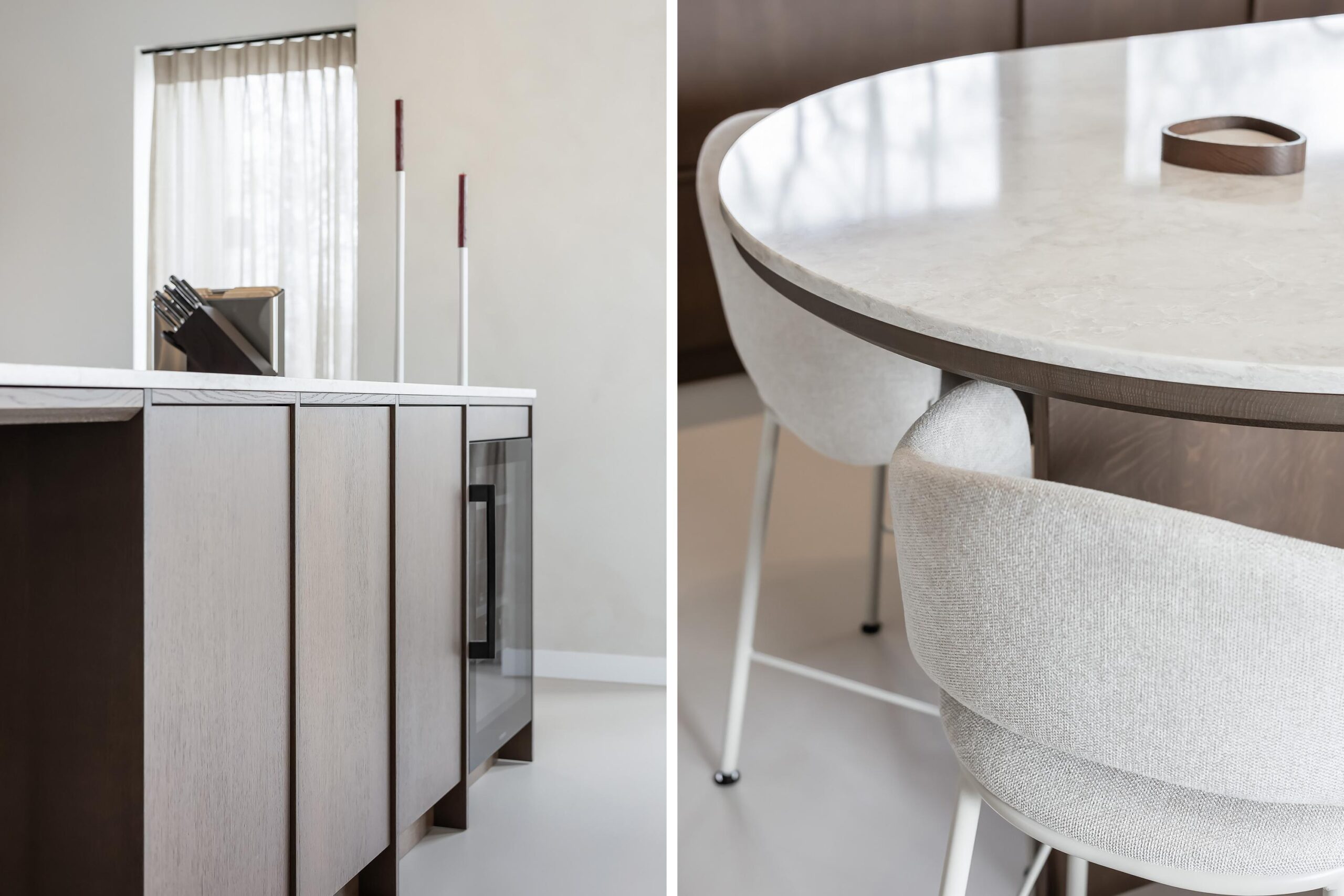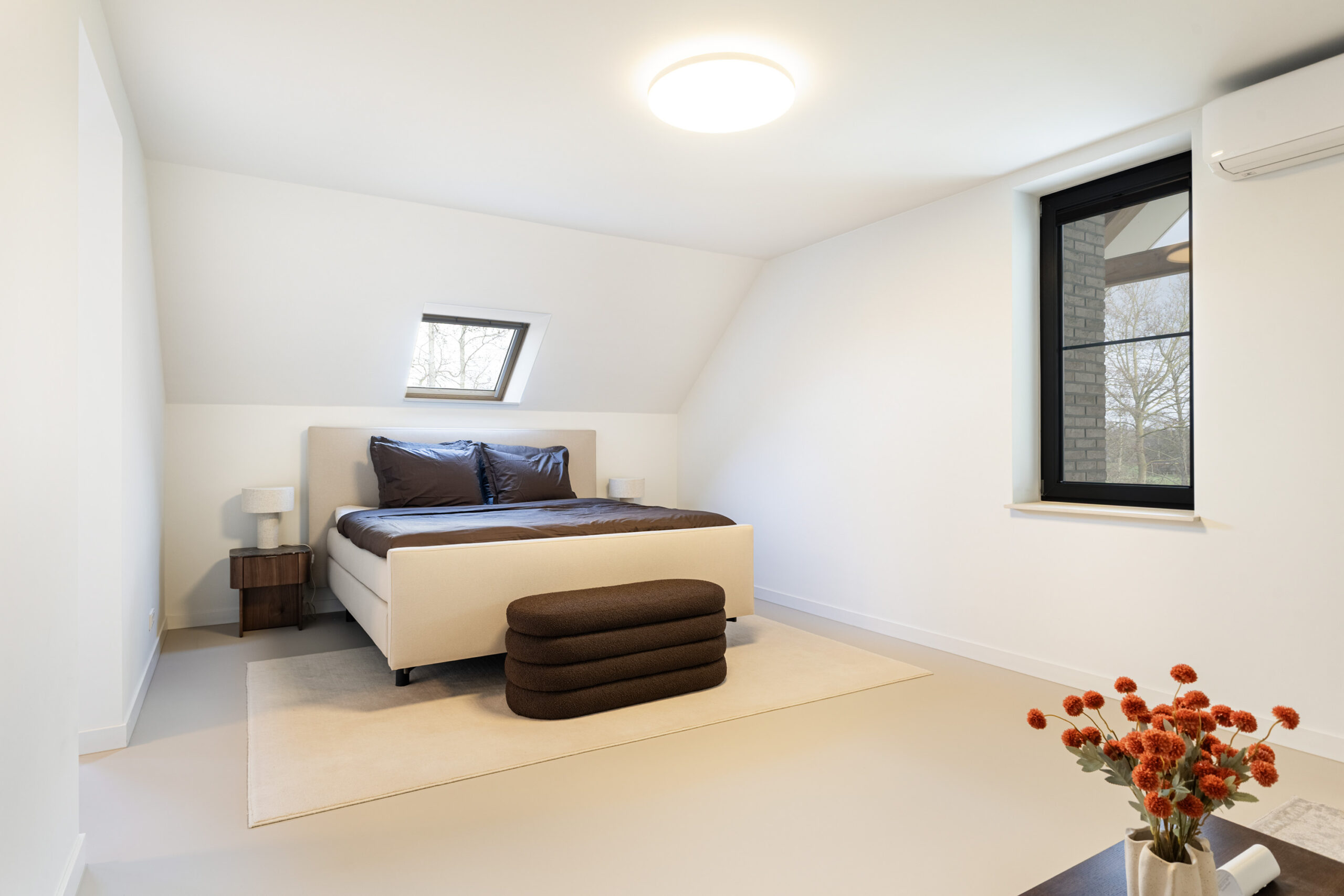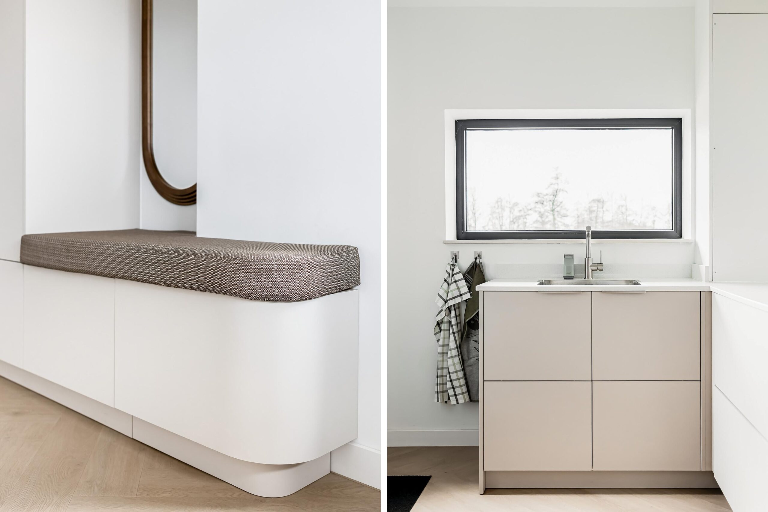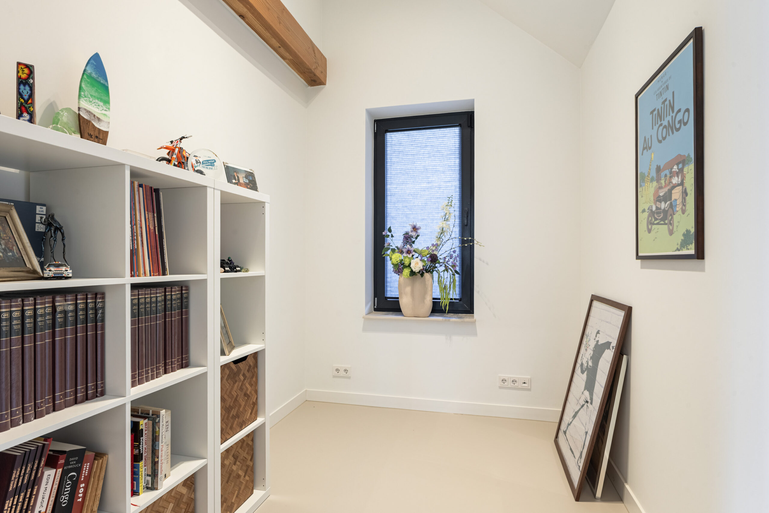 Binnen valt direct de rust en kwaliteit op. De afwerking is strak, modern en tot in detail verzorgd. De vloeren zijn vernieuwd met een combinatie van Belakos PVC en een PU gietvloer op de begane grond en PVC op de verdieping. Alle binnendeuren zijn vervangen door massieve deuren en diverse elementen, waaronder de trap en vensterbanken, zijn afgewerkt met Forcrete microcement.