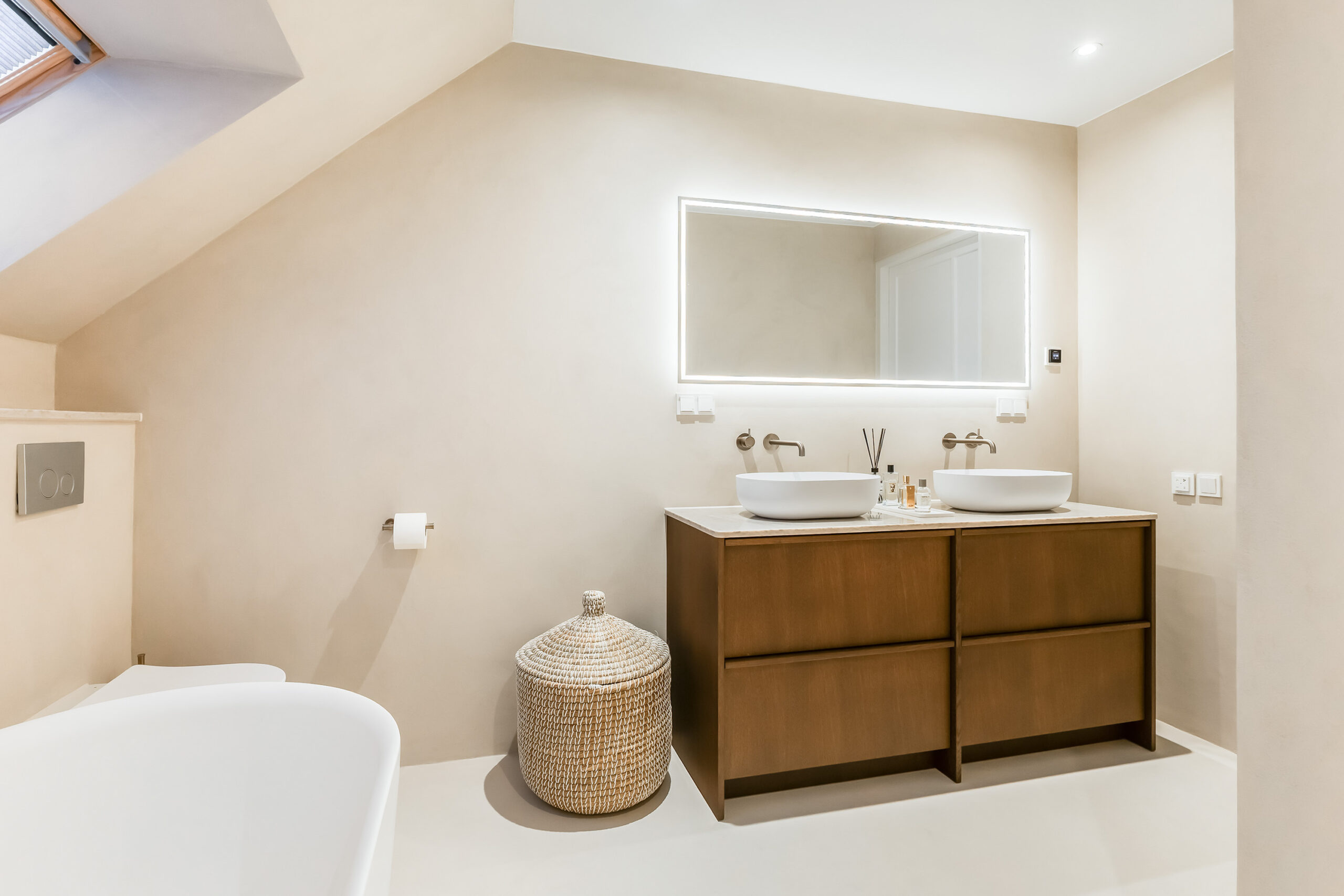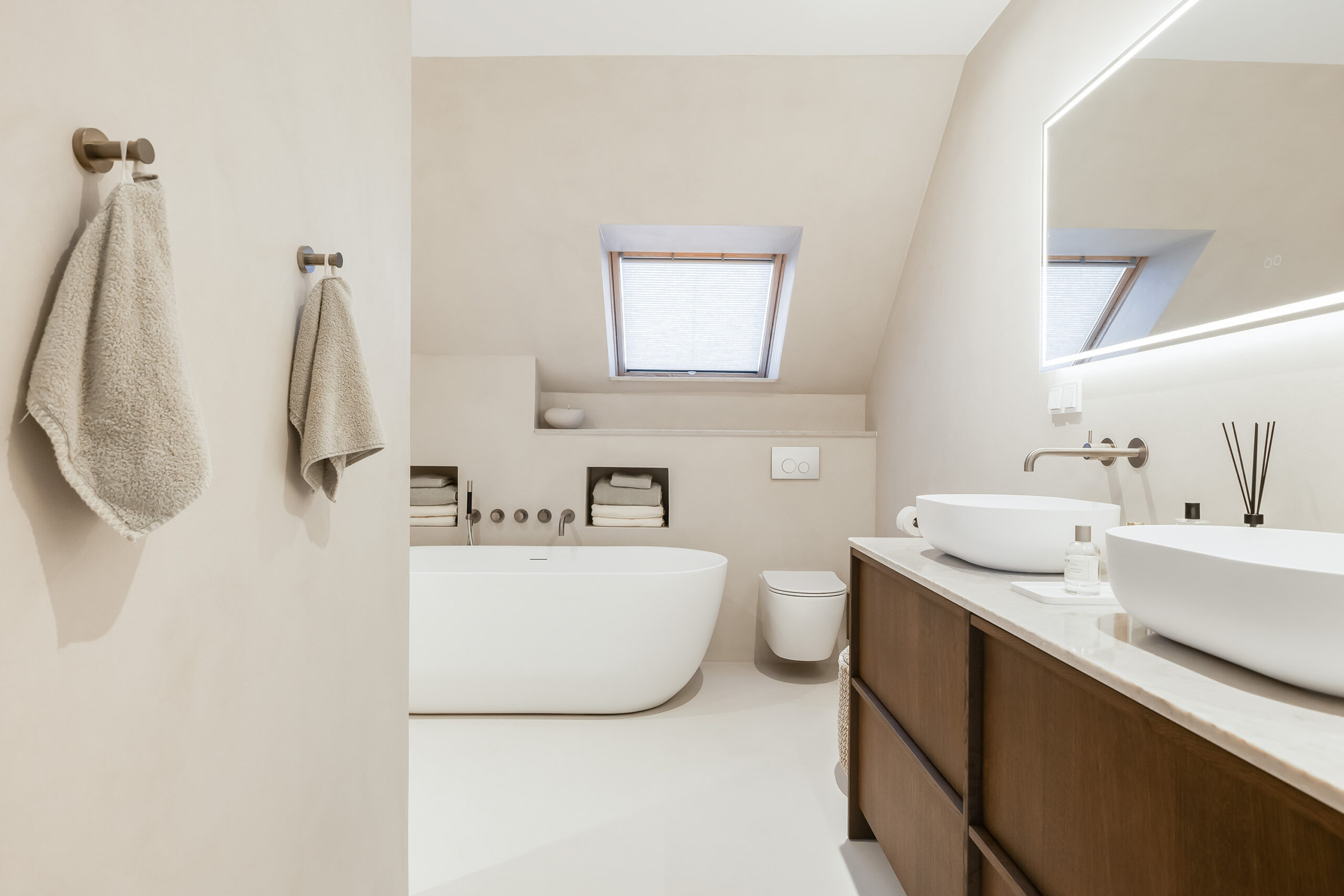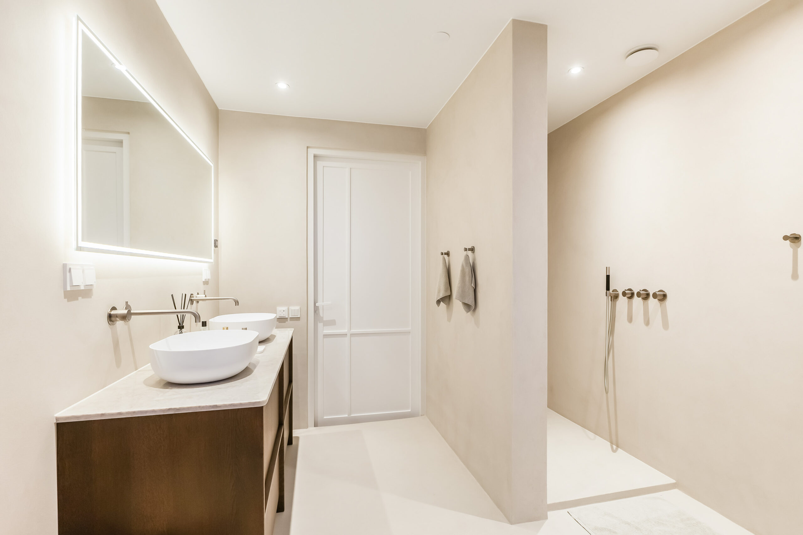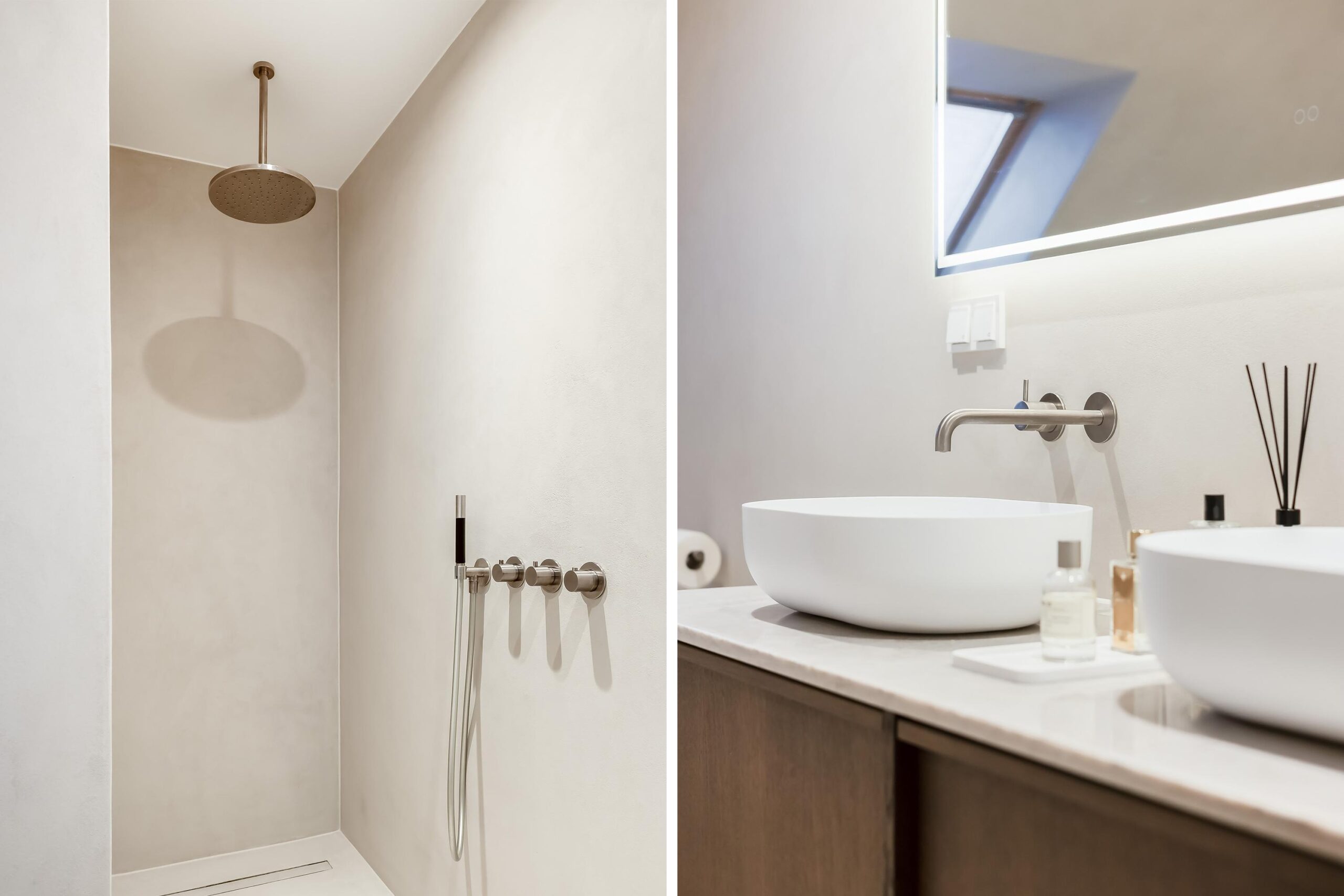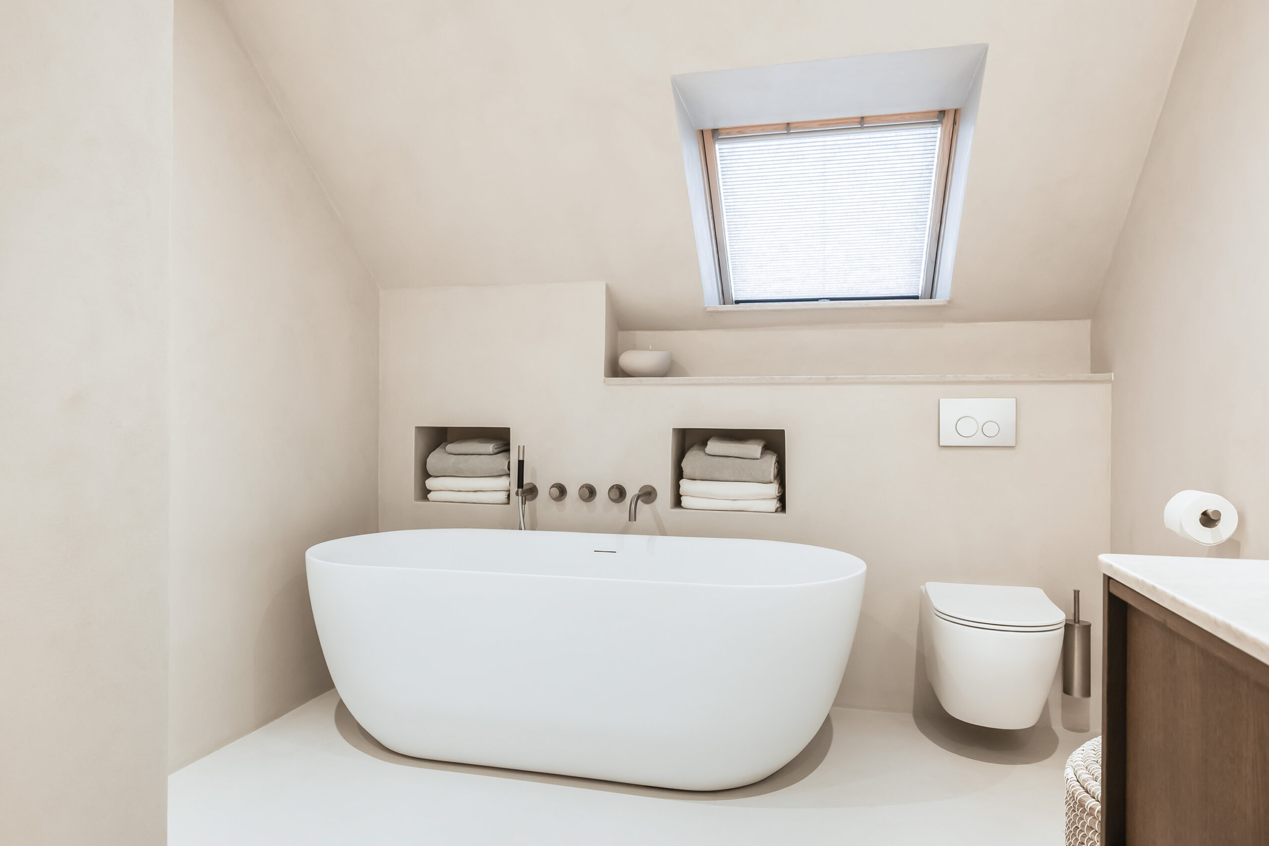 De badkamer is eveneens in 2025 volledig vernieuwd en uitgevoerd in microcement, met hoogwaardige Hotbath Cobber kranen en een rustige, luxe uitstraling. Ook het toilet op de begane grond is in dezelfde stijl afgewerkt.