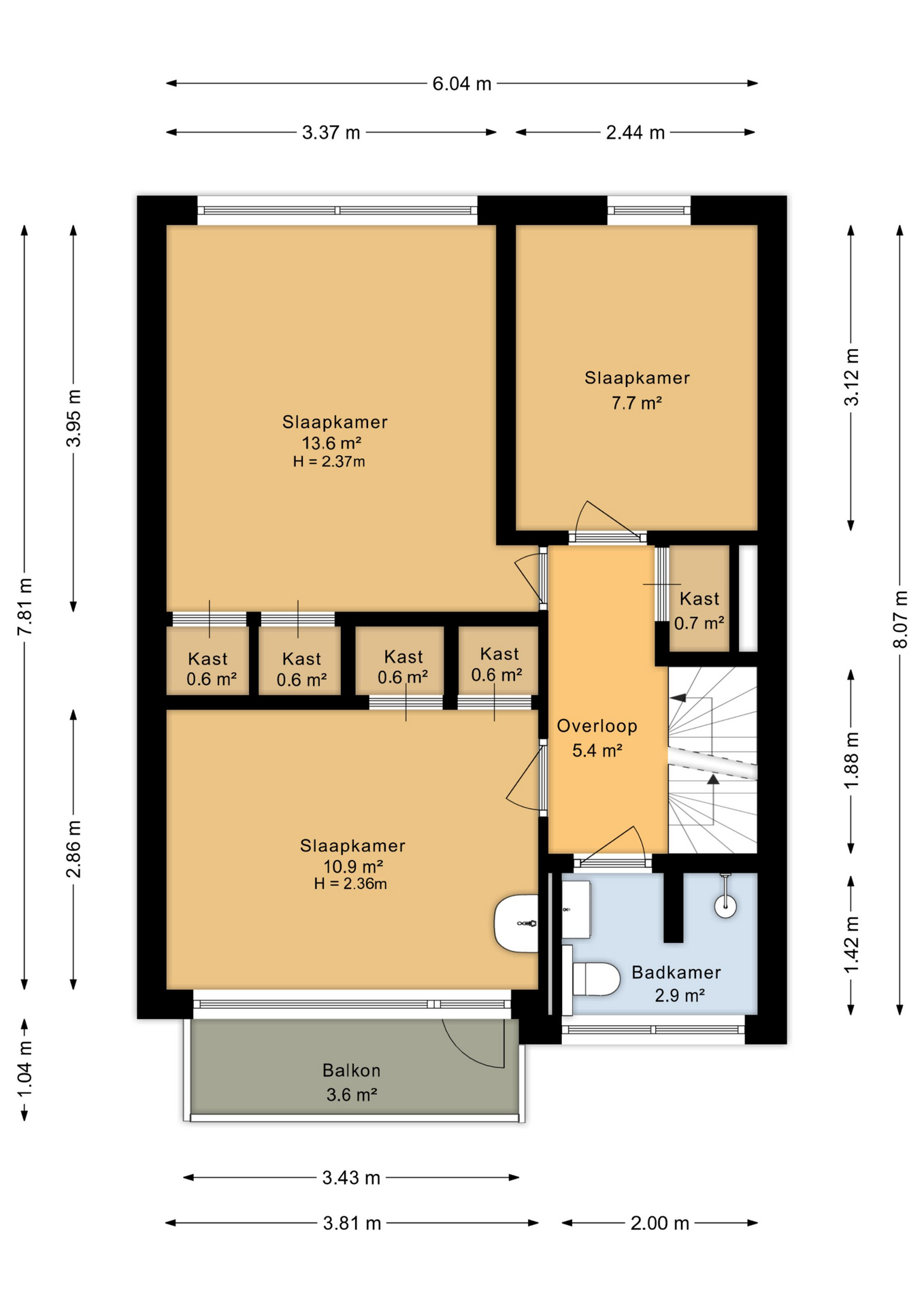Op de eerste verdieping bevindt zich de overloop met een praktische bergkast. Deze verdieping beschikt over drie slaapkamers, waarvan twee met vaste kastruimte. De slaapkamer aan de voorzijde heeft bovendien een eigen wastafel en toegang tot het balkon. De badkamer is uitgerust met een douche, toilet en een modern wastafelmeubel.