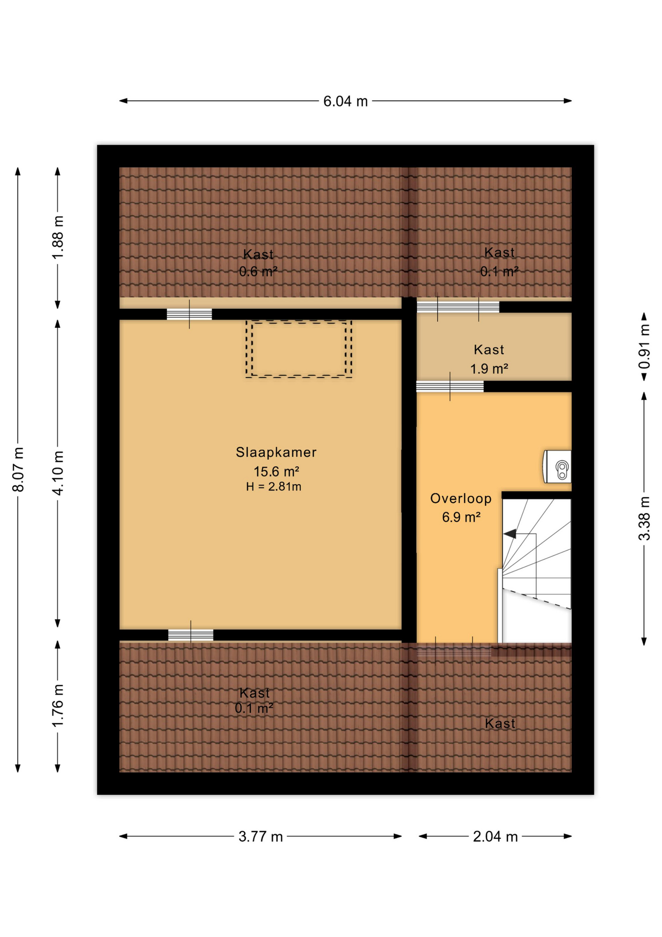 De tweede verdieping, bereikbaar via vaste trap, biedt een overloop met extra bergruimte en een vierde slaapkamer. Dankzij het dakraam is dit een volwaardige en lichte kamer.