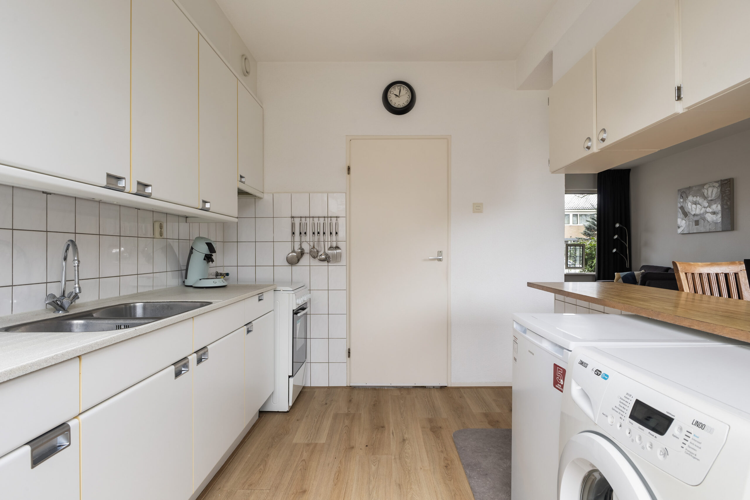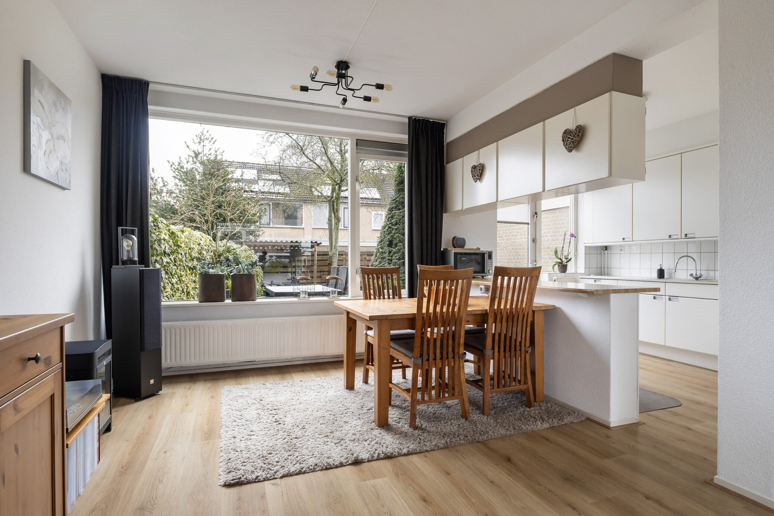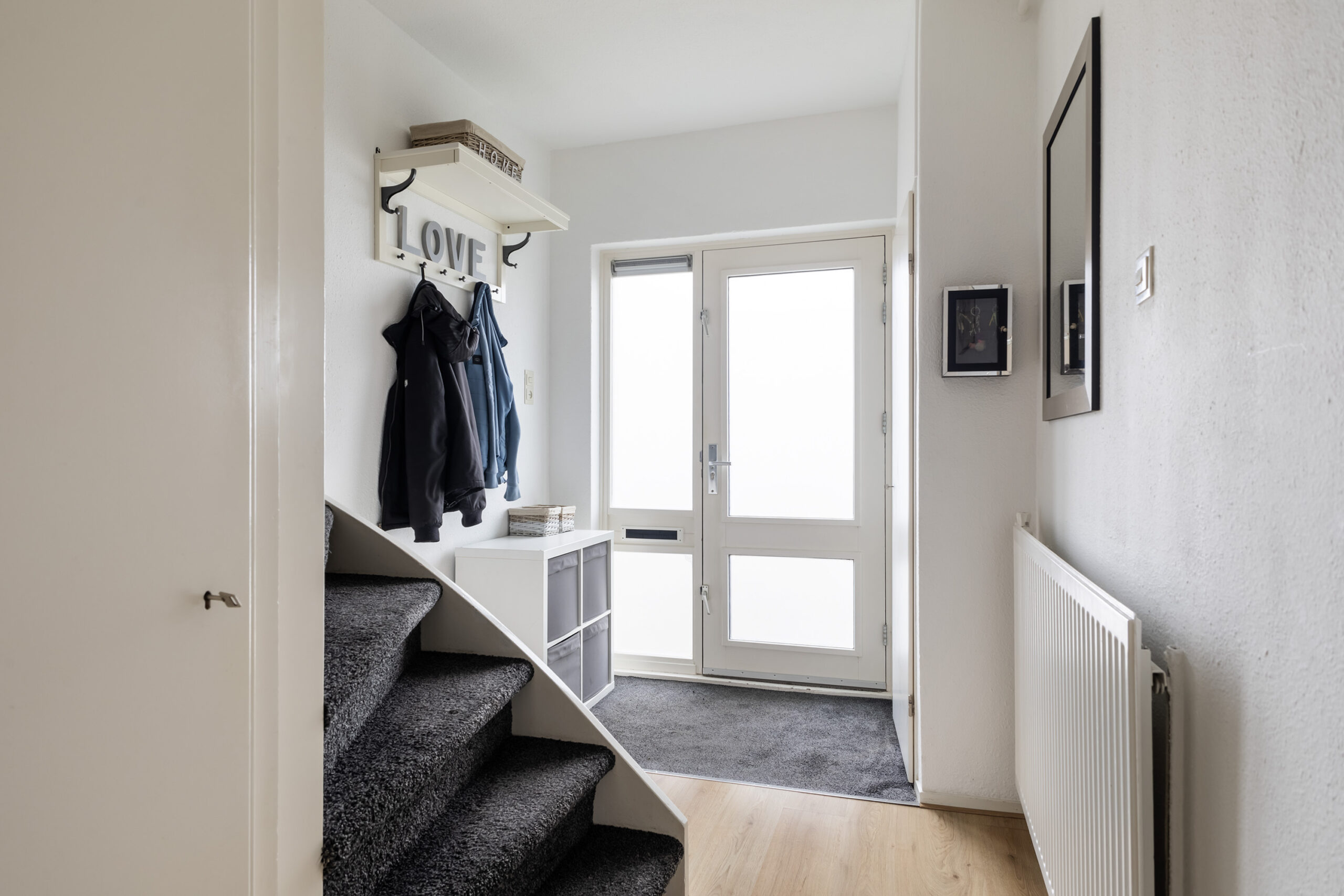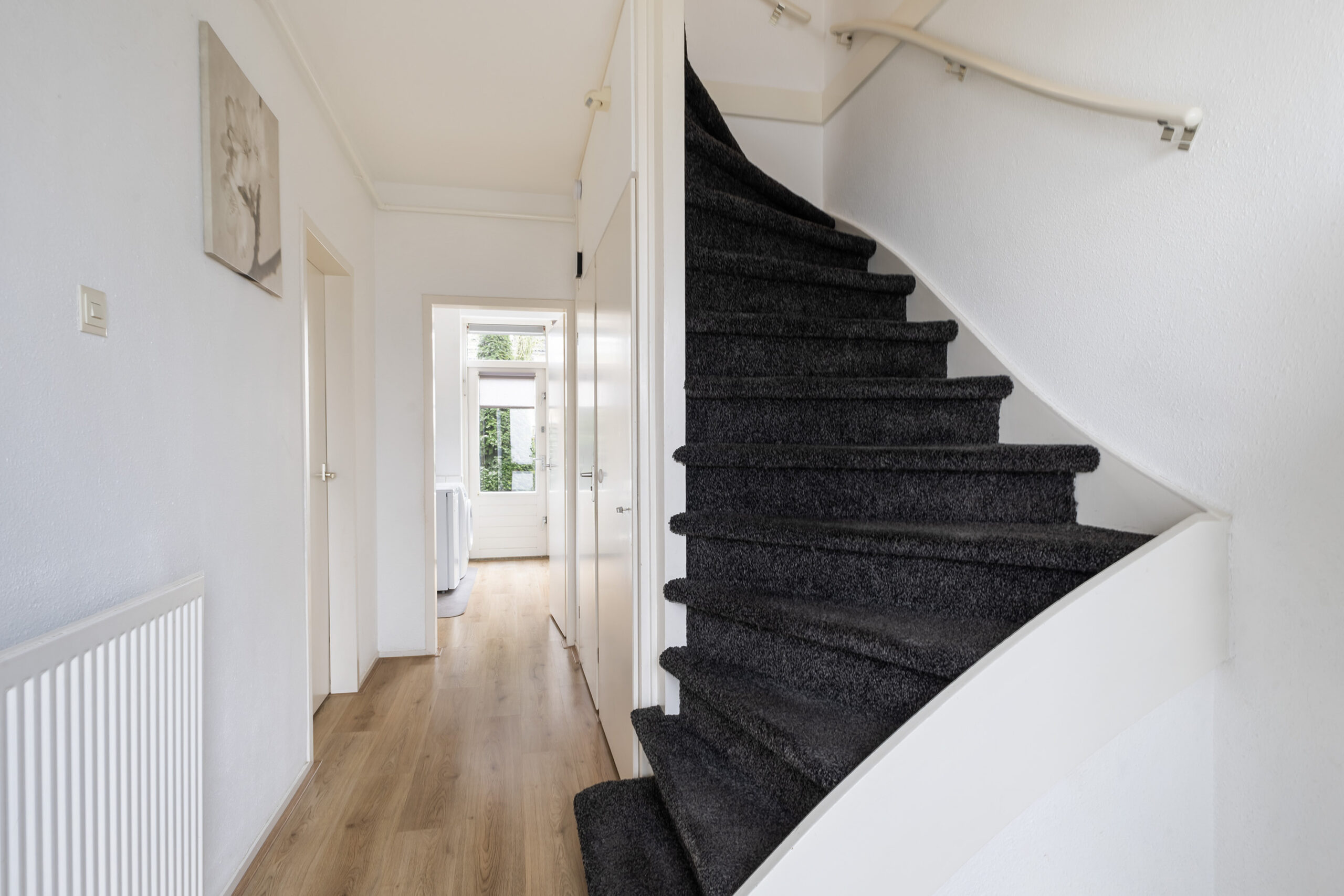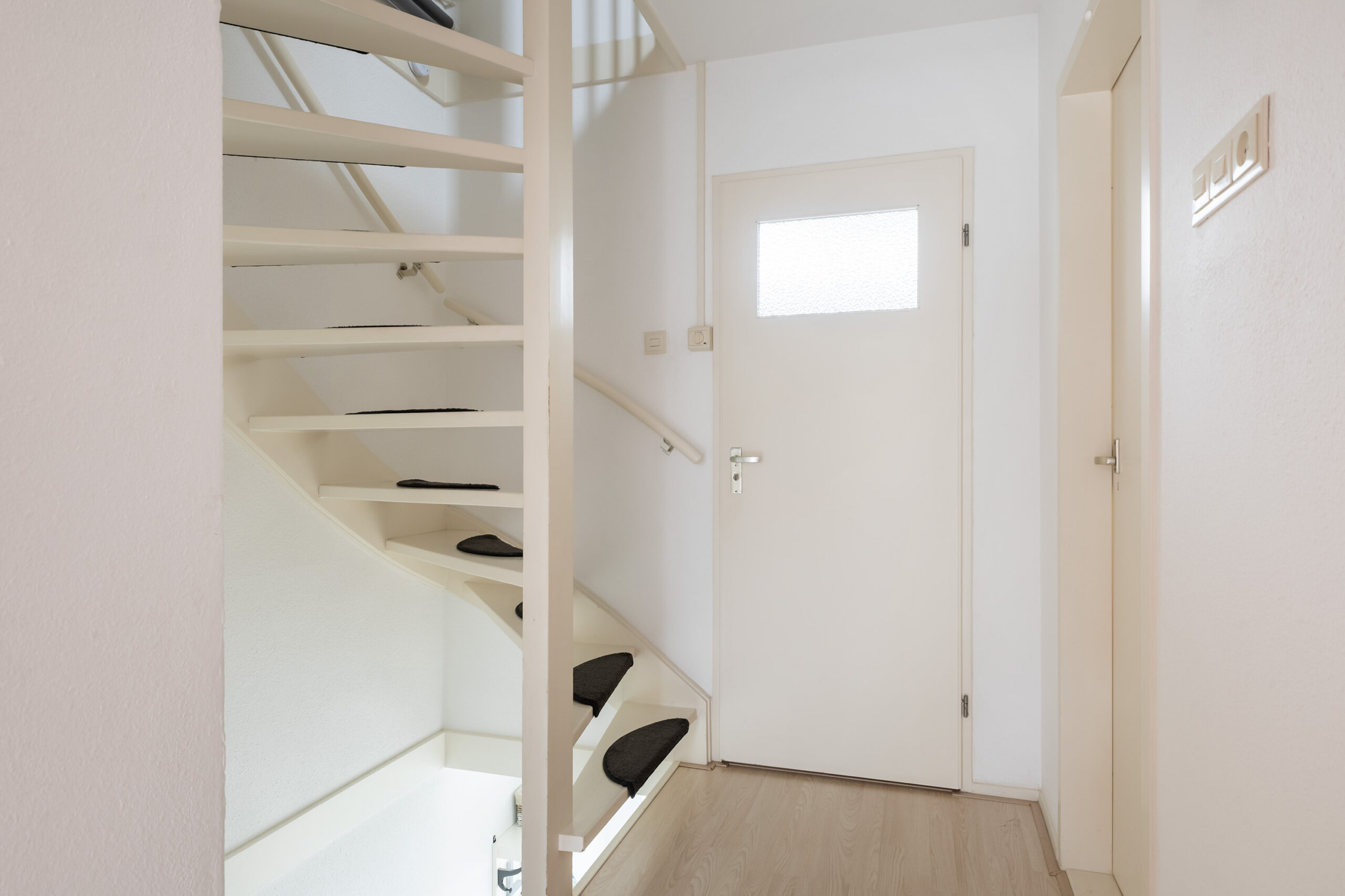 Via de entree kom je in de ruime hal met meterkast, provisiekast, toilet met fonteintje en de trapopgang naar de eerste verdieping. Vanuit de hal bereik je de lichte woonkamer, die dankzij de grote raampartijen profiteert van veel daglicht. De halfopen keuken sluit aan op de woonkamer en biedt directe toegang tot de achtertuin.