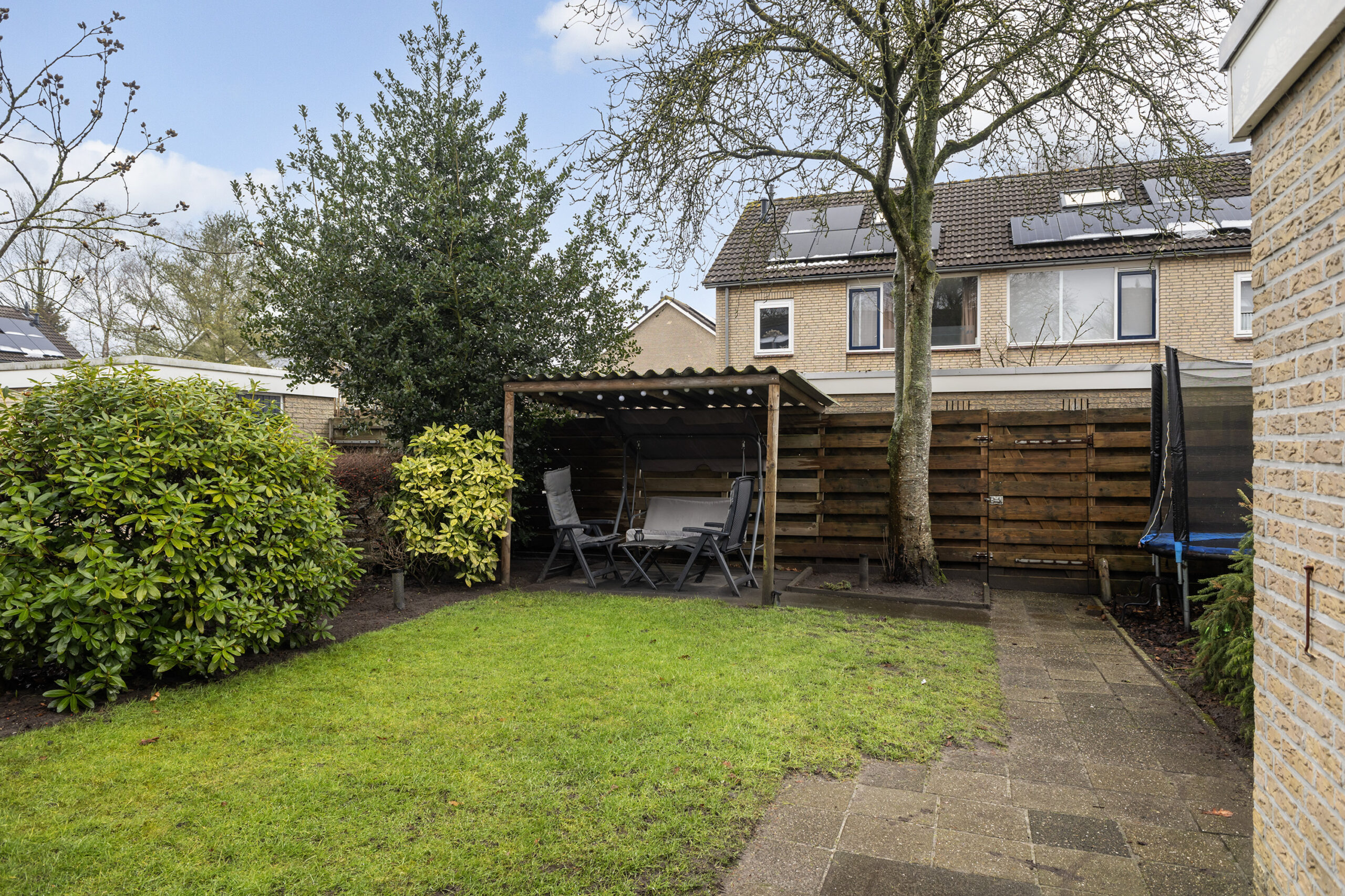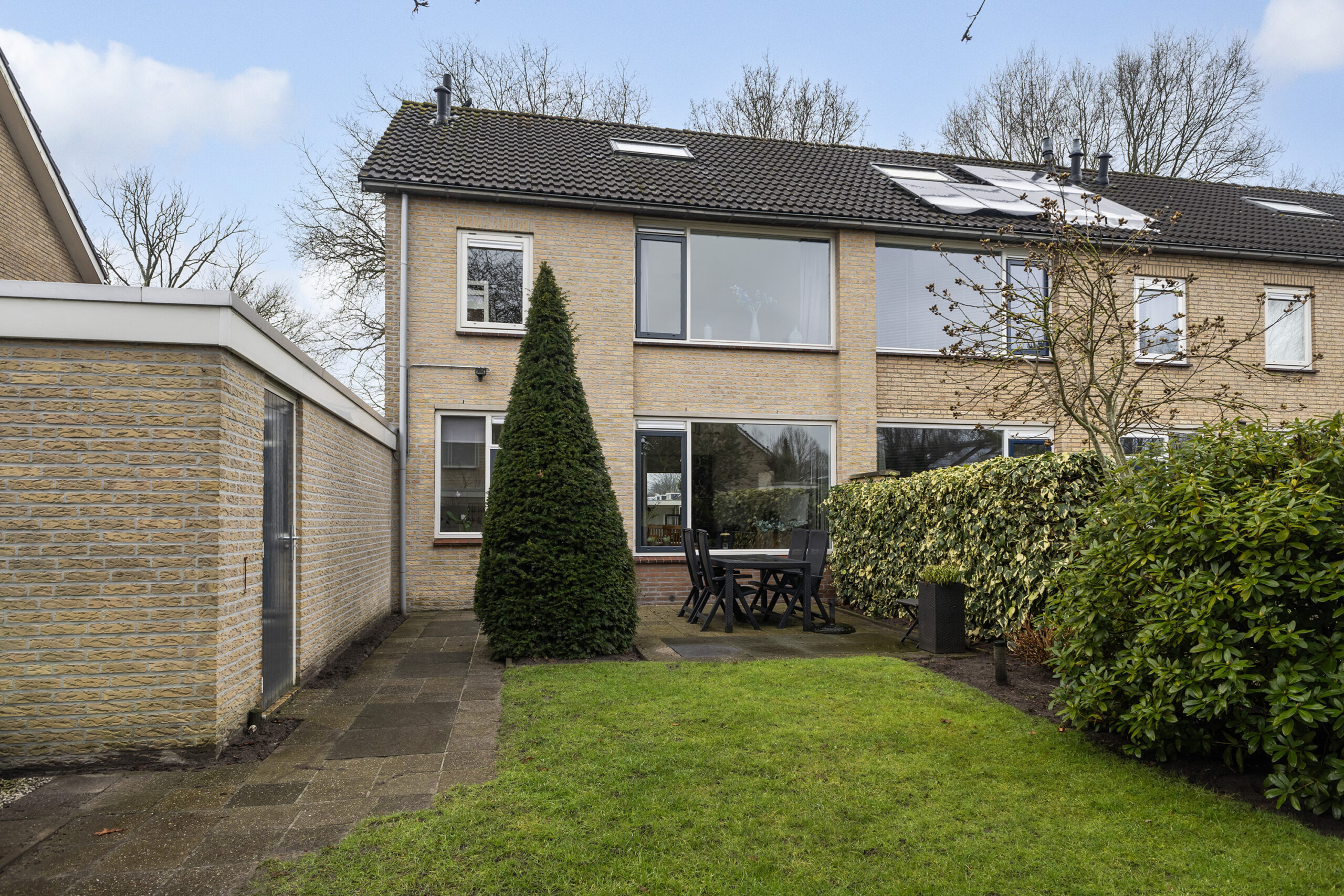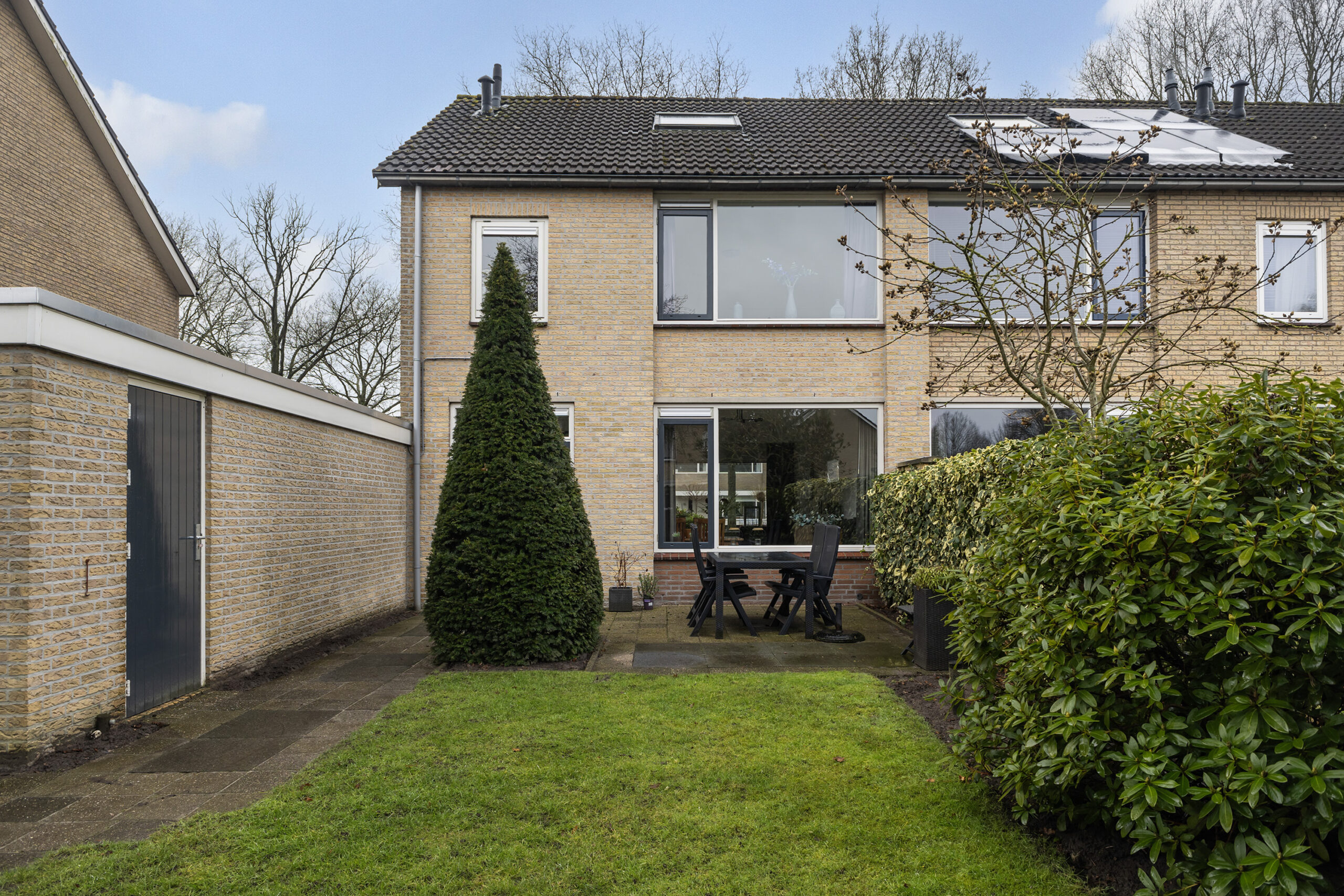 De achtertuin is netjes aangelegd en voorzien van een combinatie van gazon en terras. Daarnaast beschikt de woning over een eigen oprit met garage.