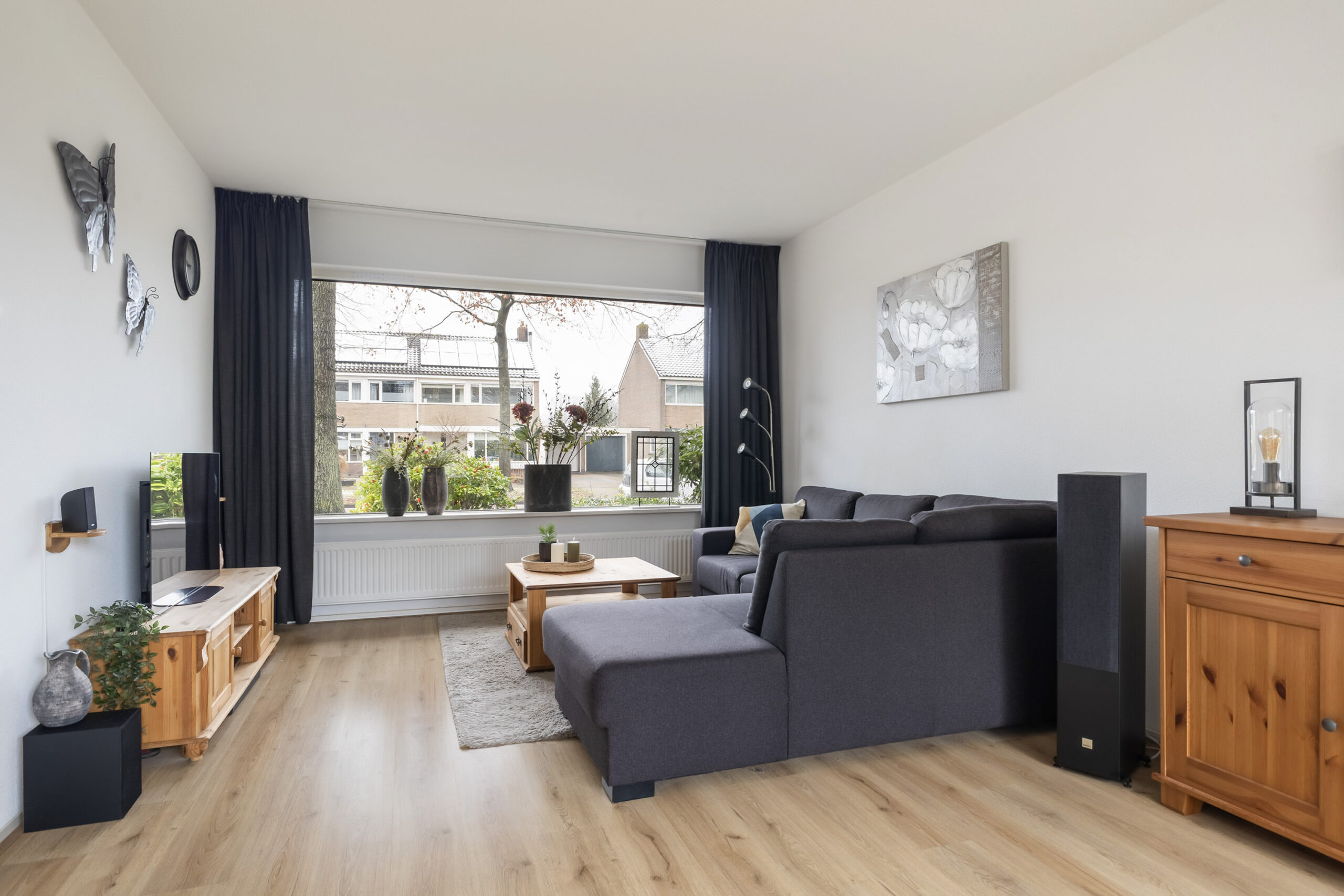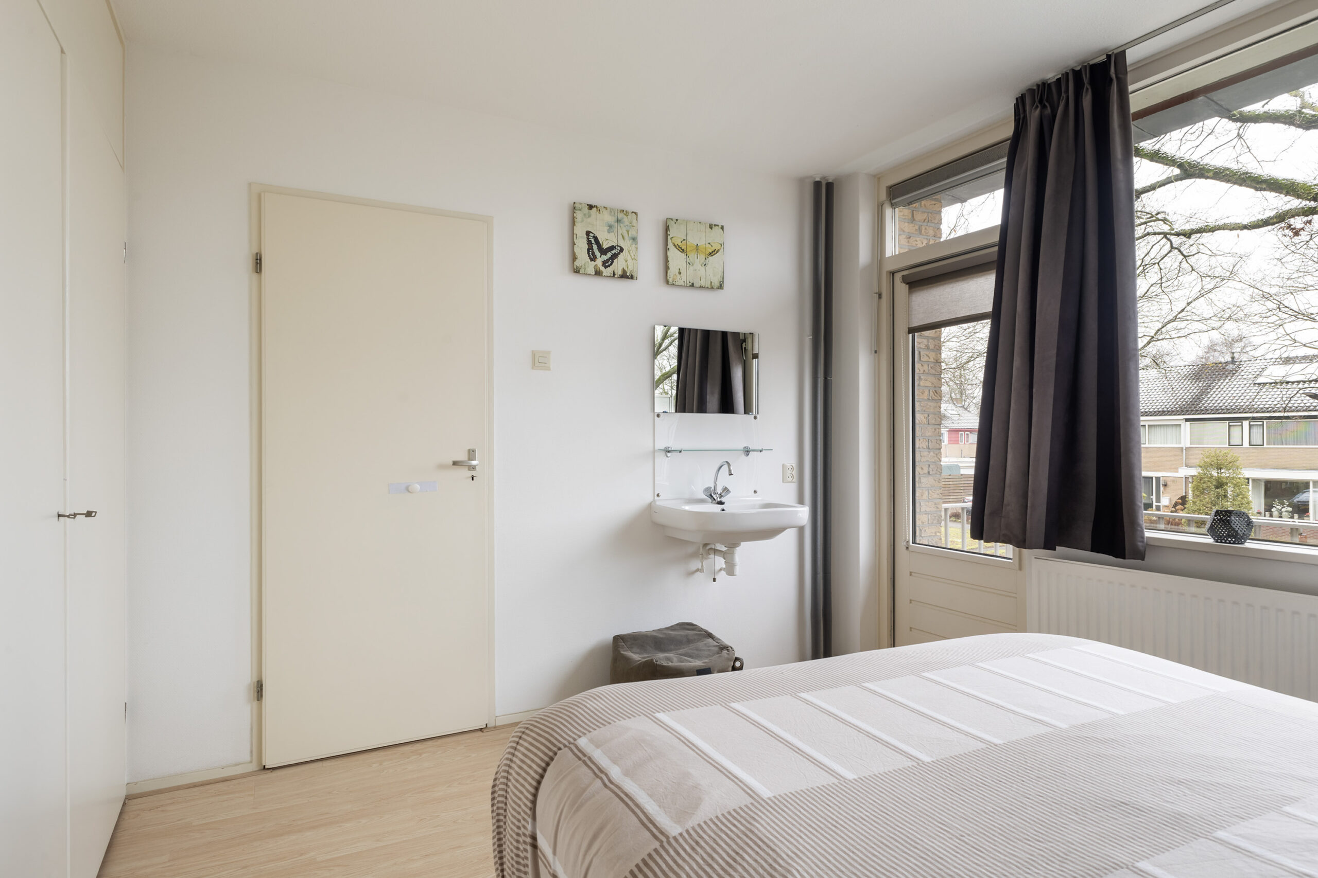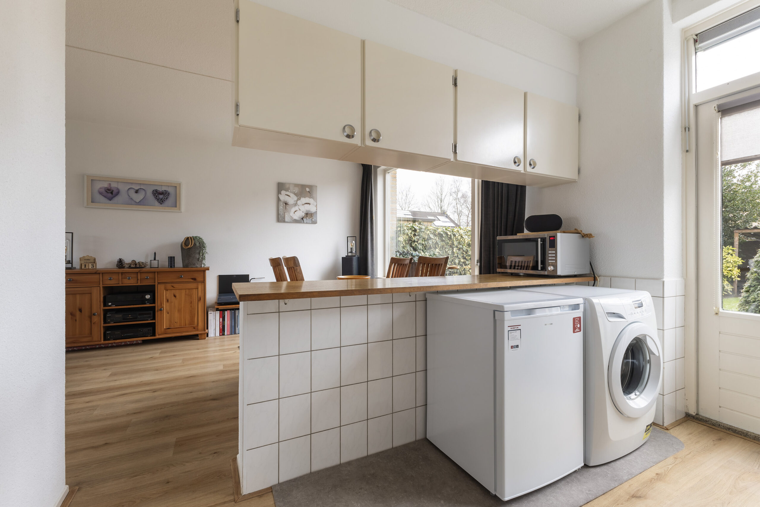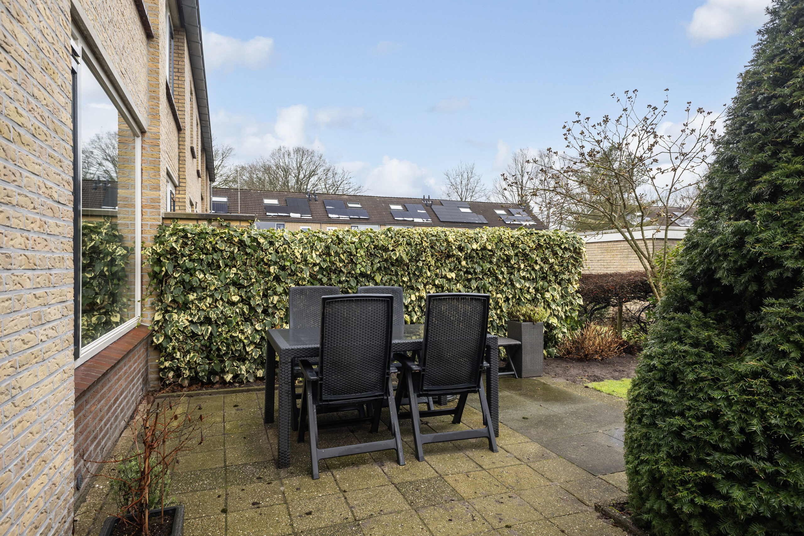 De achtertuin is netjes aangelegd en voorzien van een combinatie van gazon en terras. Daarnaast beschikt de woning over een eigen oprit met garage.