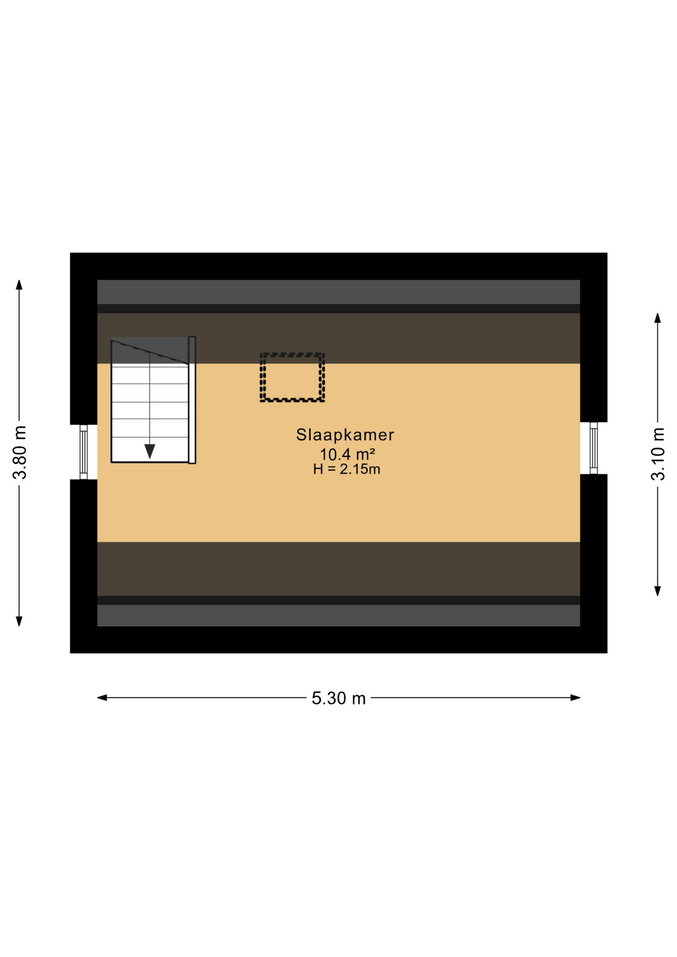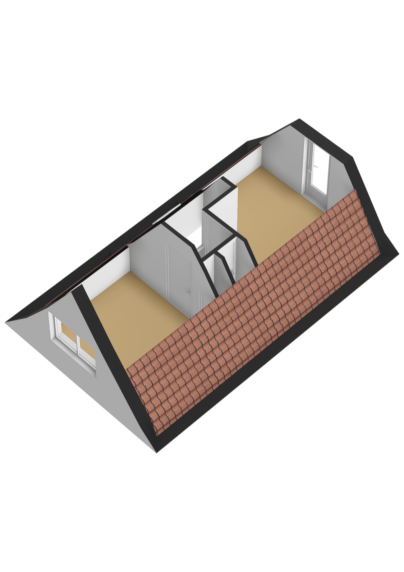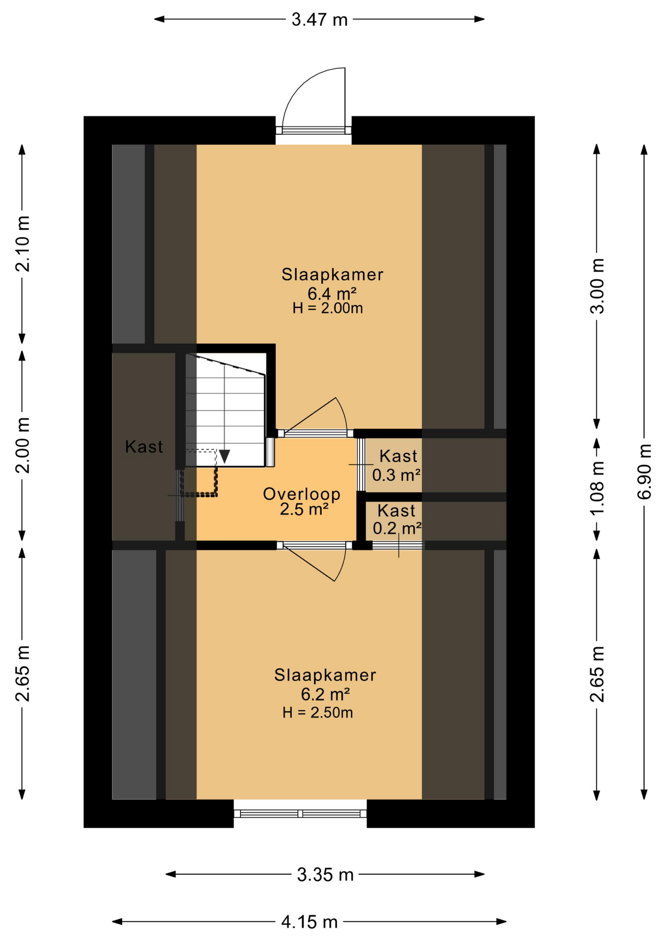 Eerste verdieping: Overloop met bergruimte en twee slaapkamers, waarvan één met toegang tot het platte dak.