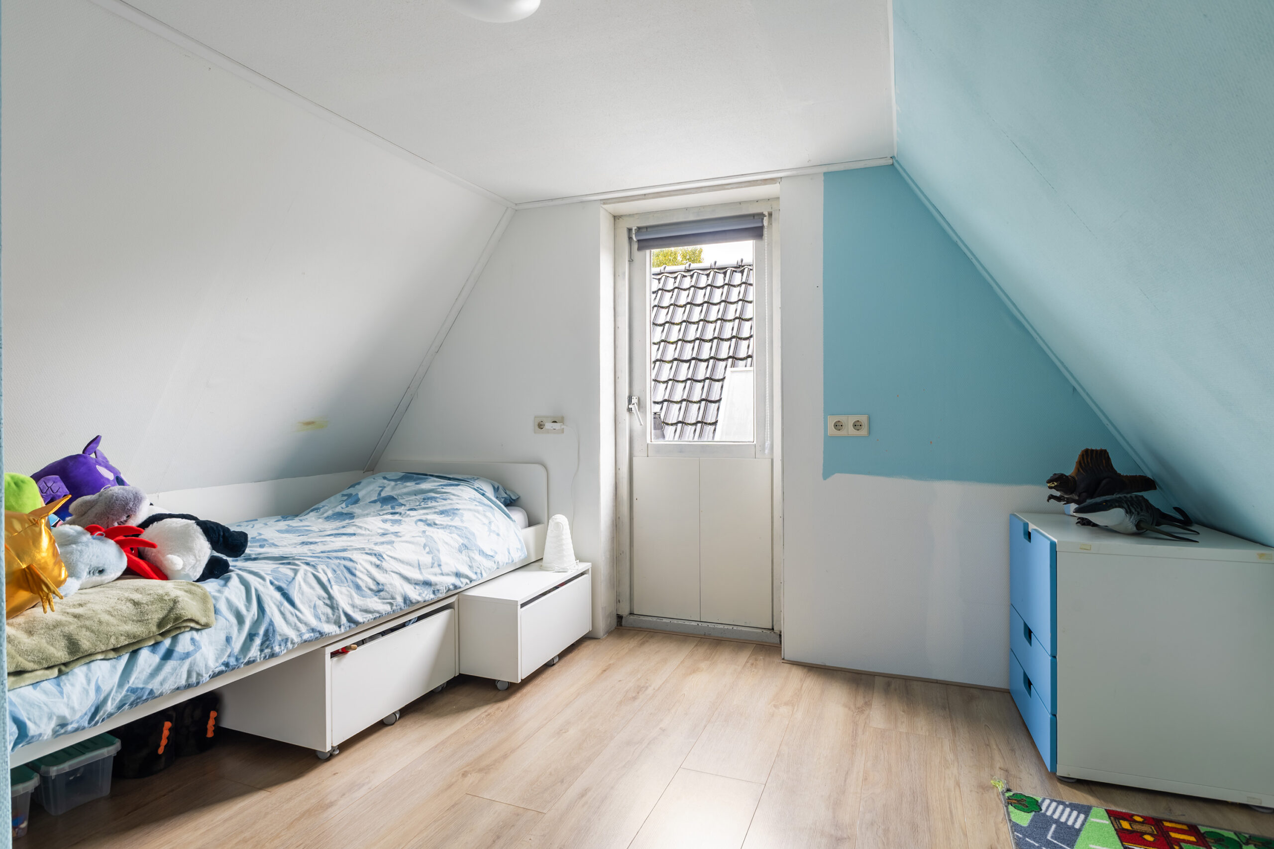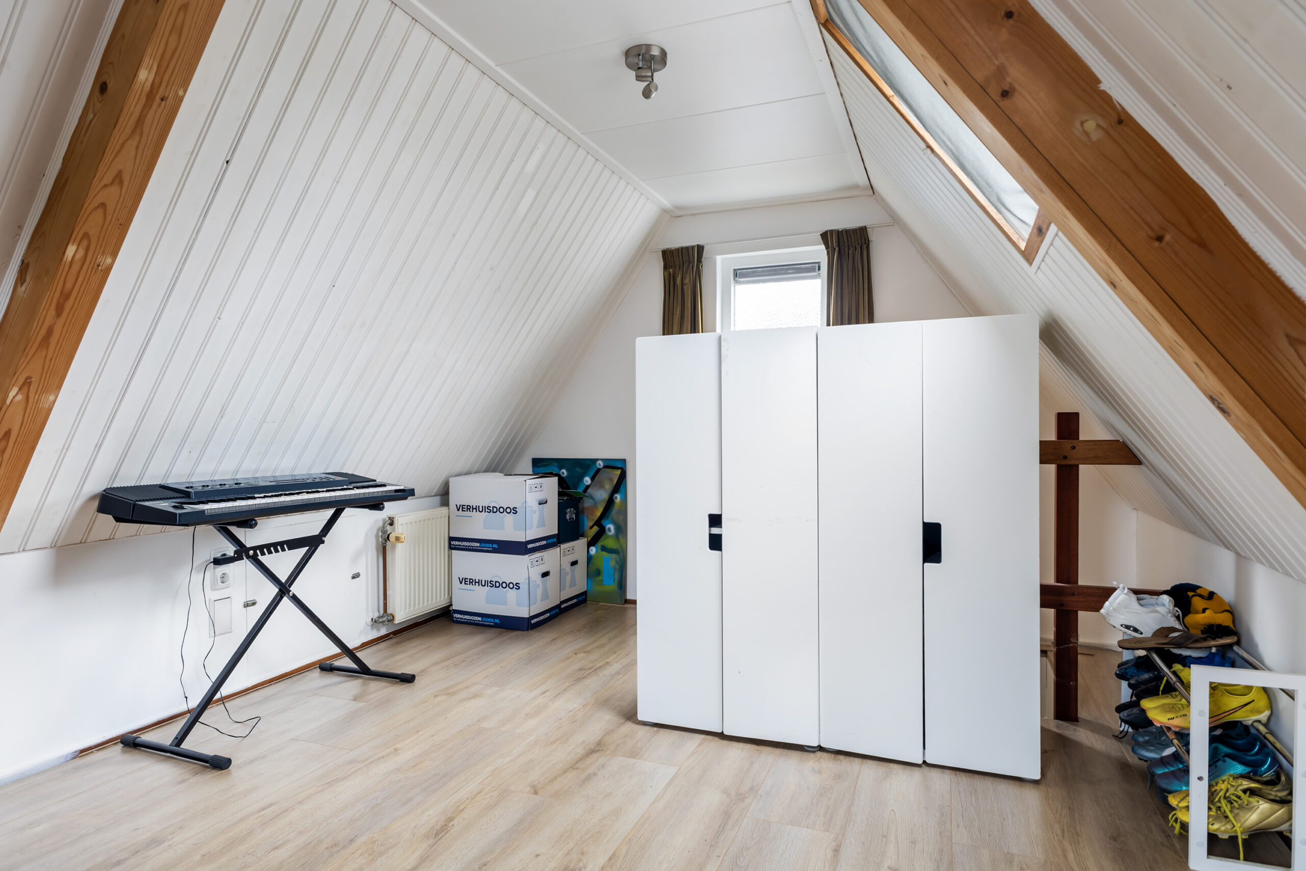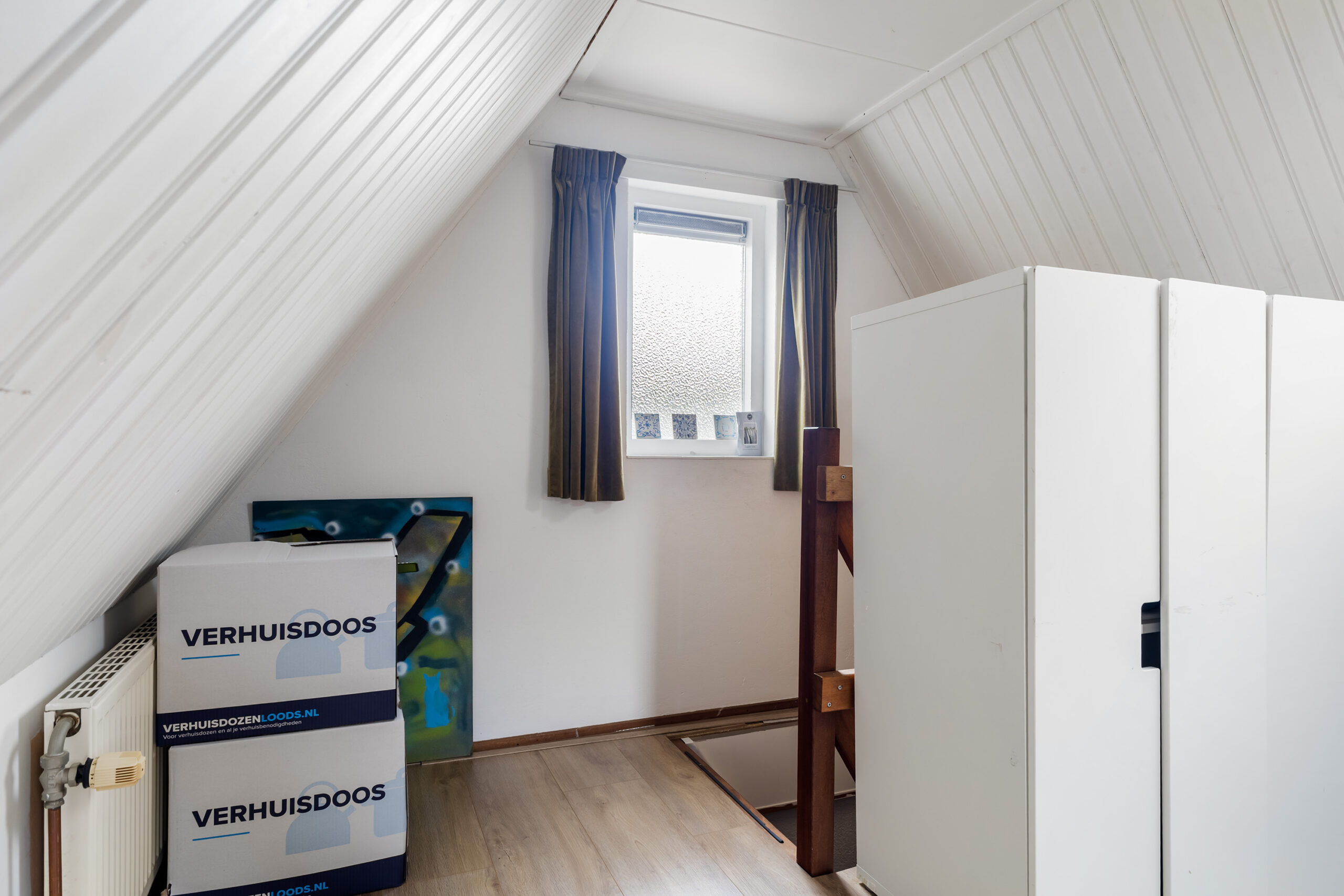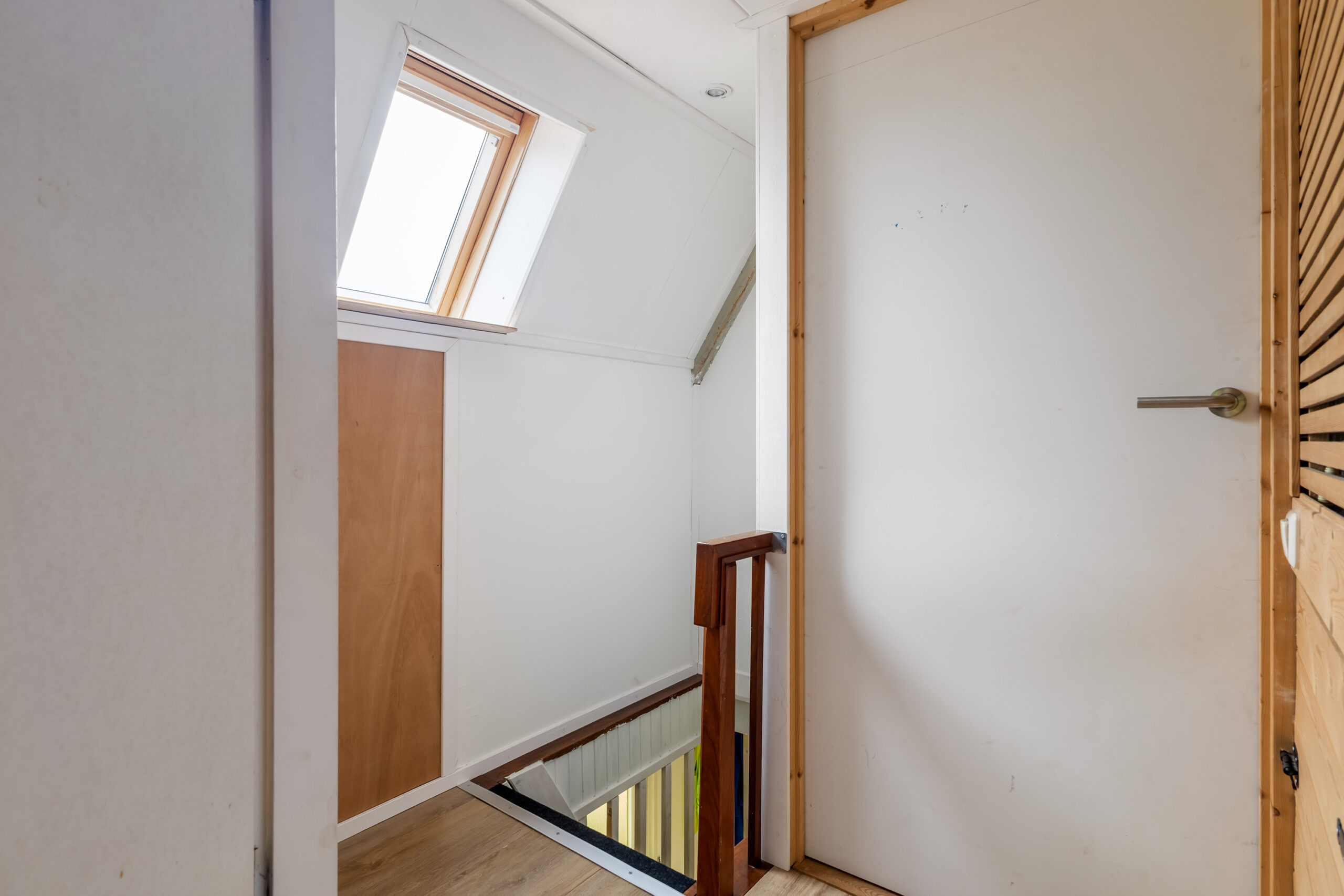 Eerste verdieping: Overloop met bergruimte en twee slaapkamers, waarvan één met toegang tot het platte dak.